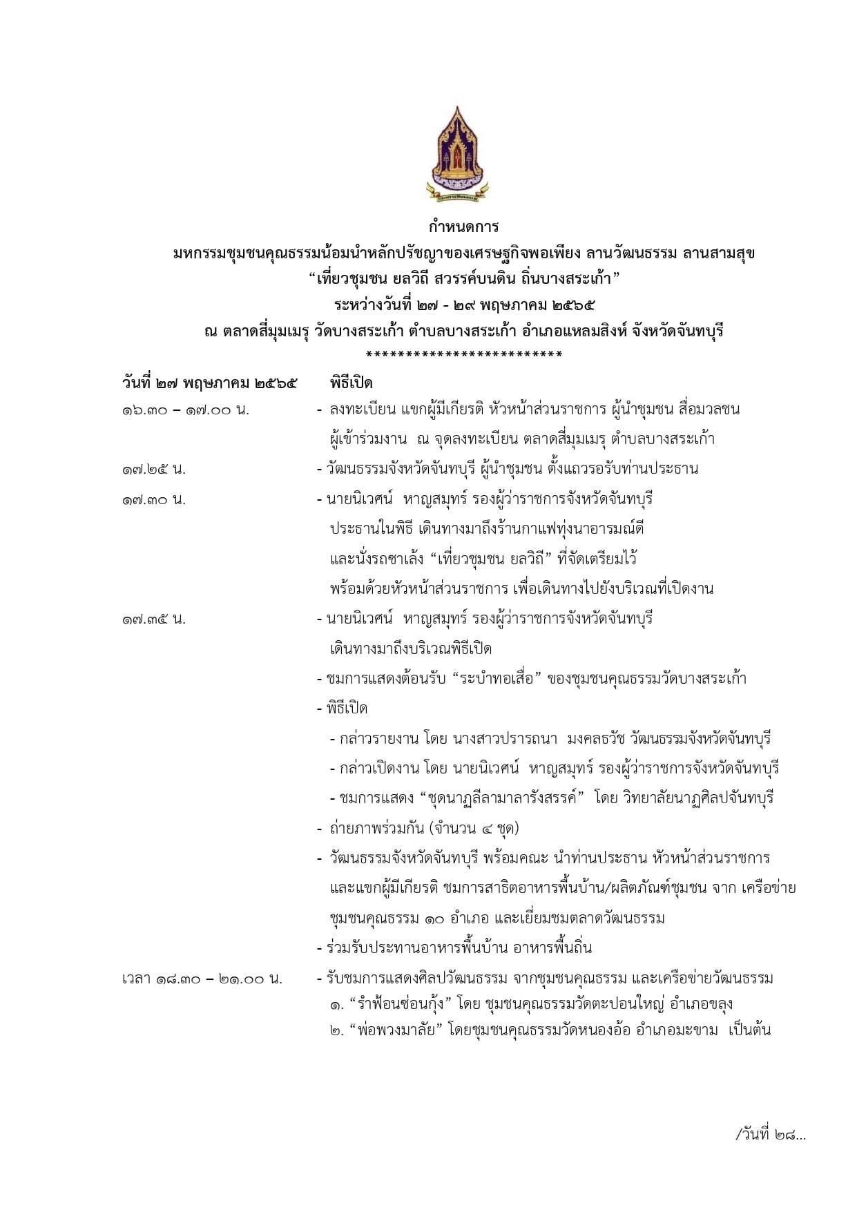 วันศุกร์ที่ 27 พฤษภาคม 2565 นายนิเวศน์ หาญสมุทร์ รองผู้ว่าราชการจังหวัดจันทบุรี เป็นประธานเปิดงานมหกรรมชุมชนฯ โดยนางสาวเมษา ครุปิติ บรรณารักษ์ชำนาญการ รักษาการในตำแหน่งผู้อำนวยการหอสมุดแห่งชาติรัชมังคลาภิเษก จันทบุรี พร้อมด้วยนางสาวสมใจ สาแมว เจ้าพนักงานธุรการชำนาญงาน เข้าร่วมพิธีเปิดด้วย ในงานมหกรรมชุมชนคุณธรรมน้อมนำหลักปรัชญาของเศรษฐกิจพอเพียง ลานวัฒนธรรม ลานสามสุข “เที่ยวชุมชน ยลวิถี สวรรค์บนดิน ถิ่นบางสระเก้า” ณ ตลาดสี่มุมเมรุ วัดบางสระเก้า ตำบลบางสระเก้า อำเภอแหลมสิงห์ จังหวัดจันทบุรี
