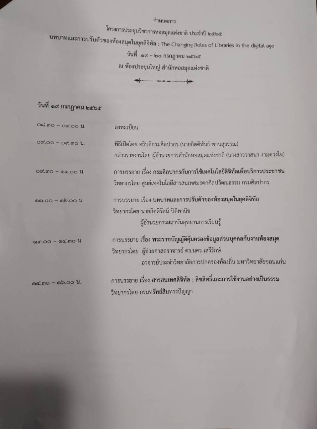 วันที่ 19 กรกฎาคม 2565 เวลา 09.00 น. นายกิตติพันธ์ พานสุวรรณ อธิบดีกรมศิลปากร เป็นประธานในพิธีเปิดโครงการประชุมวิชาการหอสมุดแห่งชาติประจำปี 2565 หัวข้อ “บทบาทและการปรับตัวของห้องสมุดในยุคดิจิทัล” The Changing Roles of Libraries in the digital age มีนางสาววาสนา งามดวงใจ ผู้อำนวยการสำนักหอสมุดแห่งชาติ กล่าวรายงาน ณ ห้องประชุมใหญ่ สำนักหอสมุดแห่งชาติ การประชุมดังกล่าวมีบรรณารักษ์และเจ้าหน้าที่หอสมุดแห่งชาติส่วนกลางและส่วนภูมิภาคเข้าร่วมฟังการบรรยายจากวิทยากร ณ ห้องประชุมใหญ่ สำนักหอสมุดแห่งชาติในวันที่ 19 – 20 กรกฎาคม 2565 ในการนี้นางสาวเมษา ครุปิติ บรรณารักษ์ชำนาญการ รักษาการในตำแห่งผู้อำนวยการหอสมุดแห่งชาติรัชมังคลาภิเษก จันทบุรี ได้เข้าร่วมโครงการประชุมวิชาการหอสมุดแห่งชาติในครั้งนี้ด้วย