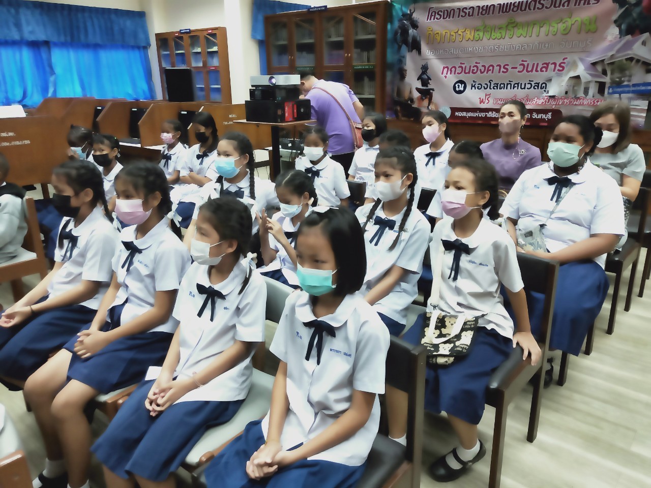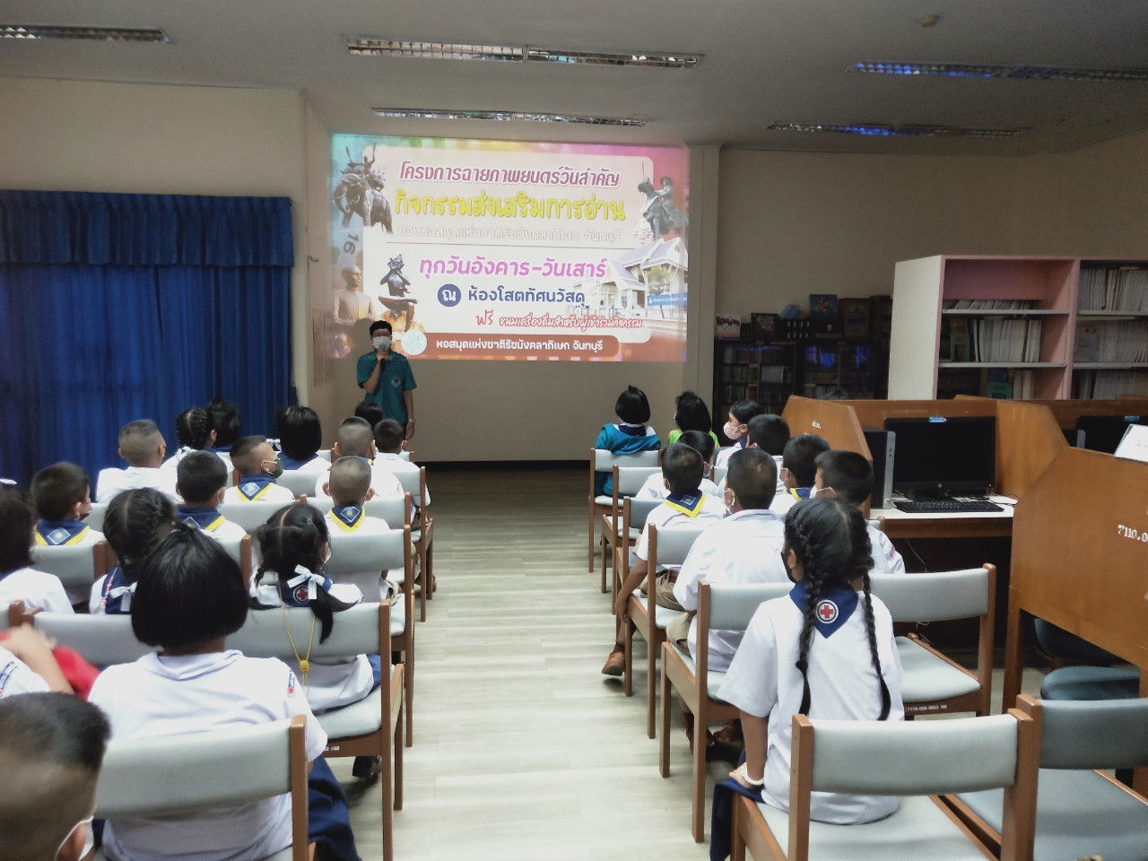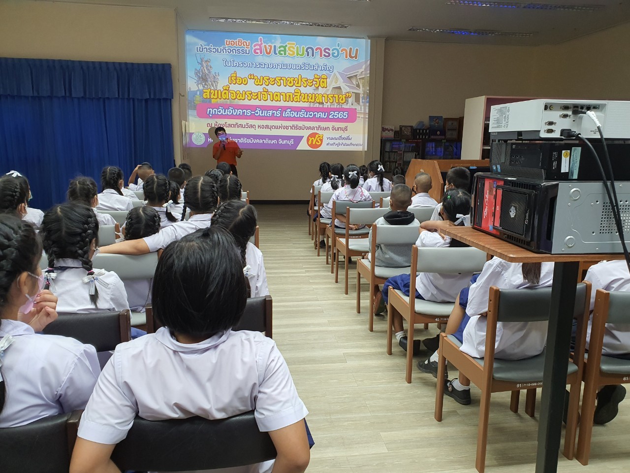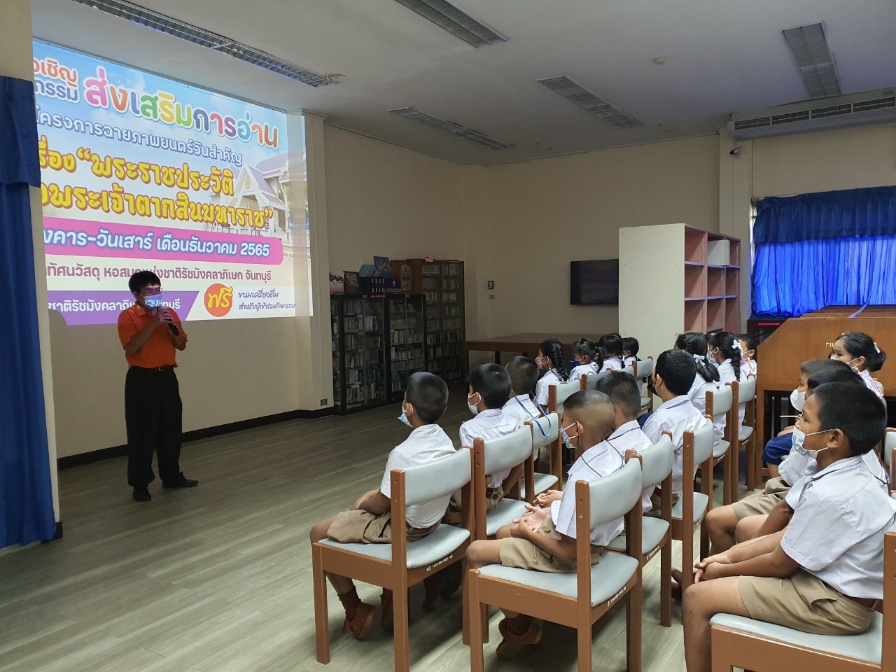 วันพฤหัสบดีที่ 8 ธันวาคม 2565 นางสาวเมษา ครุปิติ บรรณารักษ์ชำนาญการ รักษาการในตำแหน่งผู้อำนวยการหอสมุดแห่งชาติรัชมังคลาภิเษก จันทบุรี ให้การต้อนรับ กล่าววัตถุประสงค์โครงการฉายภาพยนตร์วันสำคัญ และจัดฉายภาพยนตร์ เรื่อง"พระราชประวัติสมเด็จพระเจ้าตากสินมหาราช" เนื่องในวันปราบดาภิเษกเป็นพระมหากษัตริย์ของสมเด็จพระเจ้าตากสินมหาราช ในวันที่ 28 ธันวาคม นายประพนธ์ รอบรู้ นักวิชาการโสตทัศนศึกษาชำนาญการ กล่าวถึงความสำคัญของสมเด็จพระเจ้าตากสินมหาราช ต่อชาวจันทบุรี และรายละเอียดของภาพยนตร์ โดยมีครูและนักเรียน จากโรงเรียนเทศบาลเมืองจันทบุรี 1 ชั้นประถมศึกษาปีที่ 3 และ 4 เข้าร่วมชมภาพยนตร์ในรอบเช้า เวลา 10.00 น. จำนวน 50 คน โดยครูทฤฒมน ขุนสุนทร และครูสุพัตรา มนูสุข เป็นคุณครูผู้ดูแลนักเรียน