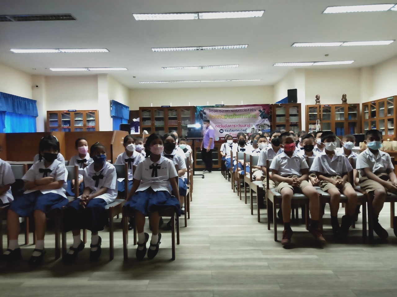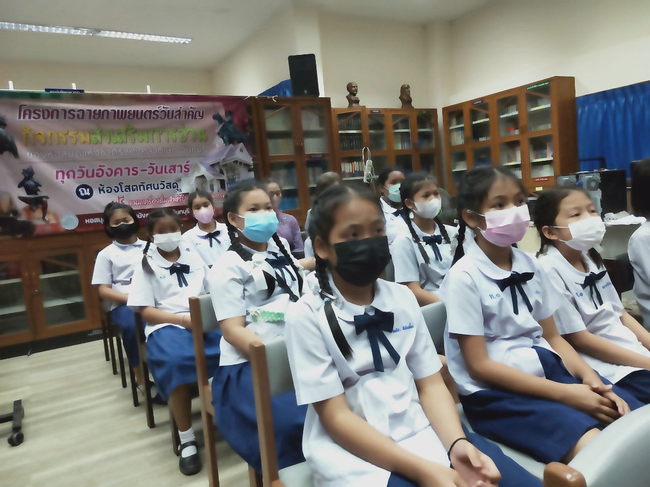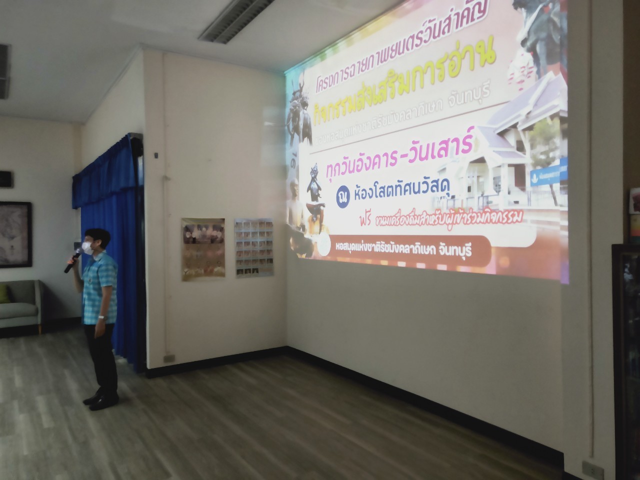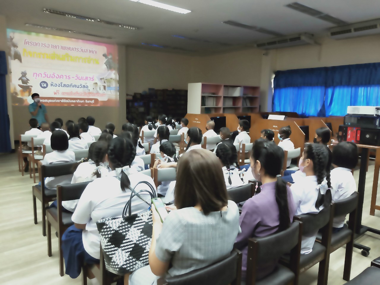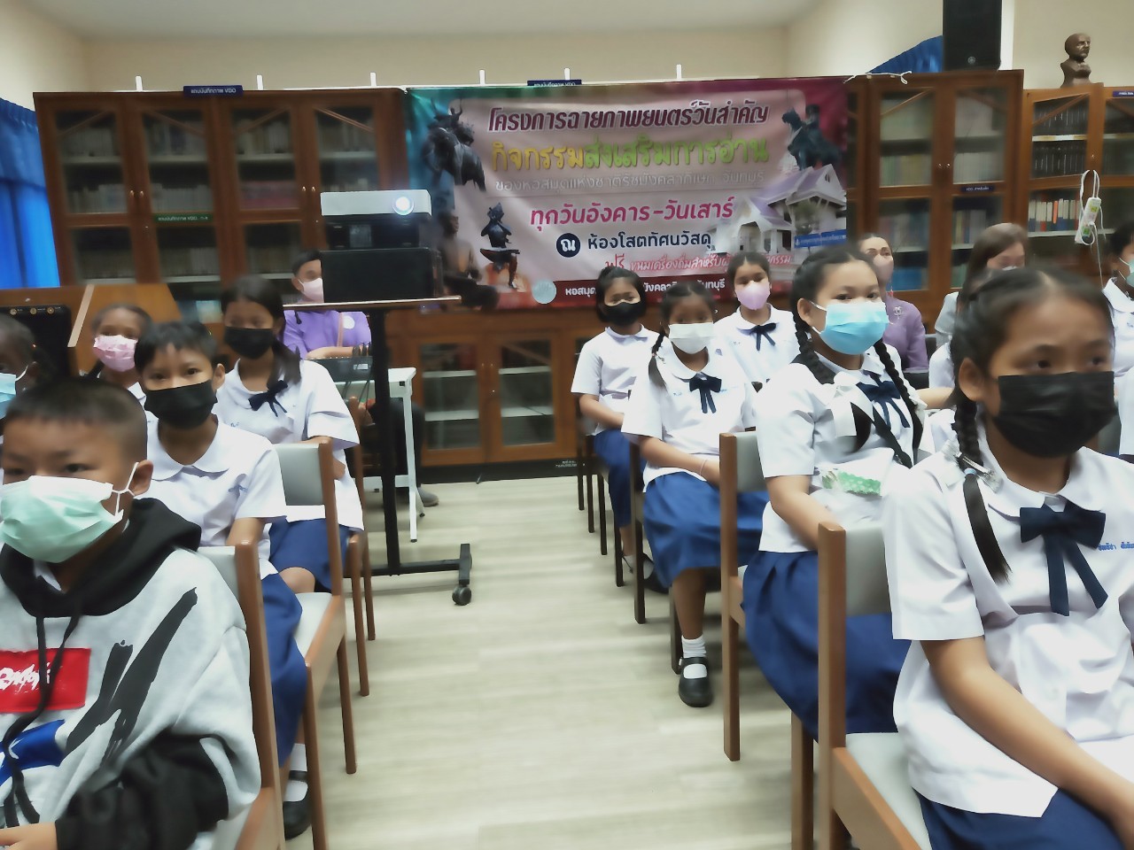 วันพฤหัสบดีที่ 8 ธันวาคม 2565 นางสาวเมษา ครุปิติ บรรณารักษ์ชำนาญการ รักษาการในตำแหน่งผู้อำนวยการหอสมุดแห่งชาติรัชมังคลาภิเษก จันทบุรี ให้การต้อนรับ กล่าววัตถุประสงค์โครงการฉายภาพยนตร์วันสำคัญ และจัดฉายภาพยนตร์ เรื่อง"พระราชประวัติสมเด็จพระเจ้าตากสินมหาราช" เนื่องในวันปราบดาภิเษกเป็นพระมหากษัตริย์ของสมเด็จพระเจ้าตากสินมหาราช ในวันที่ 28 ธันวาคม นายประพนธ์ รอบรู้ นักวิชาการโสตทัศนศึกษาชำนาญการ กล่าวถึงความสำคัญของสมเด็จพระเจ้าตากสินมหาราช ต่อชาวจันทบุรี และรายละเอียดของภาพยนตร์ โดยมีครูและนักเรียน จากโรงเรียนเทศบาลเมืองจันทบุรี 1 ชั้นประถมศึกษาปีที่ 3 และ 4 เข้าร่วมชมภาพยนตร์ในรอบเช้า เวลา 10.00 น. จำนวน 50 คน โดยครูทฤฒมน ขุนสุนทร และครูสุพัตรา มนูสุข เป็นคุณครูผู้ดูแลนักเรียน