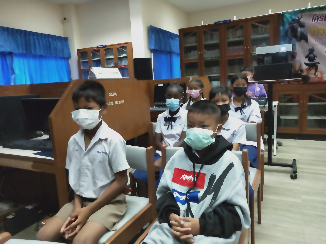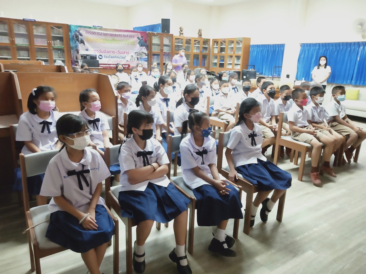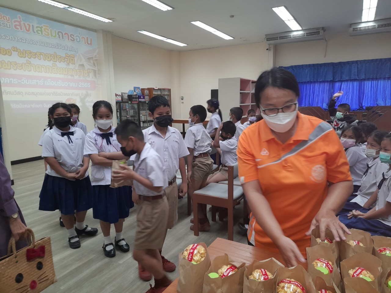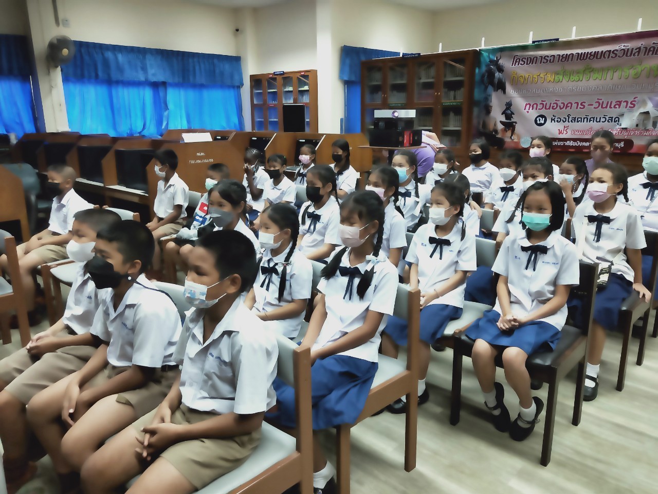วันพฤหัสบดีที่ 8 ธันวาคม 2565 นางสาวเมษา ครุปิติ บรรณารักษ์ชำนาญการ รักษาการในตำแหน่งผู้อำนวยการหอสมุดแห่งชาติรัชมังคลาภิเษก จันทบุรี ให้การต้อนรับ กล่าววัตถุประสงค์โครงการฉายภาพยนตร์วันสำคัญ และจัดฉายภาพยนตร์ เรื่อง"พระราชประวัติสมเด็จพระเจ้าตากสินมหาราช" เนื่องในวันปราบดาภิเษกเป็นพระมหากษัตริย์ของสมเด็จพระเจ้าตากสินมหาราช ในวันที่ 28 ธันวาคม นายประพนธ์ รอบรู้ นักวิชาการโสตทัศนศึกษาชำนาญการ กล่าวถึงความสำคัญของสมเด็จพระเจ้าตากสินมหาราช ต่อชาวจันทบุรี และรายละเอียดของภาพยนตร์ โดยมีครูและนักเรียน จากโรงเรียนเทศบาลเมืองจันทบุรี 1 ชั้นประถมศึกษาปีที่ 3 และ 4 เข้าร่วมชมภาพยนตร์ในรอบเช้า เวลา 10.00 น. จำนวน 50 คน โดยครูทฤฒมน ขุนสุนทร และครูสุพัตรา มนูสุข เป็นคุณครูผู้ดูแลนักเรียน