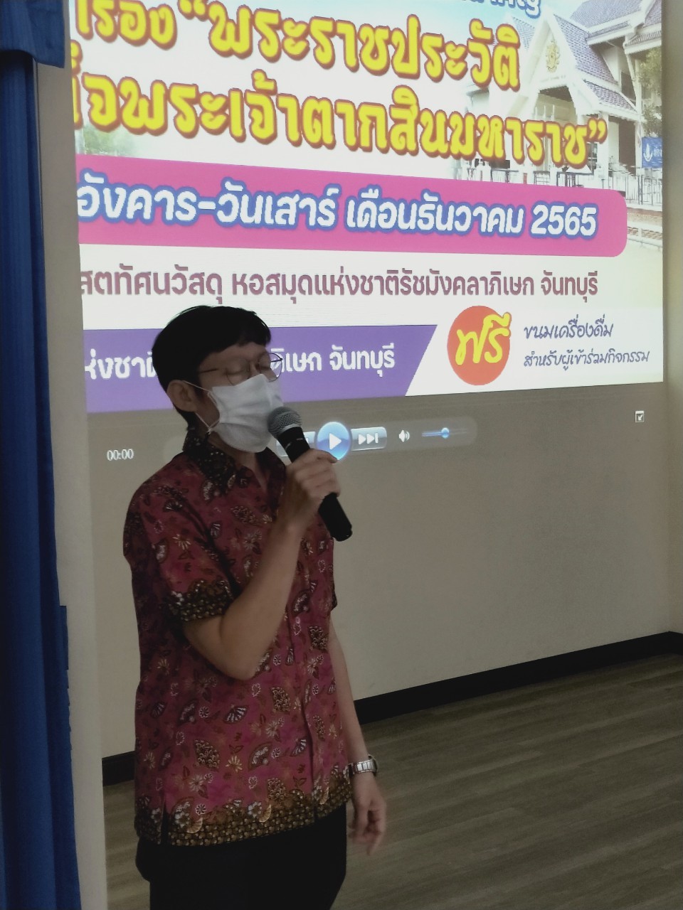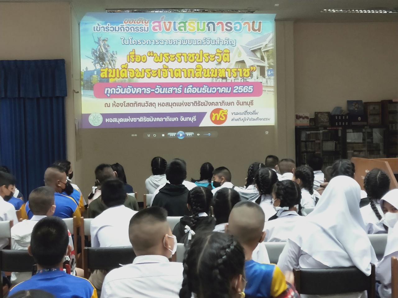 วันอังคารที่ 13 ธันวาคม 2565 นางสาวเมษา ครุปิติ บรรณารักษ์ชำนาญการ รักษาการในตำแหน่งผู้อำนวยการหอสมุดแห่งชาติรัชมังคลาภิเษก จันทบุรี ให้การต้อนรับ กล่าววัตถุประสงค์โครงการฉายภาพยนตร์วันสำคัญ และจัดฉายภาพยนตร์ เรื่อง"พระราชประวัติสมเด็จพระเจ้าตากสินมหาราช" เนื่องในวันปราบดาภิเษกเป็นพระมหากษัตริย์ของสมเด็จพระเจ้าตากสินมหาราช ในวันที่ 28 ธันวาคม นายประพนธ์ รอบรู้ นักวิชาการโสตทัศนศึกษาชำนาญการ กล่าวถึงความสำคัญของสมเด็จพระเจ้าตากสินมหาราช ต่อชาวจันทบุรี และรายละเอียดของภาพยนตร์ โดยมีครูและนักเรียน จากโรงเรียนเทศบาลเมืองจันทบุรี 1 ชั้นประถมศึกษาปีที่ 6 เข้าร่วมชมภาพยนตร์ในรอบเช้า เวลา 10.00 น. จำนวน 51 คน และ รอบบ่าย เวลา 14.00 น. จำนวน 50 คน