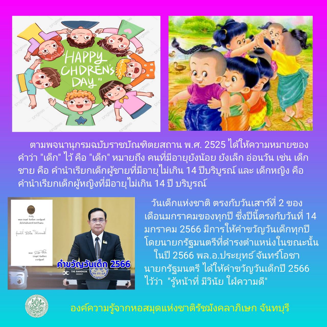 วันเด็กแห่งชาติ ตรงกับวันเสาร์ที่ 2 ของเดือนมกราคมของทุกปี ซึ่งปีนี้ตรงกับวันที่ 14 มกราคม 2566 มีการให้ คำขวัญวันเด็กทุกปี โดยนายกรัฐมนตรีที่ดำรงตำแหน่งในขณะนั้น ในปี 2566 พล.อ.ประยุทธ์ จันทร์โอชา นายกรัฐมนตรี ได้ให้คำขวัญวันเด็กปี 2566 ไว้ว่า "รู้หน้าที่ มีวินัย ใฝ่ความดี"