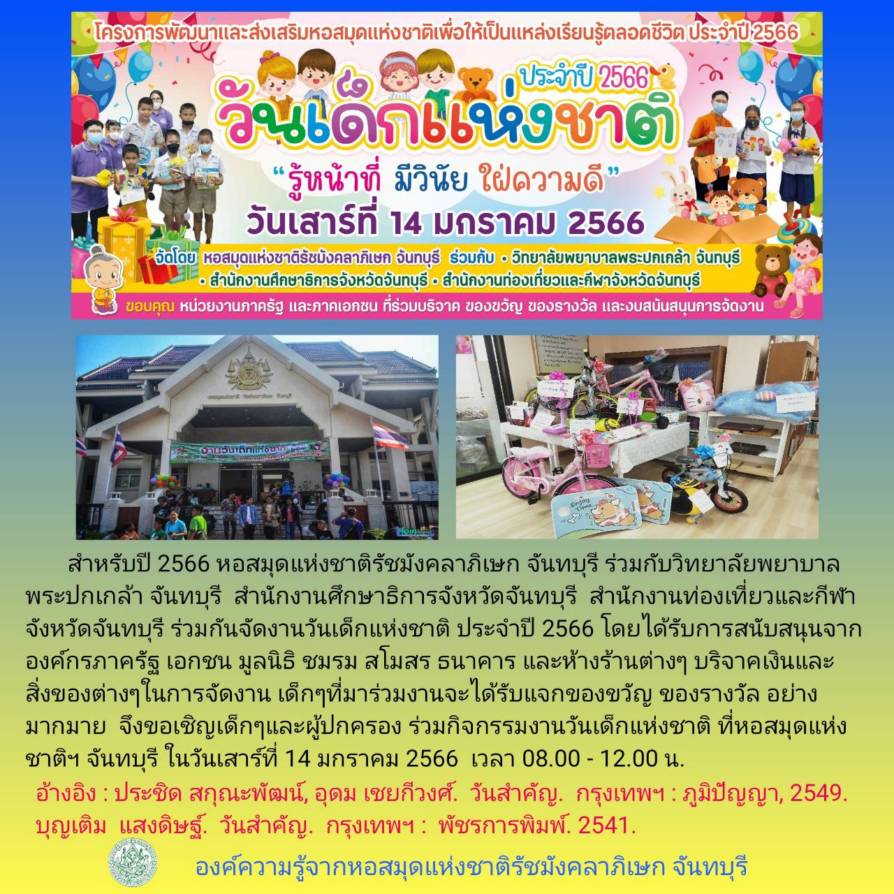 สำหรับปี 2566 หอสมุดแห่งชาติรัชมังคลาภิเษก จันทบุรี ร่วมกับวิทยาลัยพยาบาลพระปกเกล้า จันทบุรี สำนักงานศึกษาธิการจังหวัดจันทบุรี สำนักงานท่องเที่ยวและกีฬา จังหวัดจันทบุรี ร่วมกันจัดงานวันเด็กแห่งชาติ ประจำปี 2566 โดยได้รับการสนับสนุนจากองค์กรภาครัฐ เอกชน มูลนิธิ ชมรม สโมสร ธนาคาร และห้างร้านต่างๆ บริจาคเงินและสิ่งของต่างๆในการจัดงาน เด็กๆที่มาร่วมงานจะได้รับแจกของขวัญ ของรางวัล อย่างมากมาย จึงขอเชิญเด็กๆและผู้ปกครอง ร่วมกิจกรรมงานวันเด็กแห่งชาติ ที่หอสมุดแห่งชาติฯ จันทบุรี ในวันเสาร์ที่ 14 มกราคม 2566 เวลา 08.00 อ- 12.00 น.