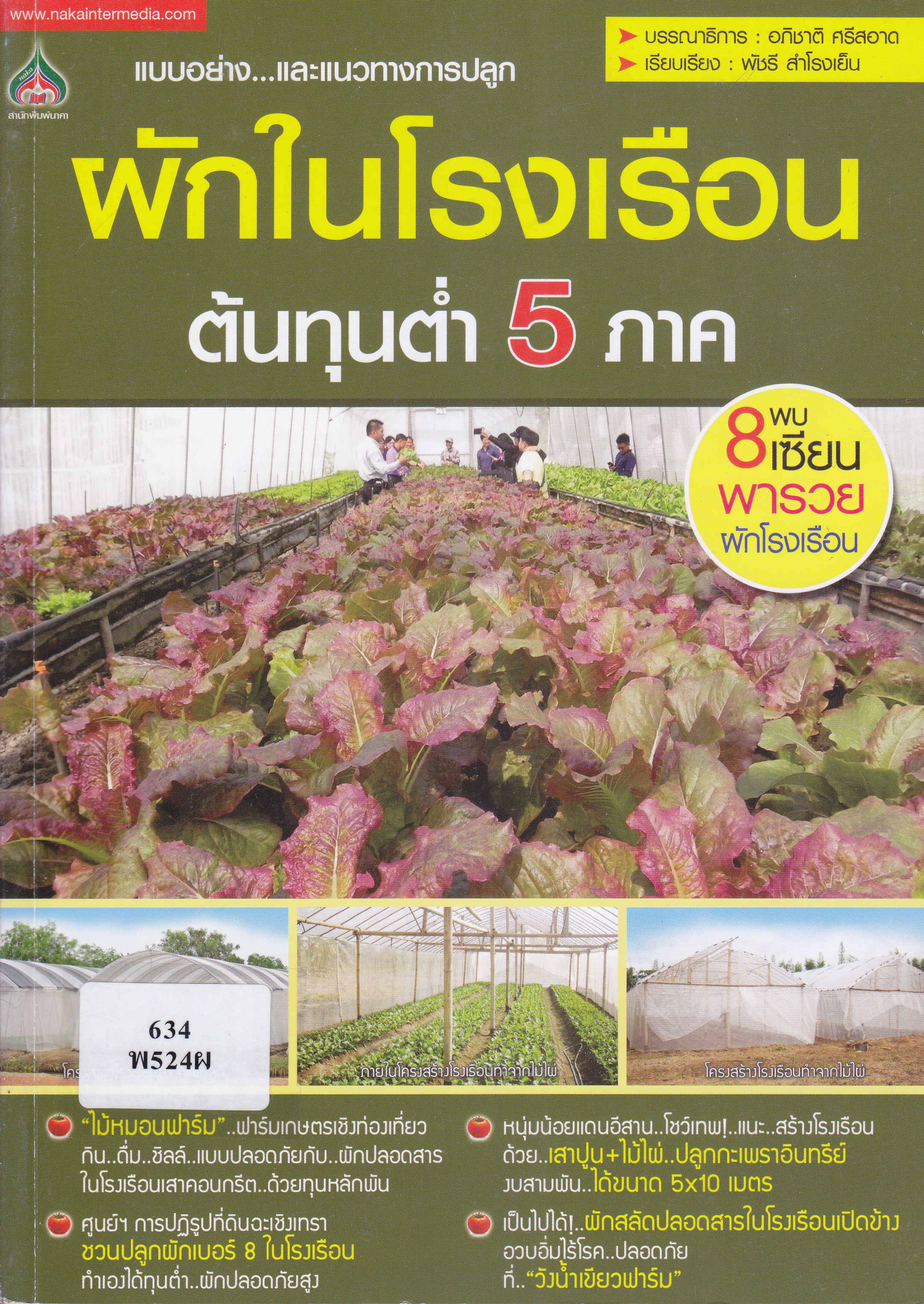 พัชรี สำโรงเย็น. ผักในโรงเรือน ต้นทุ่นต่ำ 5 ภาค. กรุงเทพฯ: นาคา อินเตอร์มีเดีย, 2559. 140 หน้า. ภาพประกอบ. 155 บาท.