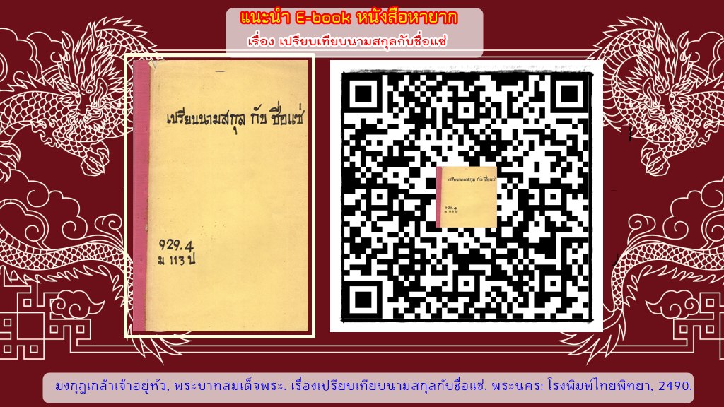 แนะนำ E-book หนังสือหายาก เรื่อง เปรียบเทียบนามสกุลกับชื่อแซ่