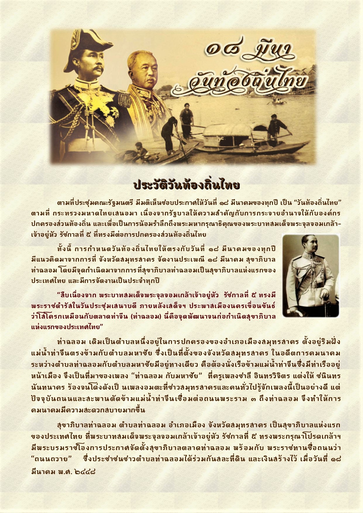 ทางคณะรัฐมนตรี จึงมีมติในวันที่ 22 มิถุนายน 2553 ประกาศให้ วันที่ 18 มีนาคมของทุกปี เป็นวันท้องถิ่นไทย โดยจังหวัดสมุทรสาคร จะมีการจัดงานประเพณี 18 มีนาคม สุขาภิบาลท่าฉลอม เป็นประจำทุกปี พร้อมๆ กับหลายจังหวัด ในปี พ.ศ. 2440 (ร.ศ. 116) สุขาภิบาลแห่งแรกของไทยได้รับการจัดตั้งขึ้นในเขตกรุงเทพมหานครเรียกว่า "สุขาภิบาลกรุงเทพ" โดยพระบาทสมเด็จพระจุลจอมเกล้าเจ้าอยู่หัว ทรงพระกรุณาโปรดเกล้าฯ ให้ประกาศใช้พระราชกำหนดสุขาภิบาลกรุงเทพฯ ร.ศ. 116 ขึ้น โดยผู้บริหารสุขาภิบาลกรุงเทพ ไม่ได้มาจากการเลือกตั้ง แต่อยู่ในบังคับบัญชาของเสนาบดีกระทรวงนครบาล ตามที่ทรงทอดพระเนตรมาจากการเสด็จประพาสต่างประเทศ