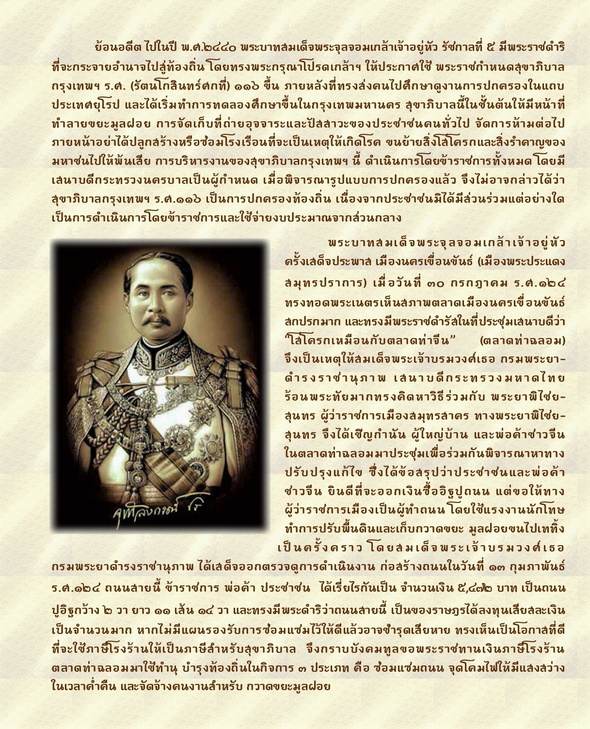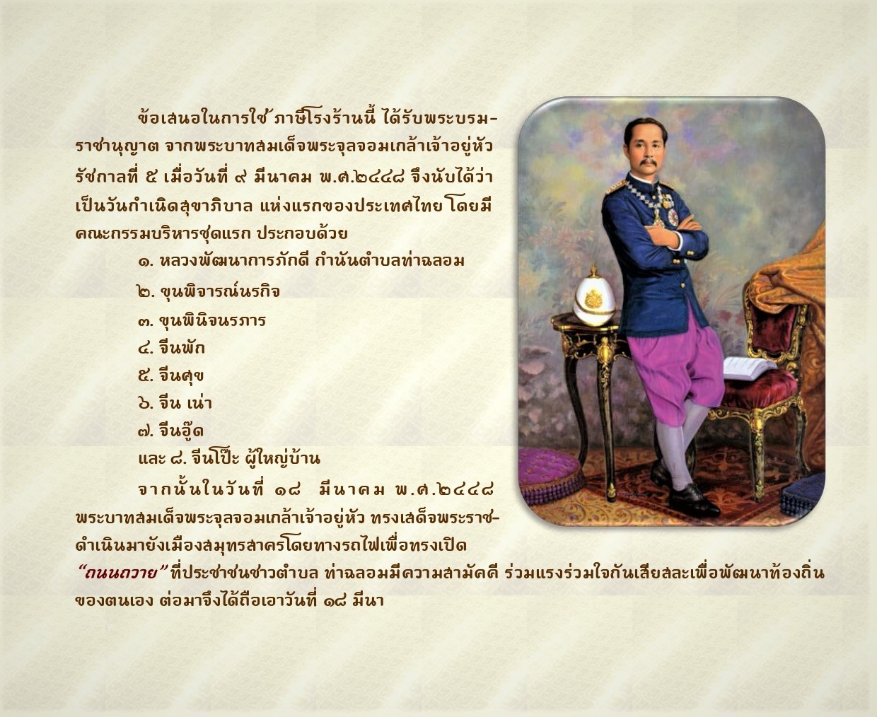 จากพระมหากรุณาธิคุณของ พระบาทสมเด็จพระจุลจอมเกล้าเจ้าอยู่หัว รัชกาลที่ 5 ที่ทรงพระกรุณาโปรดเกล้าฯ ให้ยกฐานะตำบลท่าฉลอมเป็น "สุขาภิบาลท่าฉลอม" ในวันที่ 18 มีนาคม 2448 (ร.ศ. 124) ซึ่งถือเป็นจุดเริ่มต้นของการกระจายอำนาจการปกครองให้ประชาชนในท้องถิ่นได้มีส่วนร่วมอย่างแท้จริง อันนำไปสู่การวางรากฐานการปกครองระบอบประชาธิปไตย