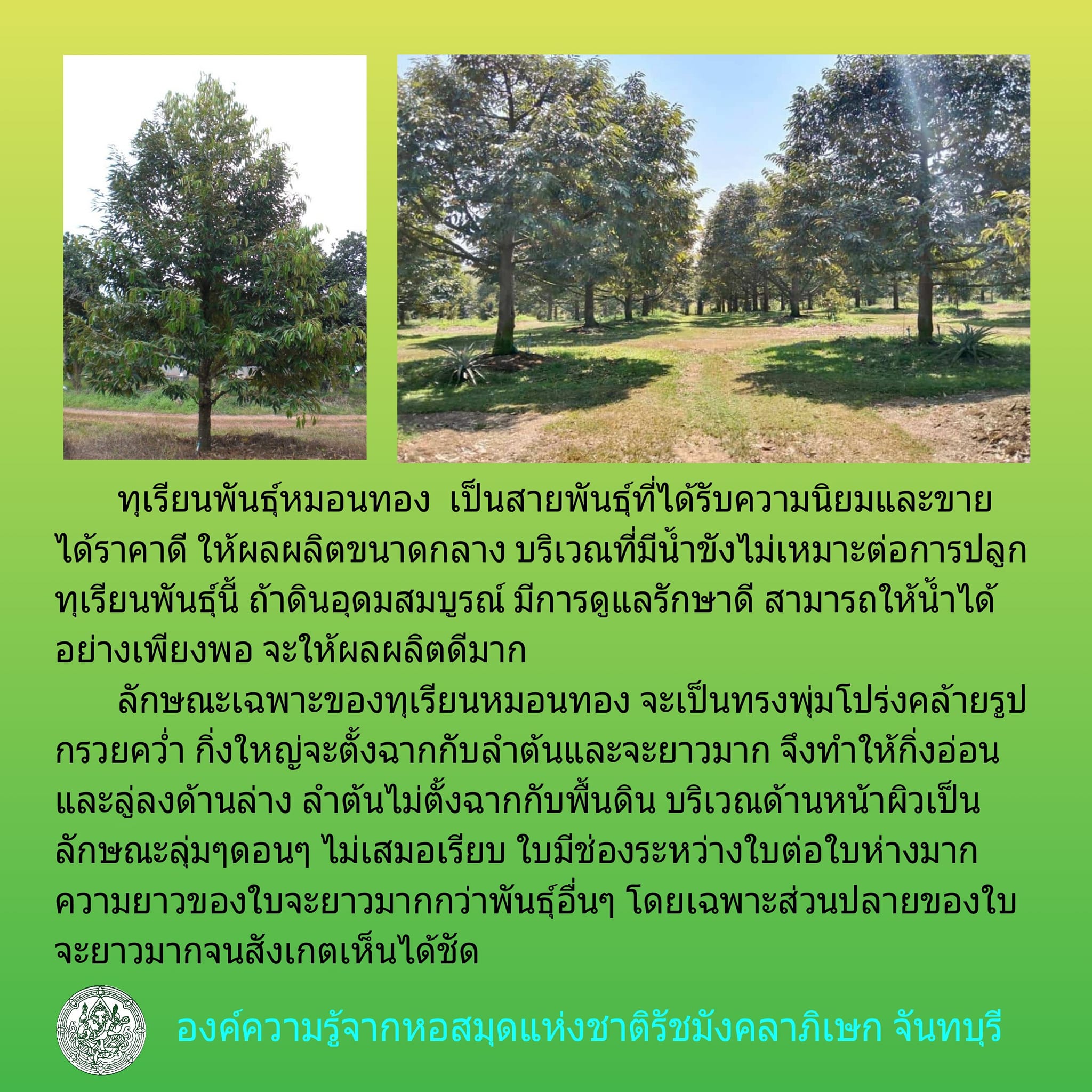 ทุเรียนพันธุ์หมอนทอง เป็นสายพันธุ์ที่ได้รับความนิยมและขายได้ราคาดี ให้ผลผลิตขนาดกลาง บริเวณที่มีน้ำขังไม่เหมาะต่อการปลูกทุเรียนพันธุ์นี้ ถ้าดินอุดมสมบูรณ์ มีการดูแลรักษาดี สามารถให้น้ำได้อย่างเพียงพอ จะให้ผลผลิตดีมาก ลักษณะเฉพาะของทุเรียนหมอนทอง จะเป็นทรงพุ่มโปร่งคล้ายรูปกรวยคว่ำ กิ่งใหญ่จะตั้งฉากกับลำต้นและจะยาวมาก จึงทำให้กิ่งอ่อนและลู่ลงด้านล่าง ลำต้นไม่ตั้งฉากกับพื้นดิน บริเวณด้านหน้าผิวเป็นลักษณะลุ่มๆดอนๆ ไม่เสมอเรียบ ใบมีช่องระหว่างใบต่อใบห่างมาก ความยาวของใบจะยาวมากกว่าพันธุ์อื่นๆ โดยเฉพาะส่วนปลายของใบจะยาวมากจนสังเกตเห็นได้ชัด