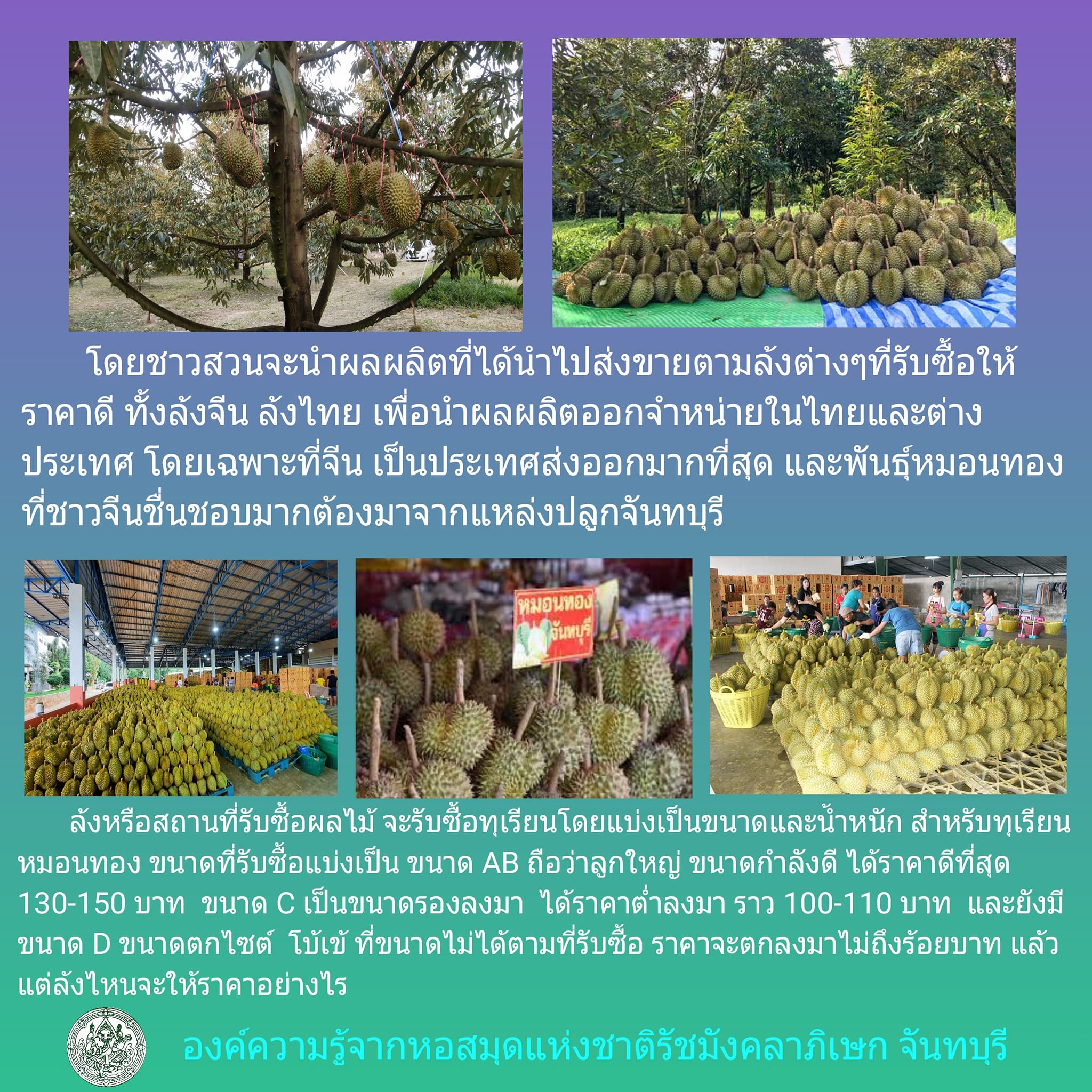 โดยชาวสวนจะนำผลผลิตที่ได้นำไปส่งขายตามล้งต่างๆที่รับซื้อให้ราคาดี ทั้งล้งจีน ล้งไทย เพื่อนำผลผลิตออกจำหน่ายในไทยและต่างประเทศ โดยเฉพาะที่จีน เป็นประเทศส่งออกมากที่สุด และพันธุ์หมอนทองที่ชาวจีนชื่นชอบมากต้องมาจากแหล่งปลูกจันทบุรี