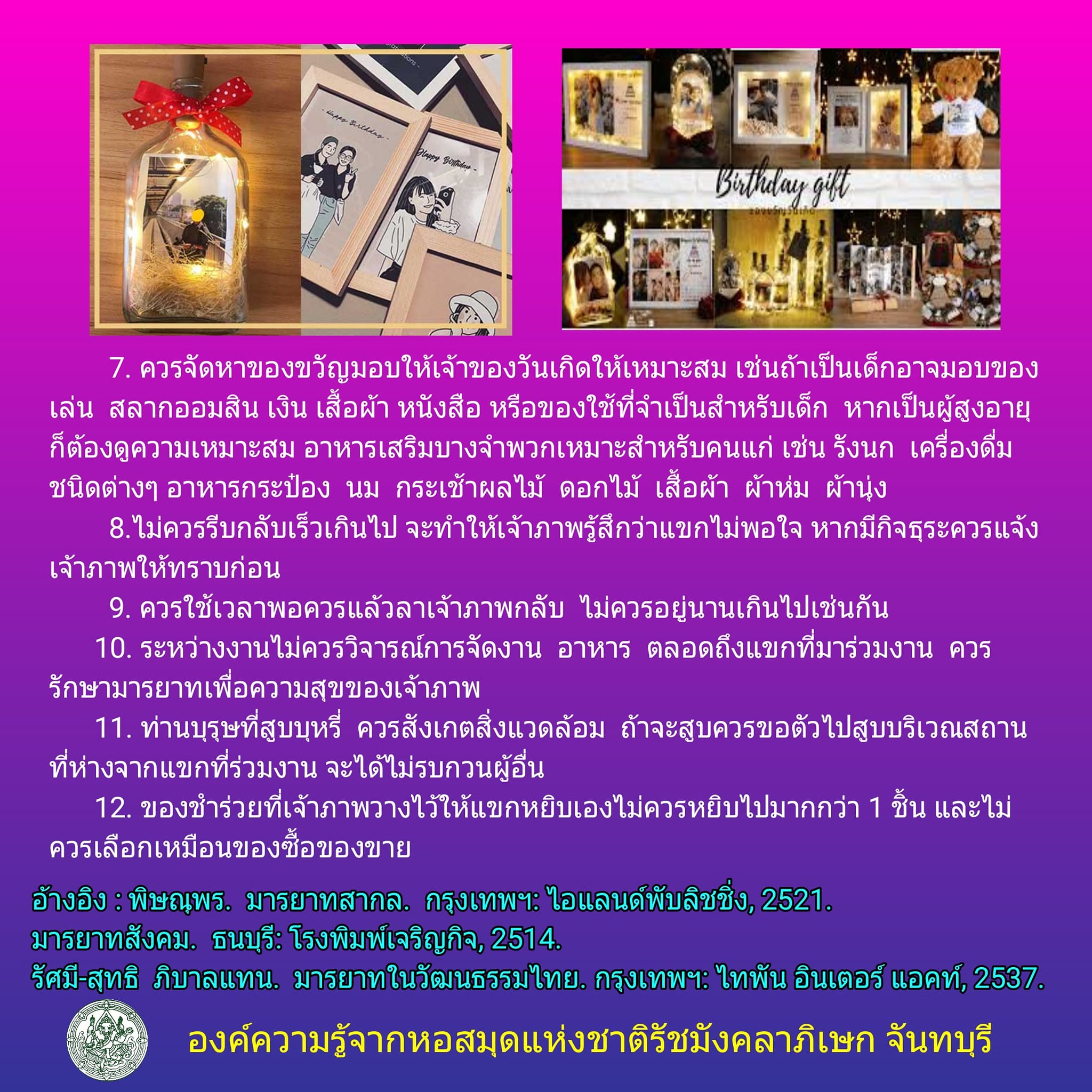 7. ควรจัดหาของขวัญมอบให้เจ้าของวันเกิดให้เหมาะสม เช่นถ้าเป็นเด็กอาจมอบของเล่น สลากออมสิน เงิน เสื้อผ้า หนังสือ หรือของใช้ที่จำเป็นสำหรับเด็ก หากเป็นผู้สูงอายุก็ต้องดูความเหมาะสม อาหารเสริมบางจำพวกเหมาะสำหรับคนแก่ เช่น รังนก เครื่องดื่มชนิดต่างๆ อาหารกระป๋อง นม กระเช้าผลไม้ ดอกไม้ เสื้อผ้า ผ้าห่ม ผ้านุ่ง