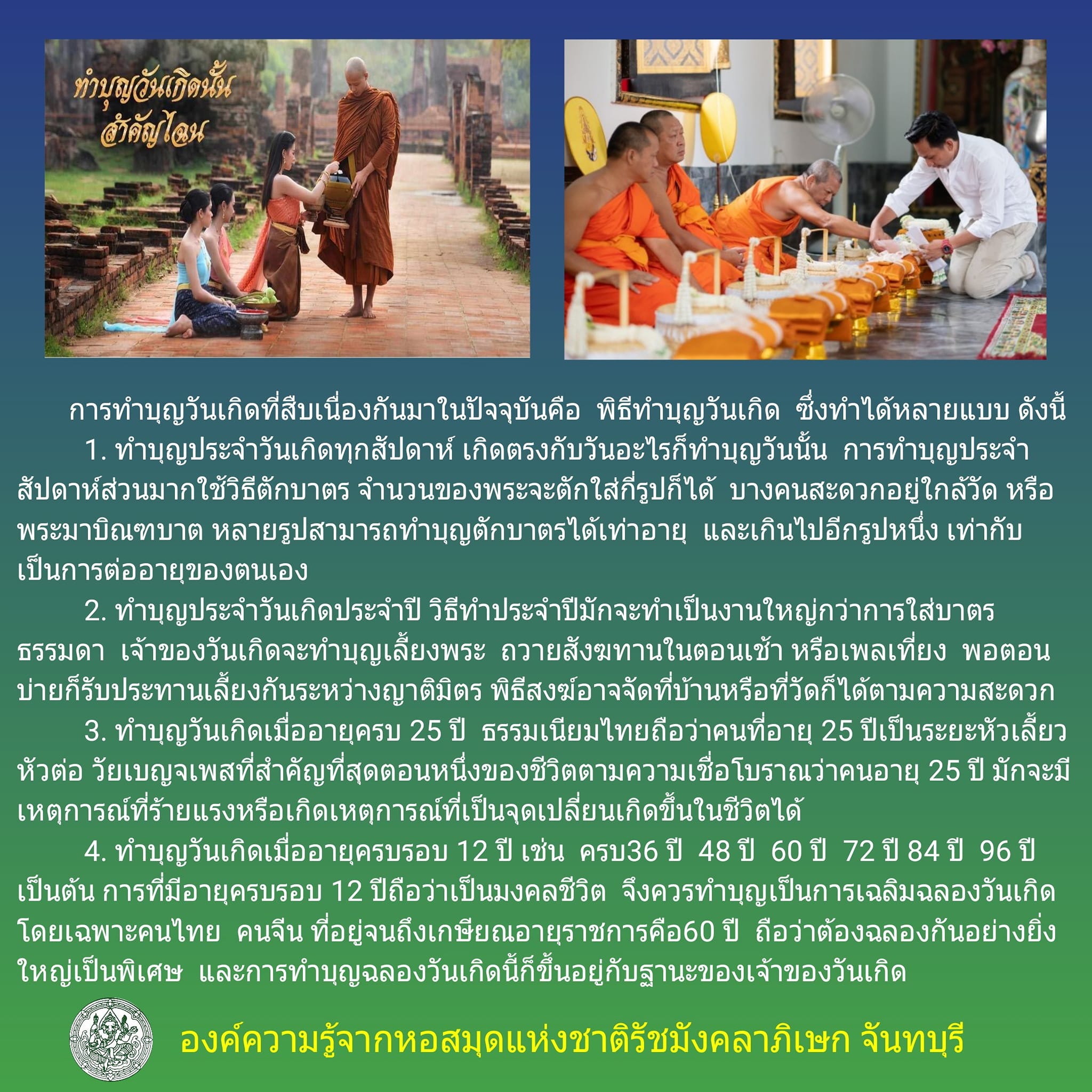 3. ทำบุญวันเกิดเมื่ออายุครบ 25 ปี ธรรมเนียมไทยถือว่าคนที่อายุ 25 ปีเป็นระยะหัวเลี้ยวหัวต่อ วัยเบญจเพสที่สำคัญที่สุดตอนหนึ่งของชีวิตตามความเชื่อโบราณว่าคนอายุ 25 ปี มักจะมีเหตุการณ์ที่ร้ายแรงหรือเกิดเหตุการณ์ที่เป็นจุดเปลี่ยนเกิดขึ้นในชีวิตได้