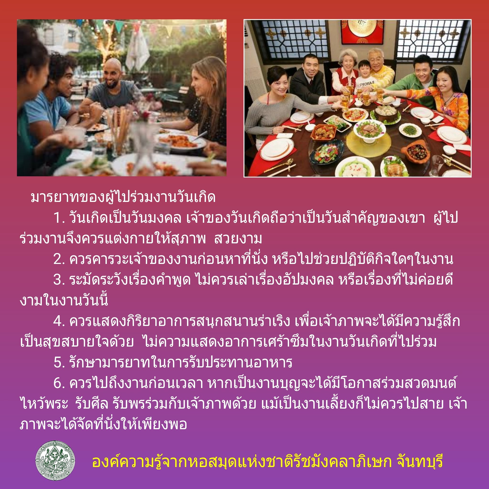 2. ควรคารวะเจ้าของงานก่อนหาที่นั่ง หรือไปช่วยปฏิบัติกิจใดๆในงาน