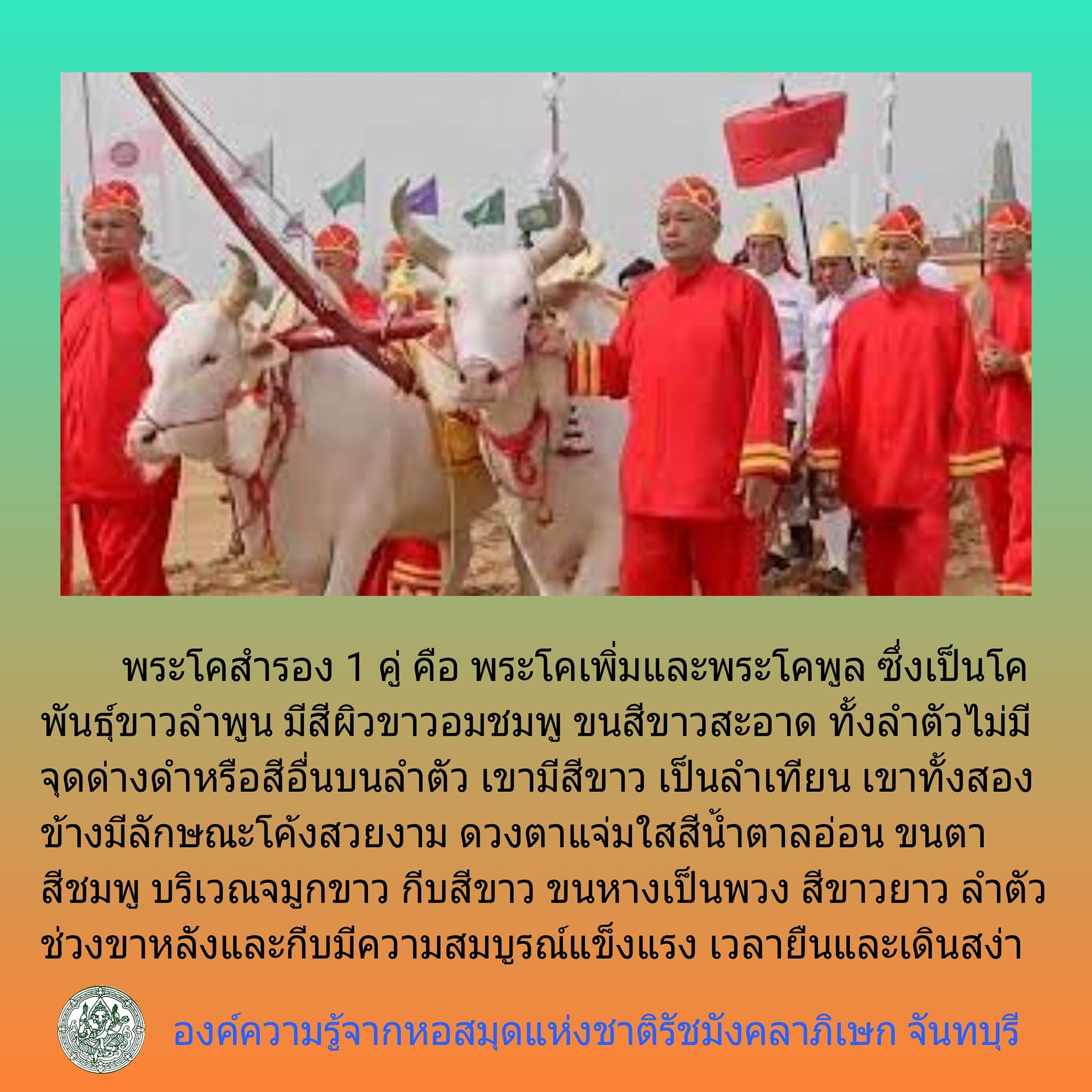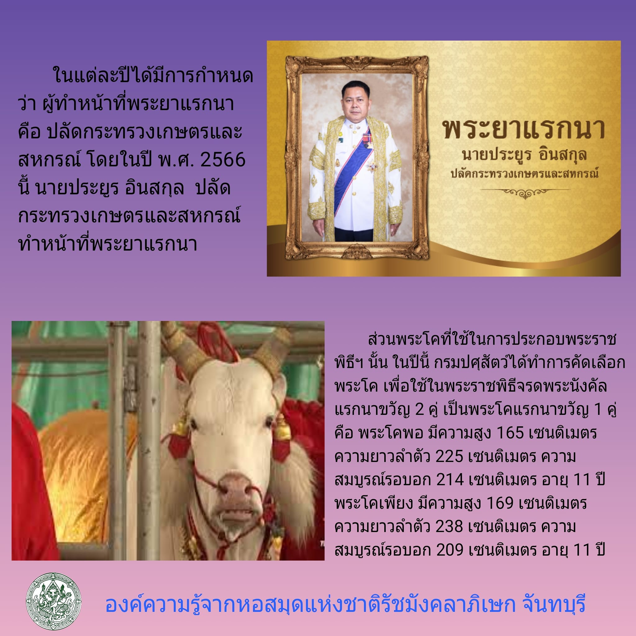 ส่วนพระโคที่ใช้ในการประกอบพระราชพิธีฯ นั้น ในปีนี้ กรมปศุสัตว์ได้ทำการคัดเลือกพระโค เพื่อใช้ในพระราชพิธีจรดพระนังคัลแรกนาขวัญ 2 คู่ เป็นพระโคแรกนาขวัญ 1 คู่ คือ พระโคพอ มีความสูง 165 เซนติเมตร ความยาวลำตัว 225 เซนติเมตร ความสมบูรณ์รอบอก 214 เซนติเมตร อายุ 11 ปี พระโคเพียง มีความสูง 169 เซนติเมตร ความยาวลำตัว 238 เซนติเมตร ความสมบูรณ์รอบอก 209 เซนติเมตร อายุ 11 ปี