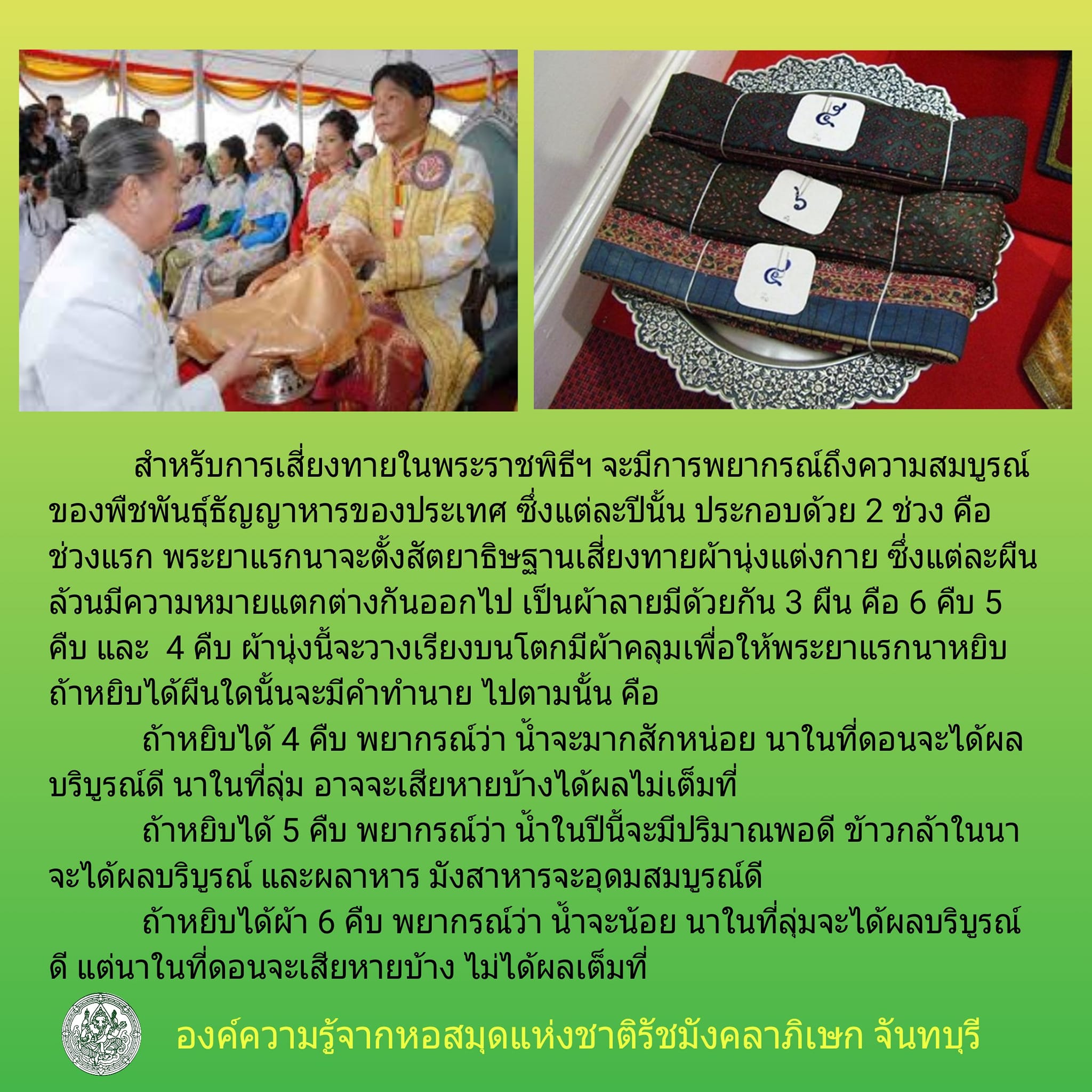 ถ้าหยิบได้ 5 คืบ พยากรณ์ว่า น้ำในปีนี้จะมีปริมาณพอดี ข้าวกล้าในนา จะได้ผลบริบูรณ์ และผลาหาร มังสาหารจะอุดมสมบูรณ์ดี