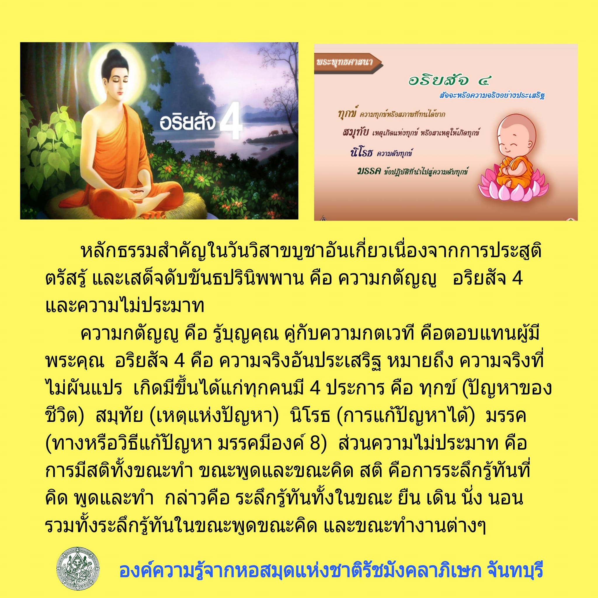 หลักธรรมสำคัญในวันวิสาขบูชาอันเกี่ยวเนื่องจากการประสูติ ตรัสรู้ และเสด็จดับขันธปรินิพพาน คือ ความกตัญญู อริยสัจ 4 และความไม่ประมาท