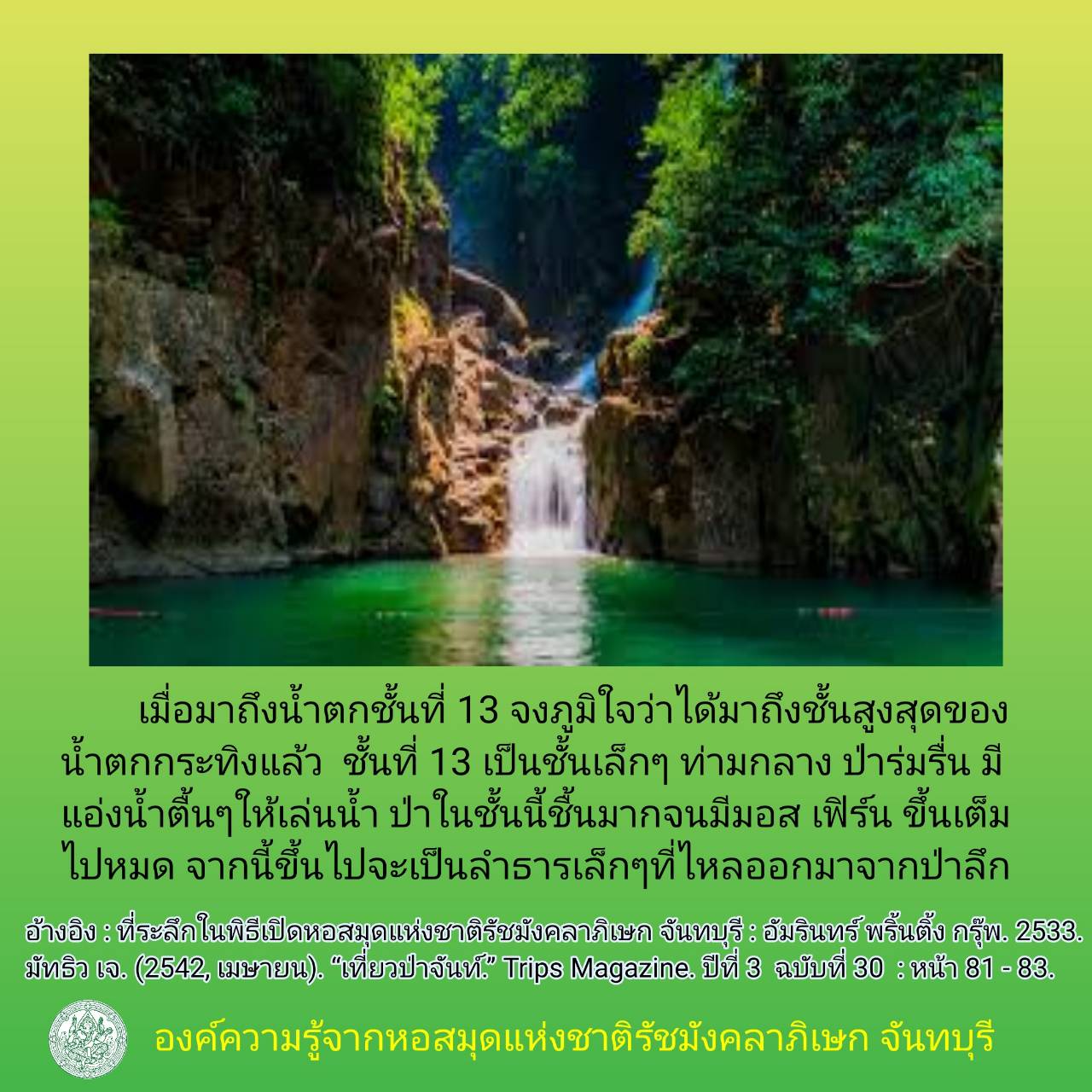 เมื่อมาถึงน้ำตกชั้นที่ 13 จงภูมิใจว่าได้มาถึงชั้นสูงสุดของน้ำตกกระทิงแล้ว ชั้นที่ 13 เป็นชั้นเล็กๆ ท่ามกลาง ป่าร่มรื่น มีแอ่งน้ำตื้นๆให้เล่นน้ำ ป่าในชั้นนี้ชื้นมากจนมีมอส เฟิร์น ขึ้นเต็มไปหมด จากนี้ขึ้นไปจะเป็นลำธารเล็กๆที่ไหลออกมาจากป่าลึก