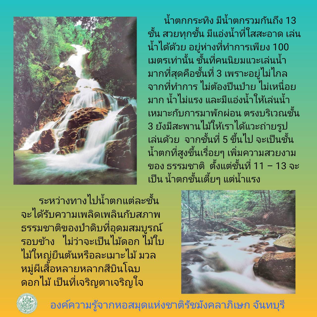 น้ำตกกระทิง มีน้ำตกรวมกันถึง 13 ชั้น สวยทุกชั้น มีแอ่งน้ำที่ใสสะอาด เล่นน้ำได้ด้วย อยู่ห่างที่ทำการเพียง 100 เมตรเท่านั้น ชั้นที่คนนิยมแวะเล่นน้ำมากที่สุดคือชั้นที่ 3 เพราะอยู่ไม่ไกลจากที่ทำการ ไม่ต้องปีนป่าย ไม่เหนื่อยมาก น้ำไม่แรง และมีแอ่งน้ำให้เล่นน้ำ เหมาะกับการมาพักผ่อน ตรงบริเวณชั้น 3 ยังมีสะพานไม้ให้เราได้แวะถ่ายรูปเล่นด้วย จากชั้นที่ 5 ขึ้นไป จะเป็นชั้นน้ำตกที่สูงขึ้นเรื่อยๆ เพิ่มความสวยงามของ ธรรมชาติ ตั้งแต่ชั้นที่ 11 – 13 จะเป็น น้ำตกชั้นเตี้ยๆ แต่น้ำแรง