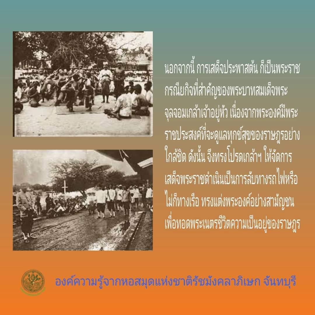 นอกจากนี้ การเสด็จประพาสต้น ก็เป็นพระราชกรณียกิจที่สำคัญของพระบาทสมเด็จพระจุลจอมเกล้าเจ้าอยู่หัว เนื่องจากพระองค์มีพระราชประสงค์ที่จะดูแลทุกข์สุขของราษฎรอย่างใกล้ชิด ดังนั้น จึงทรงโปรดเกล้าฯ ให้จัดการเสด็จพระราชดำเนินเป็นการลับทางรถไฟหรือไม่ก็ทางเรือ ทรงแต่งพระองค์อย่างสามัญชน เพื่อทอดพระเนตรชีวิตความเป็นอยู่ของราษฎร