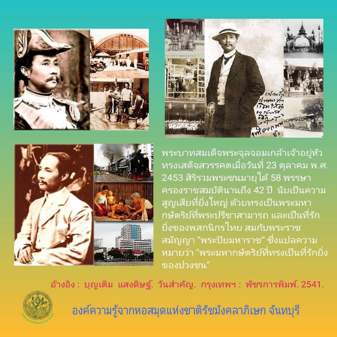 พระบาทสมเด็จพระจุลจอมเกล้าเจ้าอยู่หัว ทรงเสด็จสวรรคตเมื่อวันที่ 23 ตุลาคม พ.ศ. 2453 สิริรวมพระชนมายุได้ 58 พรรษา ครองราชสมบัตินานถึง 42 ปี นับเป็นความสูญเสียที่ยิ่งใหญ่ ด้วยทรงเป็นพระมหากษัตริย์ที่พระปรีชาสามารถ และเป็นที่รักยิ่งของพสกนิกรไทย สมกับพระราชสมัญญา "พระปิยมหาราช” ซึ่งแปลความหมายว่า "พระมหากษัตริย์ที่ทรงเป็นที่รักยิ่งของปวงชน”