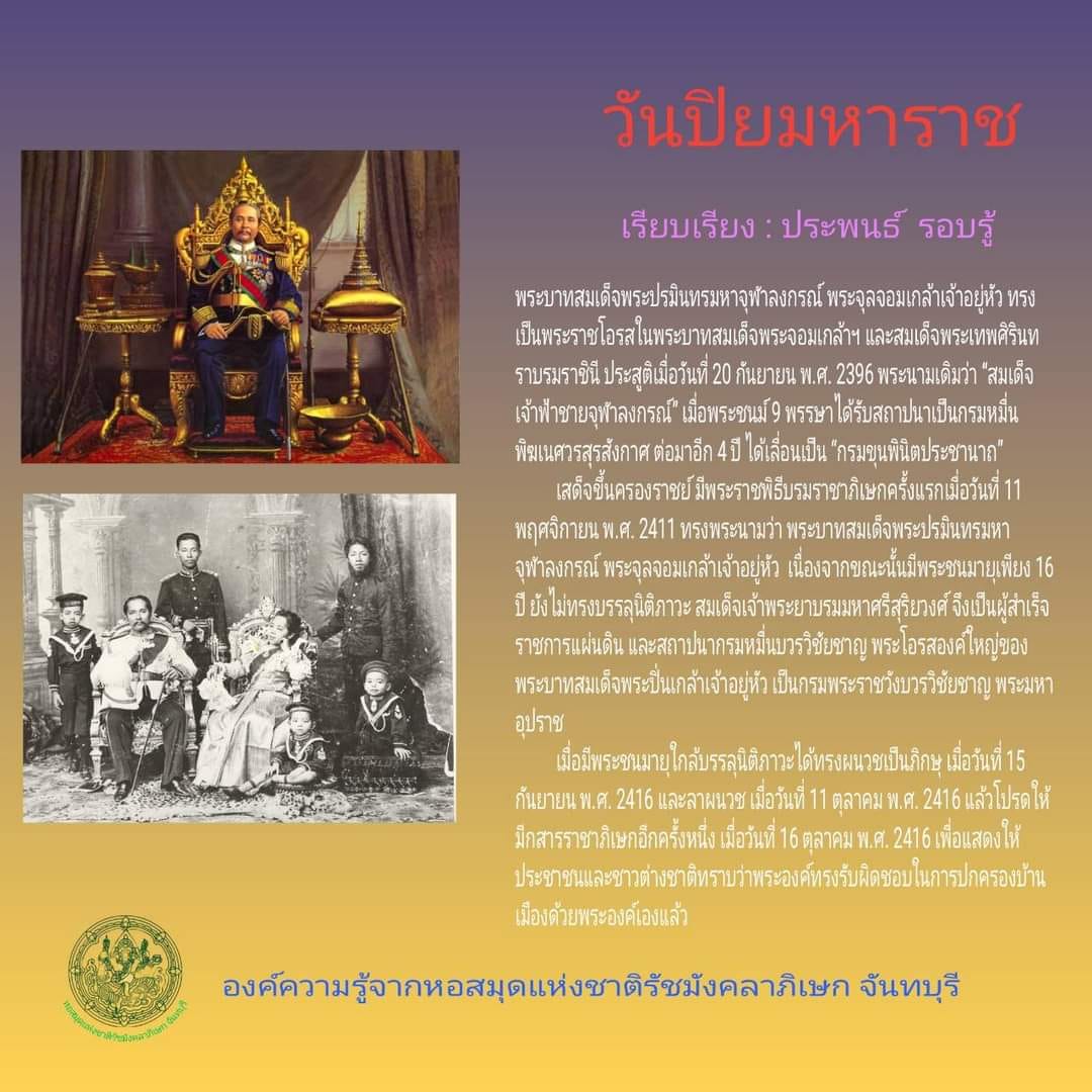 วันปิยมหาราช ตรงกับวันที่ 23 ตุลาคม ของทุกปี เป็นวันคล้ายวันสวรรคตของพระบาทสมเด็จพระจุลจอมเกล้าเจ้าอยู่หัว เนื่องจากพระองค์ทรงเป็นที่รักใคร่อย่างล้นเหลือของพสกนิกรทั้งชาวไทยและชาวต่างประเทศ พระองค์จึงได้รับการถวายพระราชสมัญญานามว่า “สมเด็จพระปิยมหาราช” ซึ่งมีความหมายว่า “พระมหากษัตริย์ที่ทรงเป็นที่รักยิ่งของปวงชน” ด้วยความสำนึกในพระมหากรุณาธิคุณ รัฐบาลจึงได้ประกาศให้วันที่ 23 ตุลาคม เป็น “วันปิยมหาราช”