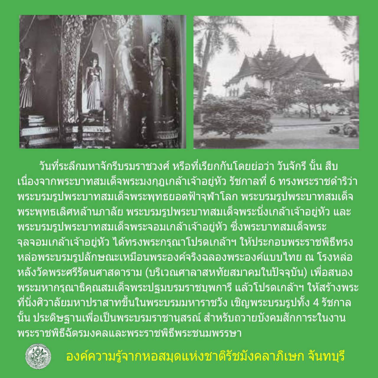 วันที่ระลึกมหาจักรีบรมราชวงศ์ หรือที่เรียกกันโดยย่อว่า วันจักรี นั้น สืบเนื่องจากพระบาทสมเด็จพระมงกุฎเกล้าเจ้าอยู่หัว รัชกาลที่ 6 ทรงพระราชดำริว่าพระบรมรูปพระบาทสมเด็จพระพุทธยอดฟ้าจุฬาโลก พระบรมรูปพระบาทสมเด็จพระพุทธเลิศหล้านภาลัย พระบรมรูปพระบาทสมเด็จพระนั่งเกล้าเจ้าอยู่หัว และพระบรมรูปพระบาทสมเด็จพระจอมเกล้าเจ้าอยู่หัว ซึ่งพระบาทสมเด็จพระจุลจอมเกล้าเจ้าอยู่หัว ได้ทรงพระกรุณาโปรดเกล้าฯ ให้ประกอบพระราชพิธีทรงหล่อพระบรมรูปลักษณะเหมือนพระองค์จริงฉลองพระองค์แบบไทย ณ โรงหล่อหลังวัดพระศรีรัตนศาสดาราม (บริเวณศาลาสหทัยสมาคมในปัจจุบัน) เพื่อสนองพระมหากรุณาธิคุณสมเด็จพระปฐมบรมราชบุพการี แล้วโปรดเกล้าฯ ให้สร้างพระที่นั่งศิวาลัยมหาปราสาทขึ้นในพระบรมมหาราชวัง เชิญพระบรมรูปทั้ง 4 รัชกาลนั้น ประดิษฐานเพื่อเป็นพระบรมราชานุสรณ์ สำหรับถวายบังคมสักการะในงานพระราชพิธีฉัตรมงคลและพระราชพิธีพระชนมพรรษา