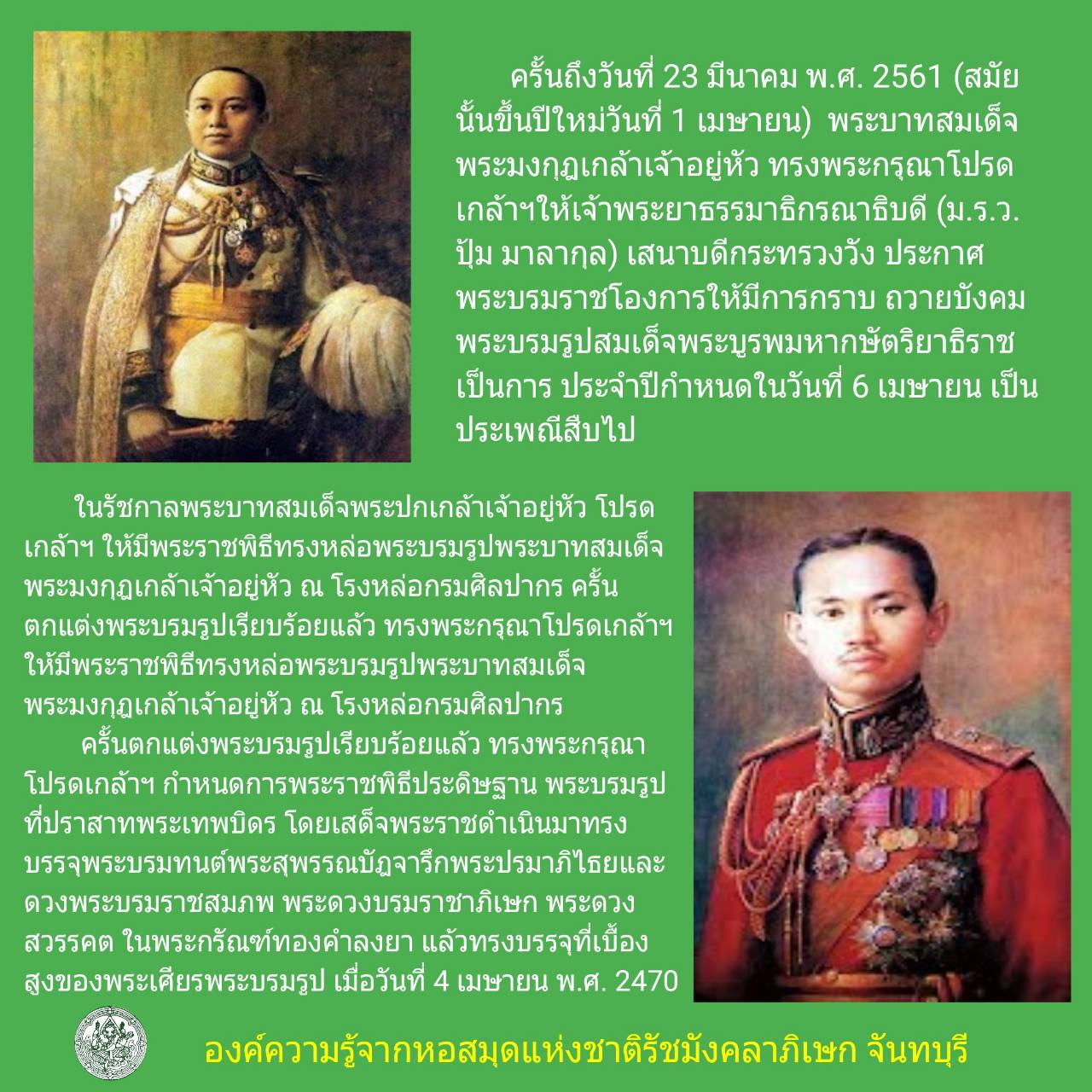 ครั้นถึงวันที่ 23 มีนาคม พ.ศ. 2561 (สมัยนั้นขึ้นปีใหม่วันที่ 1 เมษายน) พระบาทสมเด็จพระมงกุฎเกล้าเจ้าอยู่หัว ทรงพระกรุณาโปรดเกล้าฯให้เจ้าพระยาธรรมาธิกรณาธิบดี (ม.ร.ว. ปุ้ม มาลากุล) เสนาบดีกระทรวงวัง ประกาศพระบรมราชโองการให้มีการกราบ ถวายบังคมพระบรมรูปสมเด็จพระบูรพมหากษัตริยาธิราชเป็นการ ประจำปีกำหนดในวันที่ 6 เมษายน เป็นประเพณีสืบไป
