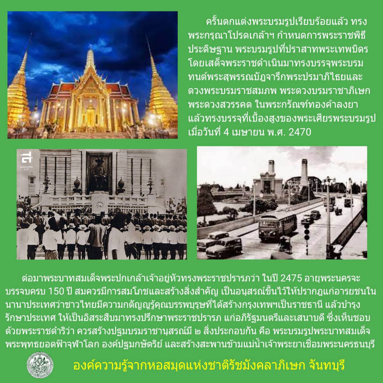 ต่อมาพระบาทสมเด็จพระปกเกล้าเจ้าอยู่หัวทรงพระราชปรารภว่า ในปี 2475 อายุพระนครจะบรรจบครบ 150 ปี สมควรมีการสมโภชและสร้างสิ่งสำคัญ เป็นอนุสรณ์ขึ้นไว้ให้ปรากฎแก่อารยชนในนานาประเทศว่าชาวไทยมีความกตัญญูรู้คุณบรรพบุรุษที่ได้สร้างกรุงเทพฯเป็นราชธานี แล้วบำรุงรักษาประเทศ ให้เป็นอิสระสืบมาทรงปรึกษาพระราชปรารภ แก่อภิรัฐมนตรีและเสนาบดี ซึ่งเห็นชอบด้วยพระราชดำริว่า ควรสร้างปฐมบรมราชานุสรณ์มี ๒ สิ่งประกอบกัน คือ พระบรมรูปพระบาทสมเด็จพระพุทธยอดฟ้าจุฬาโลก องค์ปฐมกษัตริย์ และสร้างสะพานข้ามแม่น้ำเจ้าพระยาเชื่อมพระนครธนบุรี