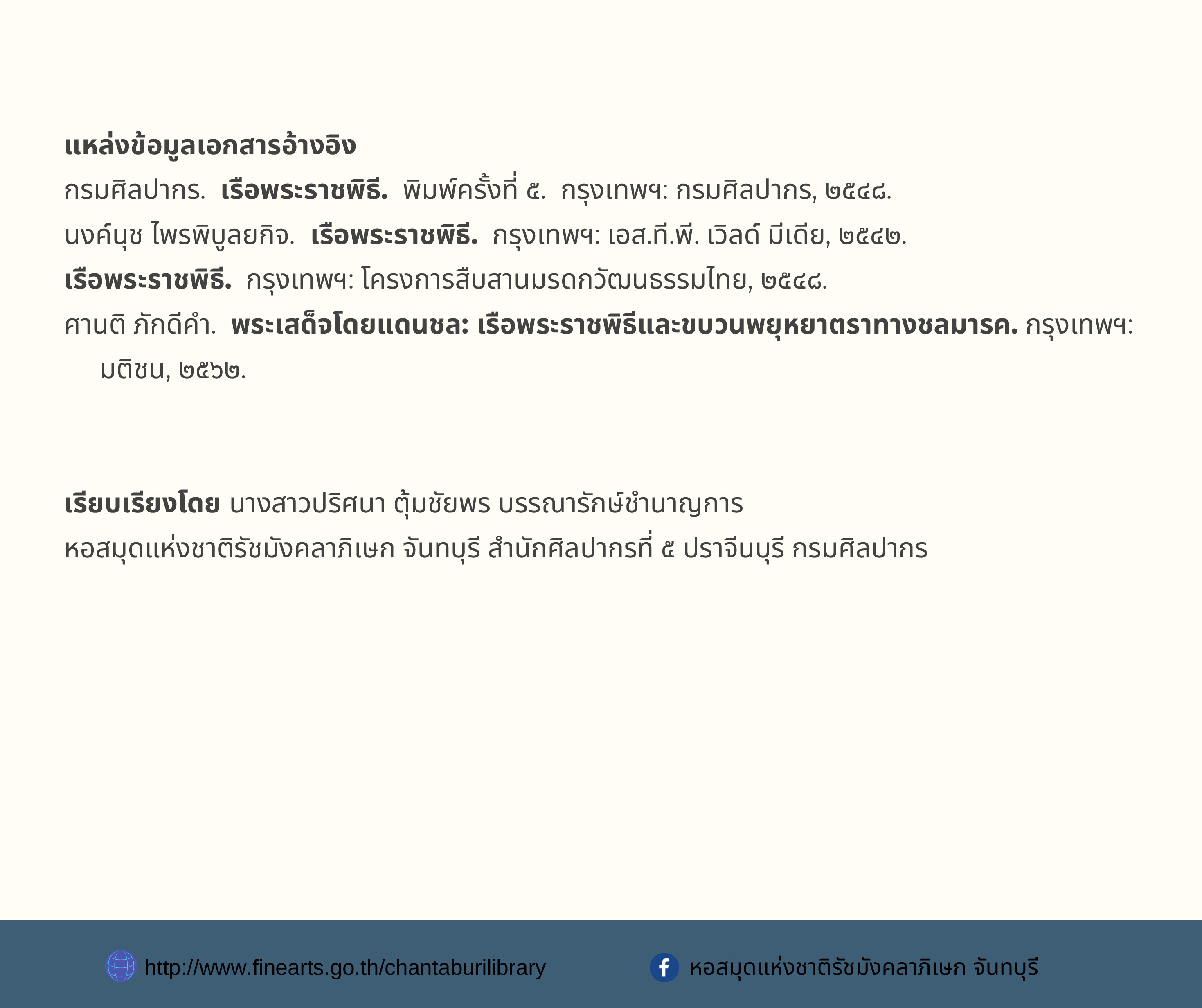 เรือพระราชพิธี. กรุงเทพฯ: โครงการสืบสานมรดกวัฒนธรรมไทย, ๒๕๔๘.
