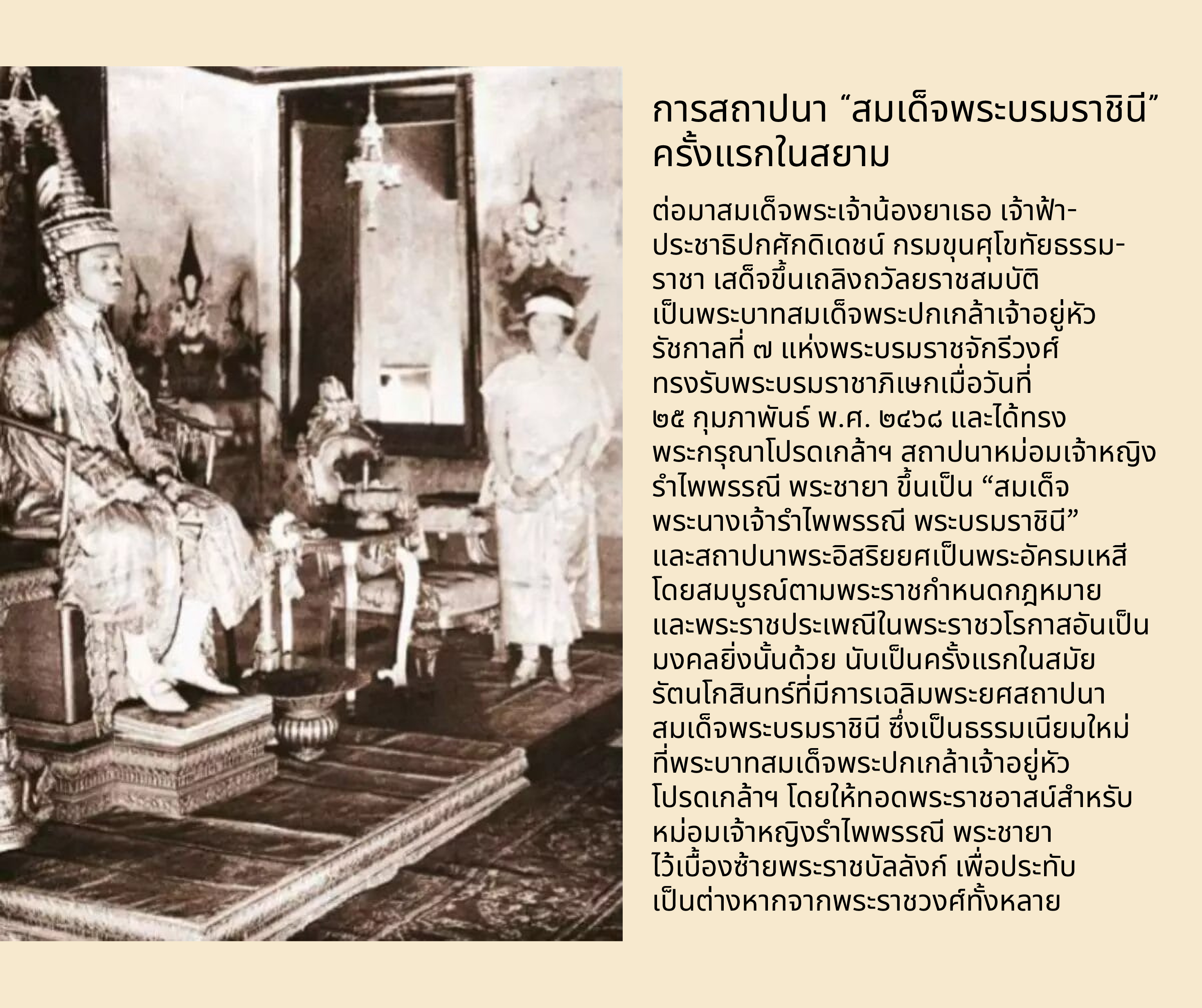 รัชกาลที่ ๗ แห่งพระบรมราชจักรีวงศ์ ทรงรับพระบรมราชภิเษกเมื่อวันที่ ๒๕ กุมภาพันธ์ พ.ศ. ๒๔๖๘ และได้ทรงพระกรุณาโปรดเกล้าฯ สถาปนาหม่อมเจ้าหญิงรำไพพรรณี พระชายา ขึ้นเป็น “สมเด็จพระนางเจ้ารำไพพรรณี พระบรมราชินี” และสถาปนาพระอิสริยยศเป็นพระอัครมเหสีโดยสมบูรณ์ตามพระราชกำหนดกฎหมายและ