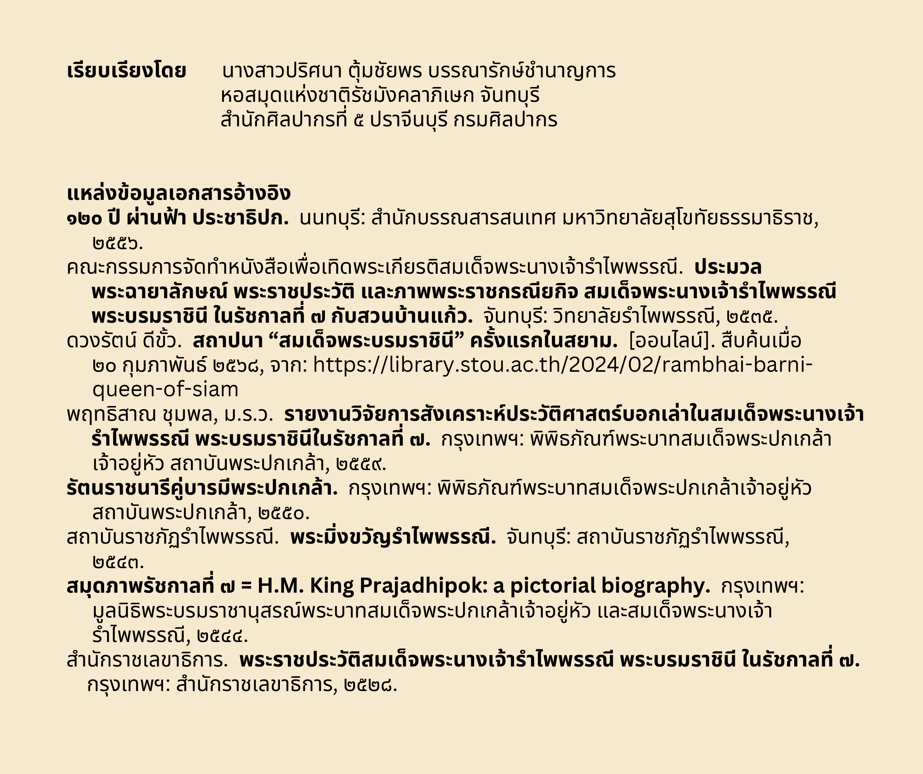 รำไพพรรณี พระบรมราชินี ในรัชกาลที่ ๗ กับสวนบ้านแก้ว. จันทบุรี: วิทยาลัยรำไพพรรณี, ๒๕๓๕.