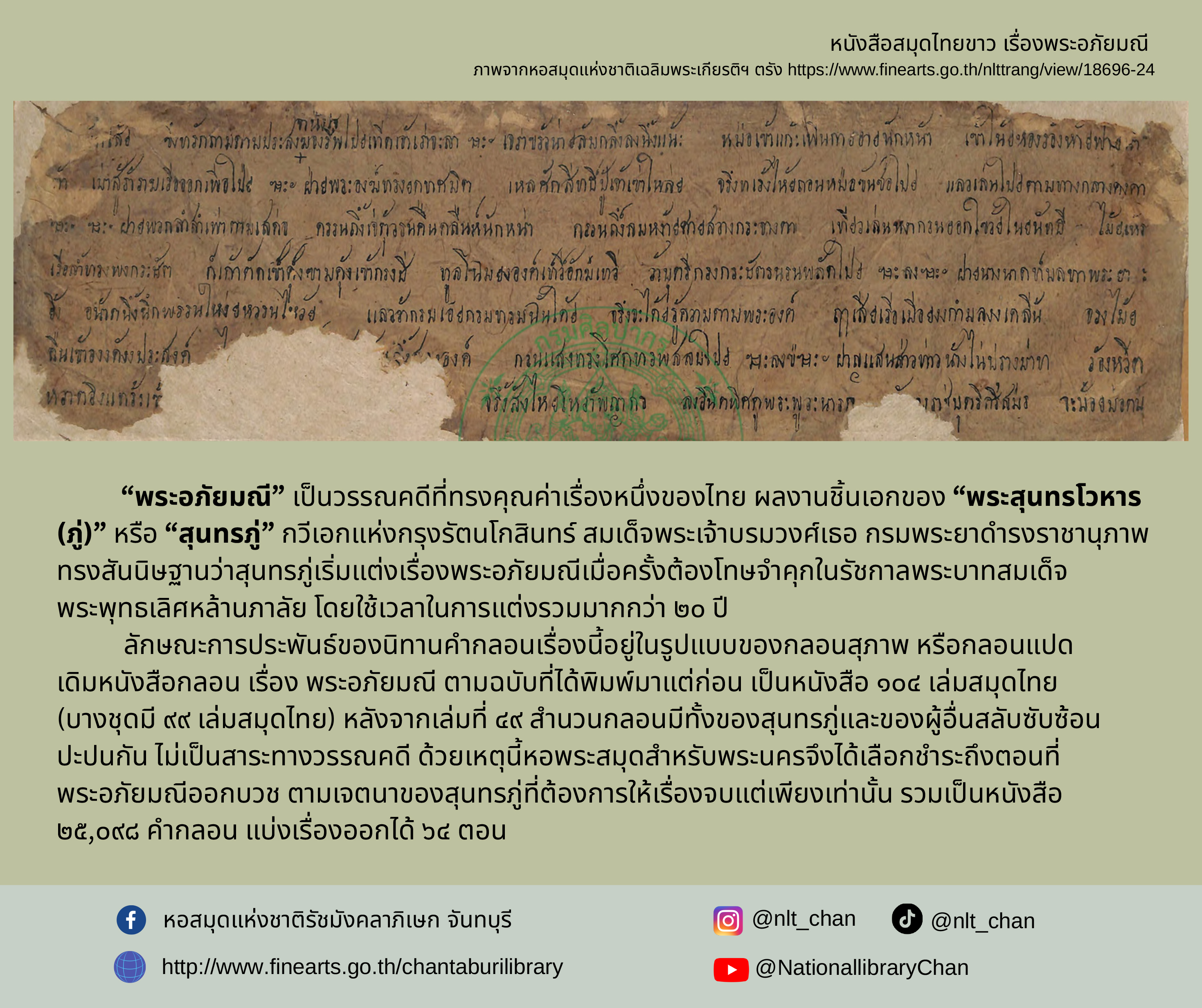 การยกย่องจากยูเนสโก (UNESCO) ให้เป็น “บุคคลสำคัญของโลกด้านวรรณกรรม” หอสมุดแห่งชาติรัชมังคลาภิเษก จันทบุรี ขอนำเสนอ ๕ เรื่องน่ารู้จากเรื่อง พระอภัยมณี วรรณคดีเรื่องเอกของสุนทรภู่ ดังนี้