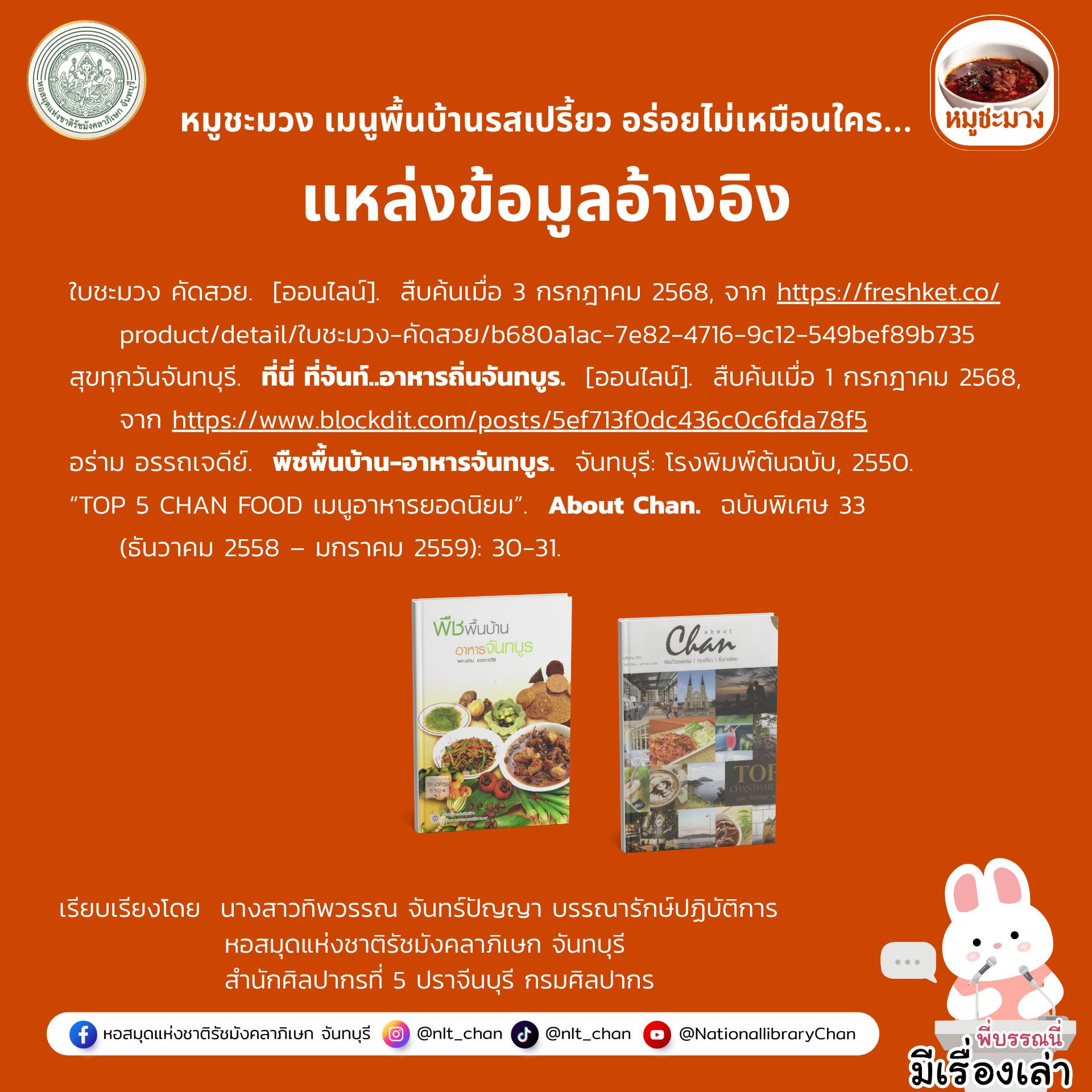สุขทุกวันจันทบุรี. ที่นี่ ที่จันท์..อาหารถิ่นจันทบูร. [ออนไลน์]. สืบค้นเมื่อ 1 กรกฎาคม 2568, จาก https://www.blockdit.com/posts/5ef713f0dc436c0c6fda78f5
