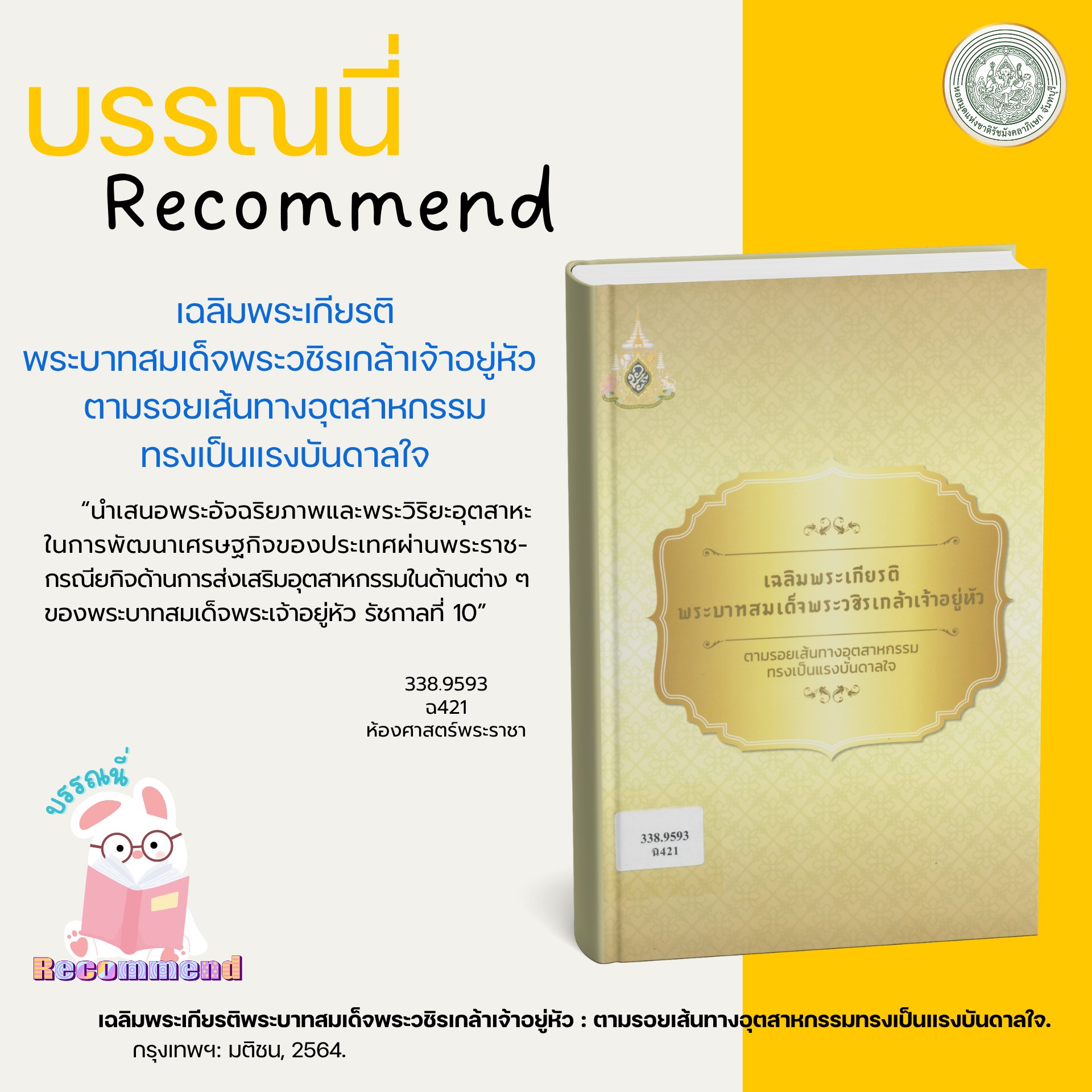 เฉลิมพระเกียรติพระบาทสมเด็จพระวชิรเกล้าเจ้าอยู่หัว:ตามรอยเส้นทางอุตสาหกรรมทรงเป็นแรงบันดาลใจ. กรุงเทพฯ: มติชน, 2564.