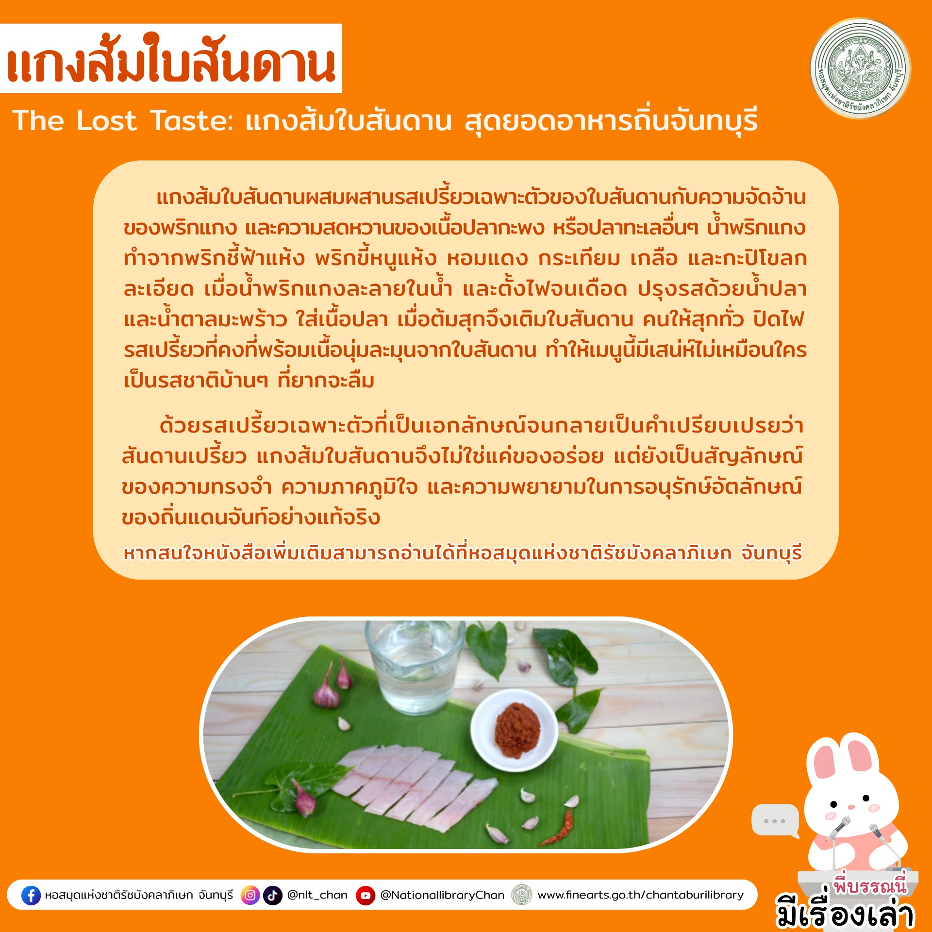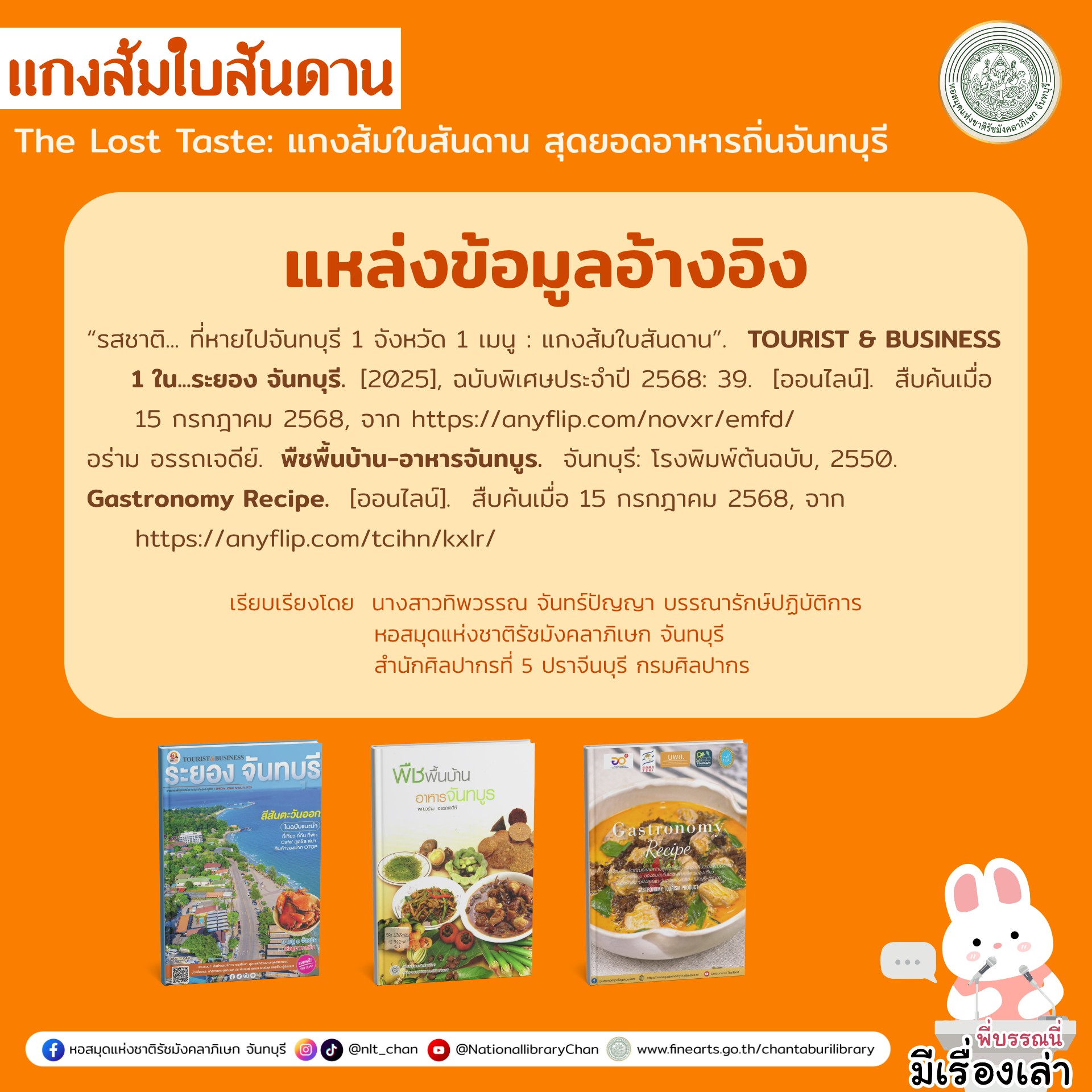 “รสชาติ... ที่หายไปจันทบุรี 1 จังหวัด 1 เมนู : แกงส้มใบสันดาน”. TOURIST & BUSINESS 1 ใน...ระยอง จันทบุรี. [2025], ฉบับพิเศษประจำปี 2568: 39. [ออนไลน์].