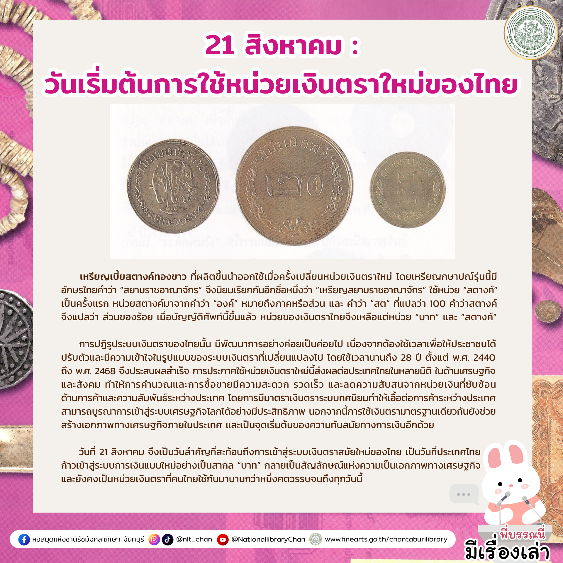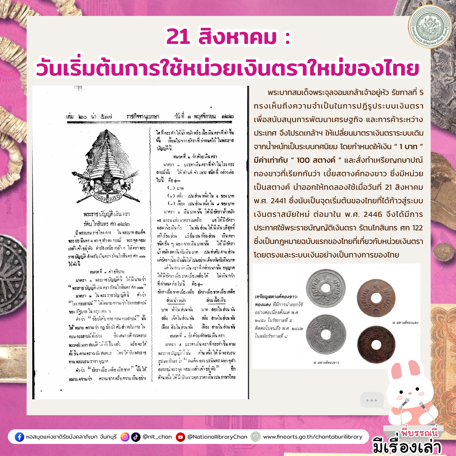 การปฏิรูประบบเงินตราถือเป็นรากฐานสำคัญของพัฒนาการทางเศรษฐกิจและสังคมในประเทศไทย หนึ่งในเหตุการณ์ที่สำคัญยิ่ง คือ การประกาศใช้หน่วยเงินตราใหม่ในวันที่ 21 สิงหาคม พ.ศ. 2441 ซึ่งนับเป็นการปรับโครงสร้างระบบเงินตราไทยให้มีมาตรฐานสากล โดยกำหนดให้ “บาท” เป็นหน่วยเงินตราหลักแทนการใช้หน่วยเงินโบราณที่ซับซ้อน