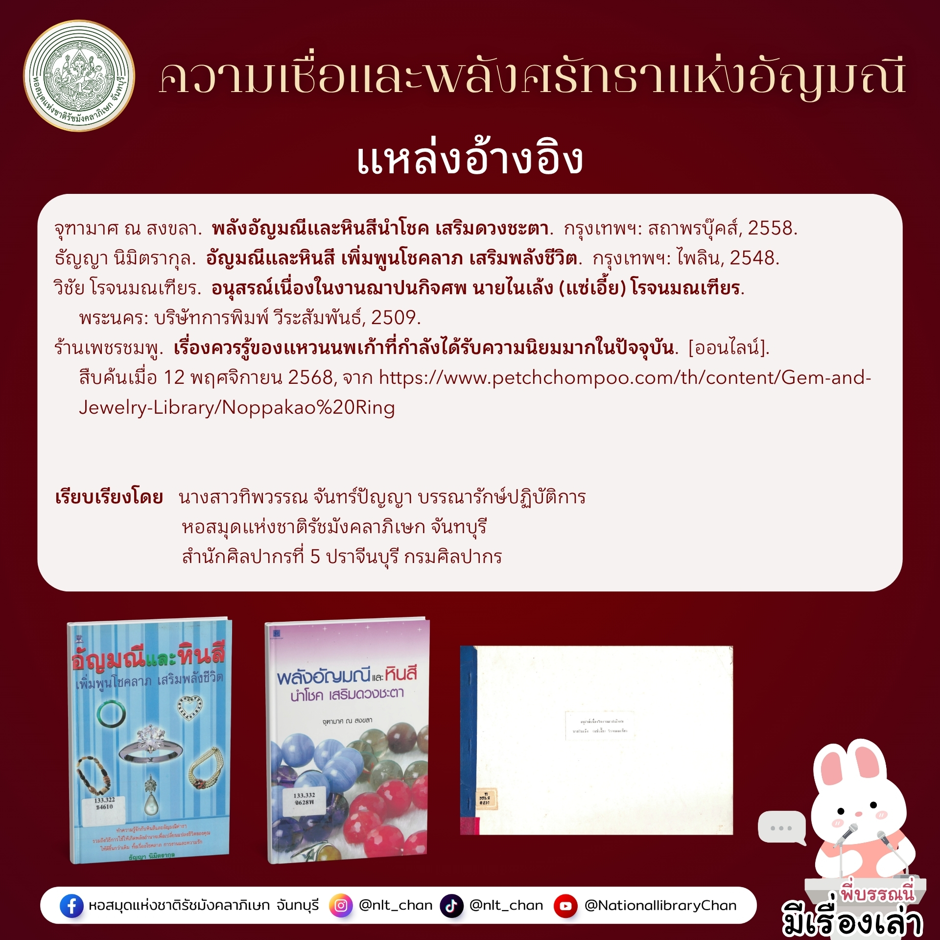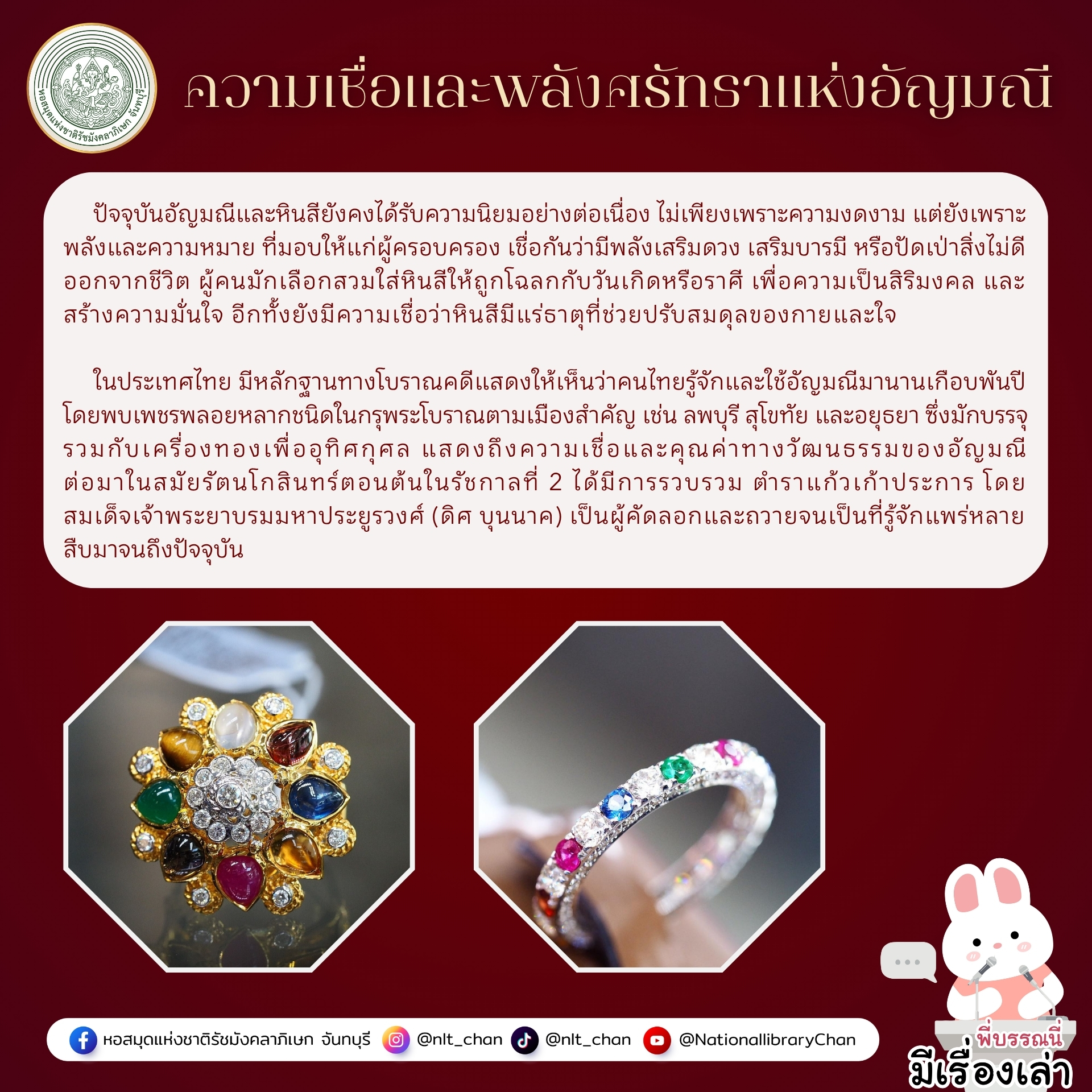 สามารถอ่านเรื่องราวเพิ่มเติมเกี่ยวกับพลังของอัญมณีและหินสีได้ที่ ห้องหนังสือทั่วไป 1 หอสมุดแห่งชาติรัชมังคลาภิเษก จันทบุรี