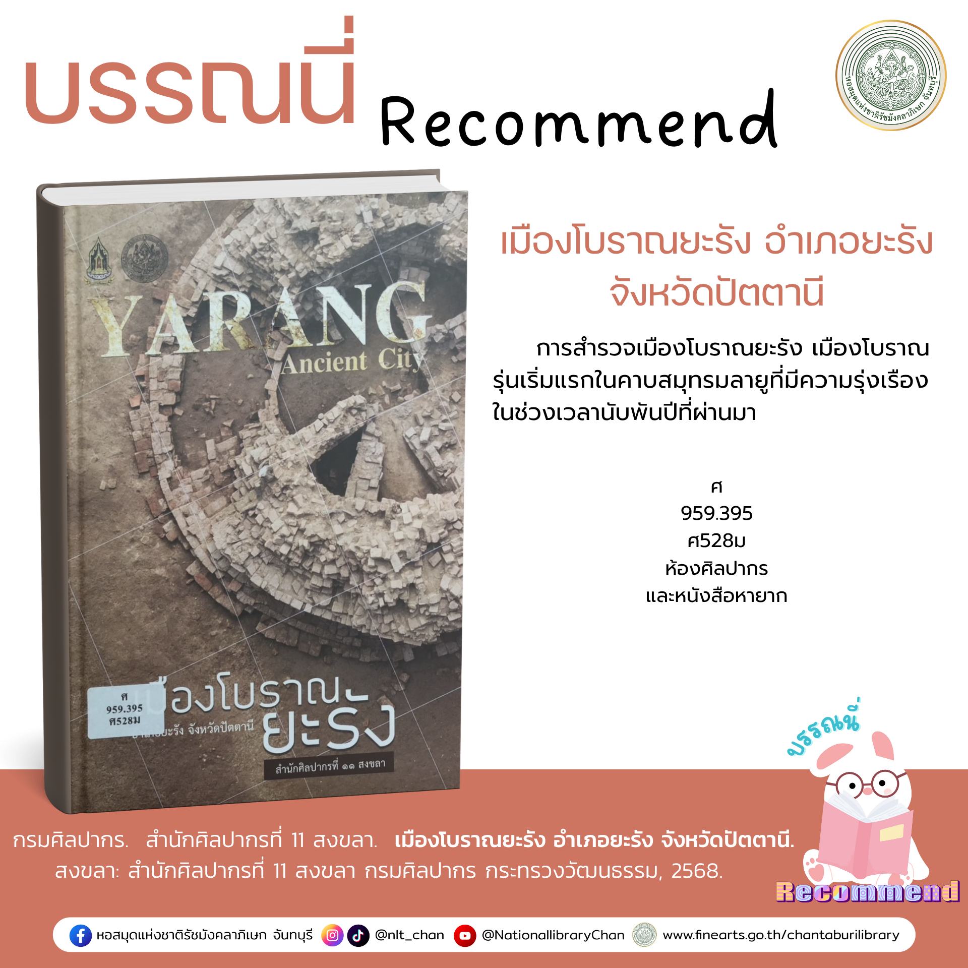 กรมศิลปากร สำนักศิลปากรที่ 11 สงขลา. เมืองโบราณยะรัง อำเภอยะรัง จังหวัดปัตตานี. สงขลา: สำนักศิลปากรที่ 11 สงขลา กรมศิลปากร กระทรวงวัฒนธรรม, 2568.