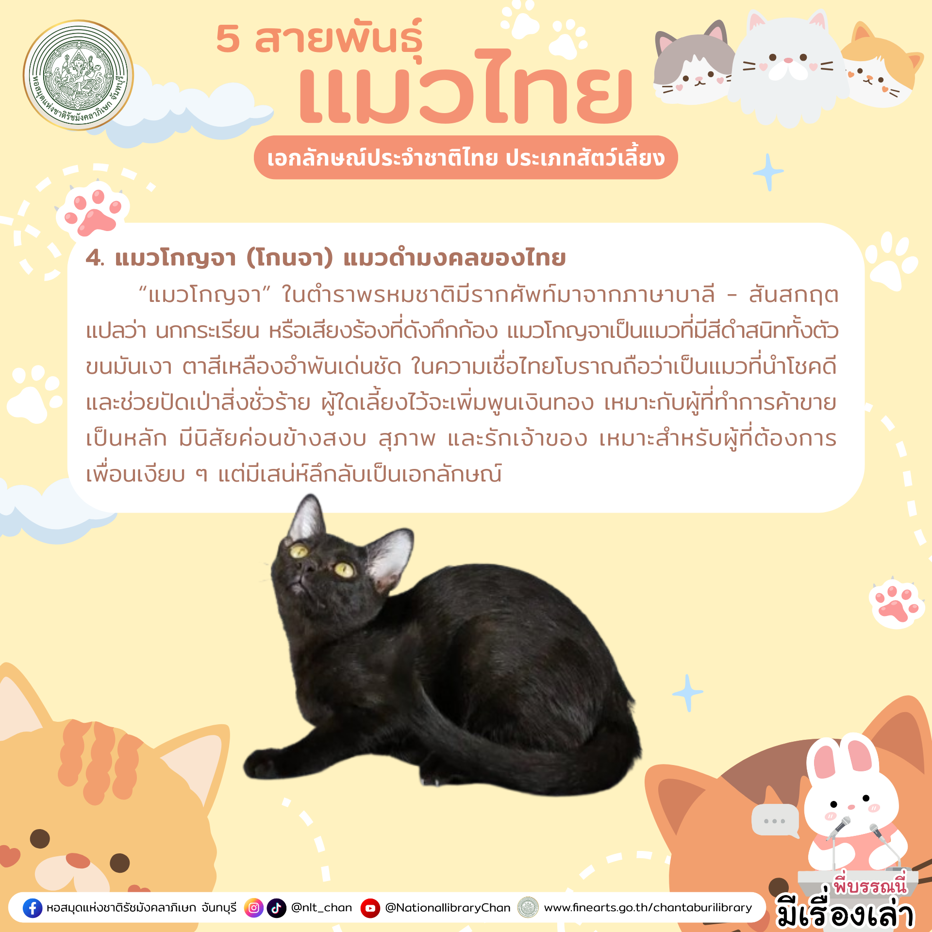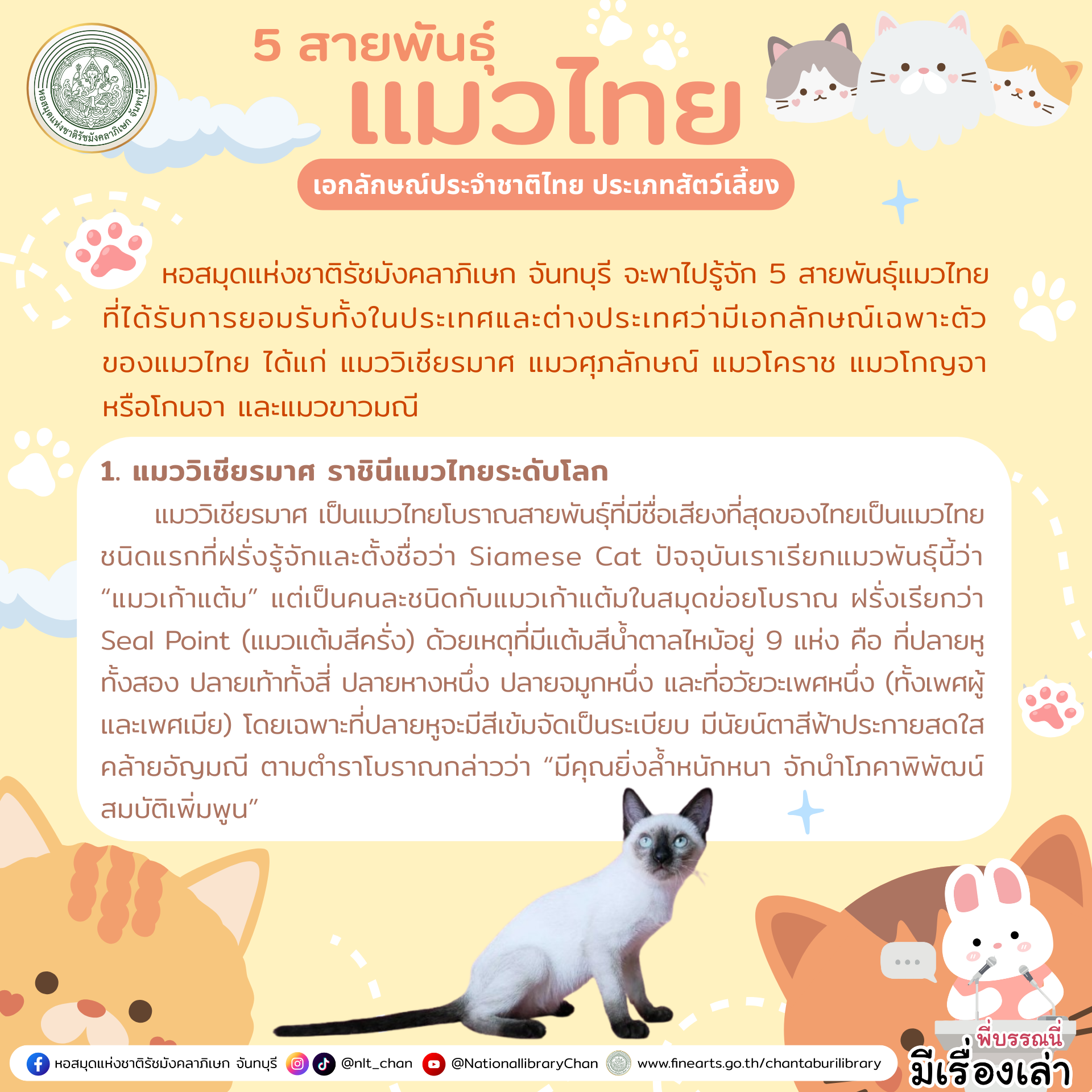 หอสมุดแห่งชาติรัชมังคลาภิเษก จันทบุรี จะพาไปรู้จัก 5 สายพันธุ์แมวไทย ที่ได้รับการยอมรับทั้งในประเทศและต่างประเทศว่ามีเอกลักษณ์เฉพาะตัวของแมวไทย ได้แก่ แมววิเชียรมาศ แมวศุภลักษณ์ แมวโคราช แมวโกญจา หรือโกนจา และแมวขาวมณี