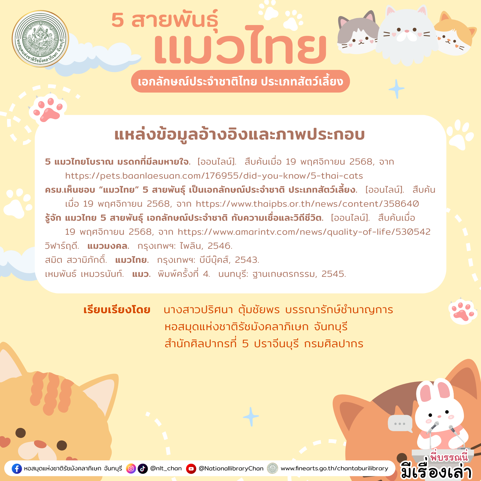 5 แมวไทยโบราณ มรดกที่มีลมหายใจ. [ออนไลน์]. สืบค้นเมื่อ 19 พฤศจิกายน 2568, จาก https://pets.baanlaesuan.com/176955/did-you-know/5-thai-cats