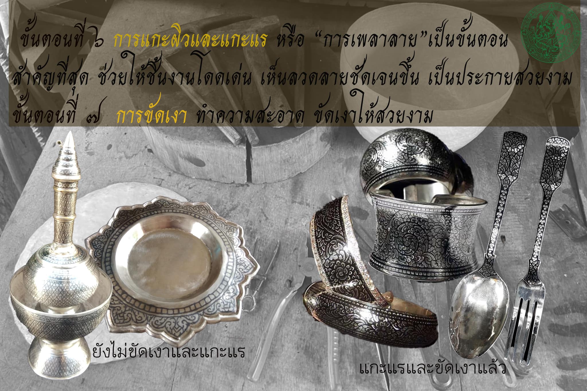๑.๖) การแกะผิวและแกะแร วิธีการแกะผิวแกะแรหรือการเพลาลาย ซึ่งเป็นขั้นตอนที่สำคัญที่สุดก็ว่าได้ เพราะจะช่วยให้รายละเอียดของลายบนภาชนะมีความโดดเด่นขึ้น ขึ้นเงา ต้องแสงเป็นประกายสวยงาม โดยขั้นตอนนี้ต้องอาศัยฝีมือ ประสบการณ์ และความชำนาญของช่าง