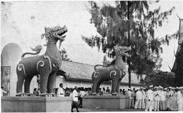 สิงห์หรือราชสีห์คู่ หน้าวัดพระธาตุหริภุญชัย เป็นสิงห์ทรงเครื่องขนาดใหญ่ ก่ออิฐฉาบปูน ลักษณะยืนอ้าปากกระดกลิ้น มีเครา หางตั้งม้วนเป็นขดบนกลางหลัง ระบายสีแดงก่ำและตกแต่งลายปูนปั้นสีขาว สร้างขึ้นพร้อมกับซุ้มโขง จากภาพถ่ายเก่าพบว่าเคยมีลวดถักเป็นตาข่ายรัดตัวสิงห์ไว้ไม่ให้ชำรุด พร้อมสร้างศาลามีหลังคาคลุมไว้