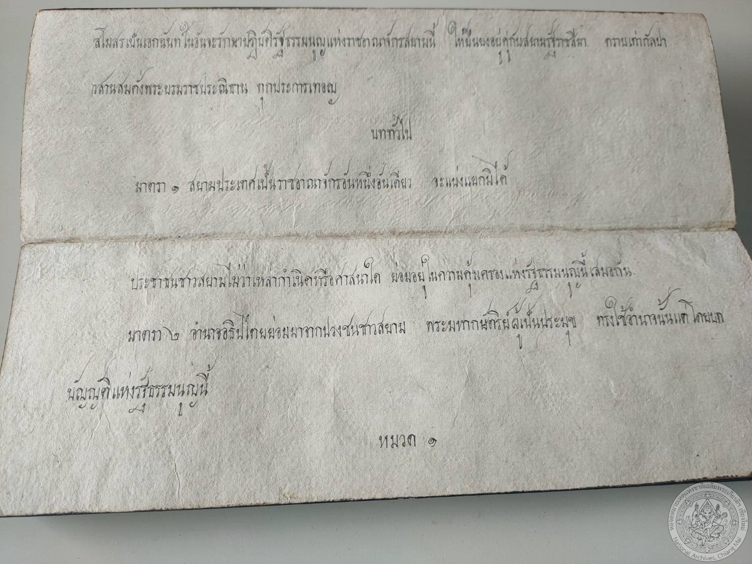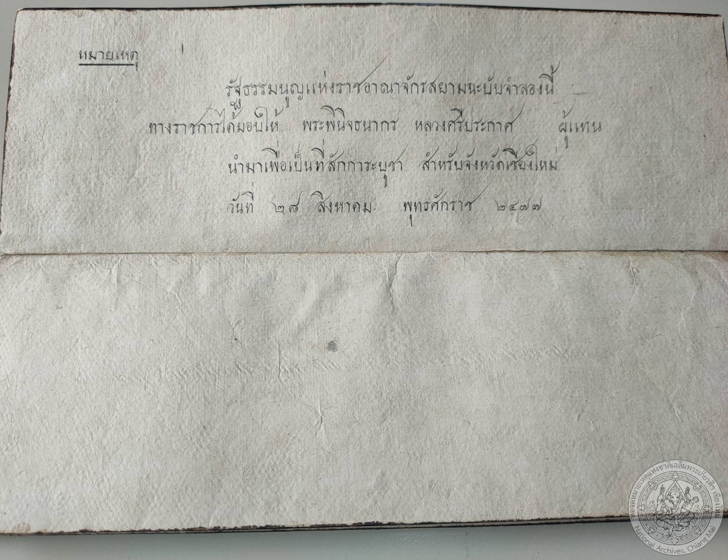 รัฐธรรมนูญแห่งราชอาณาจักรสยามฉบับจำลอง ที่ถูกอัญเชิญมาประดิษฐานที่จังหวัดเชียงใหม่ รับมอบโดยพระพินิจธนากร (บุญเพ็ง ยุกตะนันทน์) และหลวงศรีประกาศ (ฉันท์ วิชยาภัย) ผู้แทนราษฎรจังหวัดเชียงใหม่ในขณะนั้น ปัจจุบันถูกเก็บรักษาไว้ที่หอจดหมายเหตุแห่งชาติเฉลิมพระเกียรติสมเด็จพระนางเจ้าสิริกิติ์ พระบรมราชินีนาถ เชียงใหม่ โดยนายเจริญฤทธิ์ สงวนสัตย์ ผู้ว่าราชการจังหวัดเชียงใหม่ได้มอบให้หอจดหมายเหตุแห่งชาติเฉลิมพระเกียรติสมเด็จพระนางเจ้าสิริกิติ์ พระบรมราชินีนาถ เชียงใหม่ ในวันที่ ๑๔ พฤษภาคม ๒๕๖๓ เพื่อเก็บรักษาไว้เป็นหลักฐานทางประวัติศาสตร์ของจังหวัดเชียงใหม่และใช้เป็นข้อมูลในการศึกษาอ้างอิงต่อไป