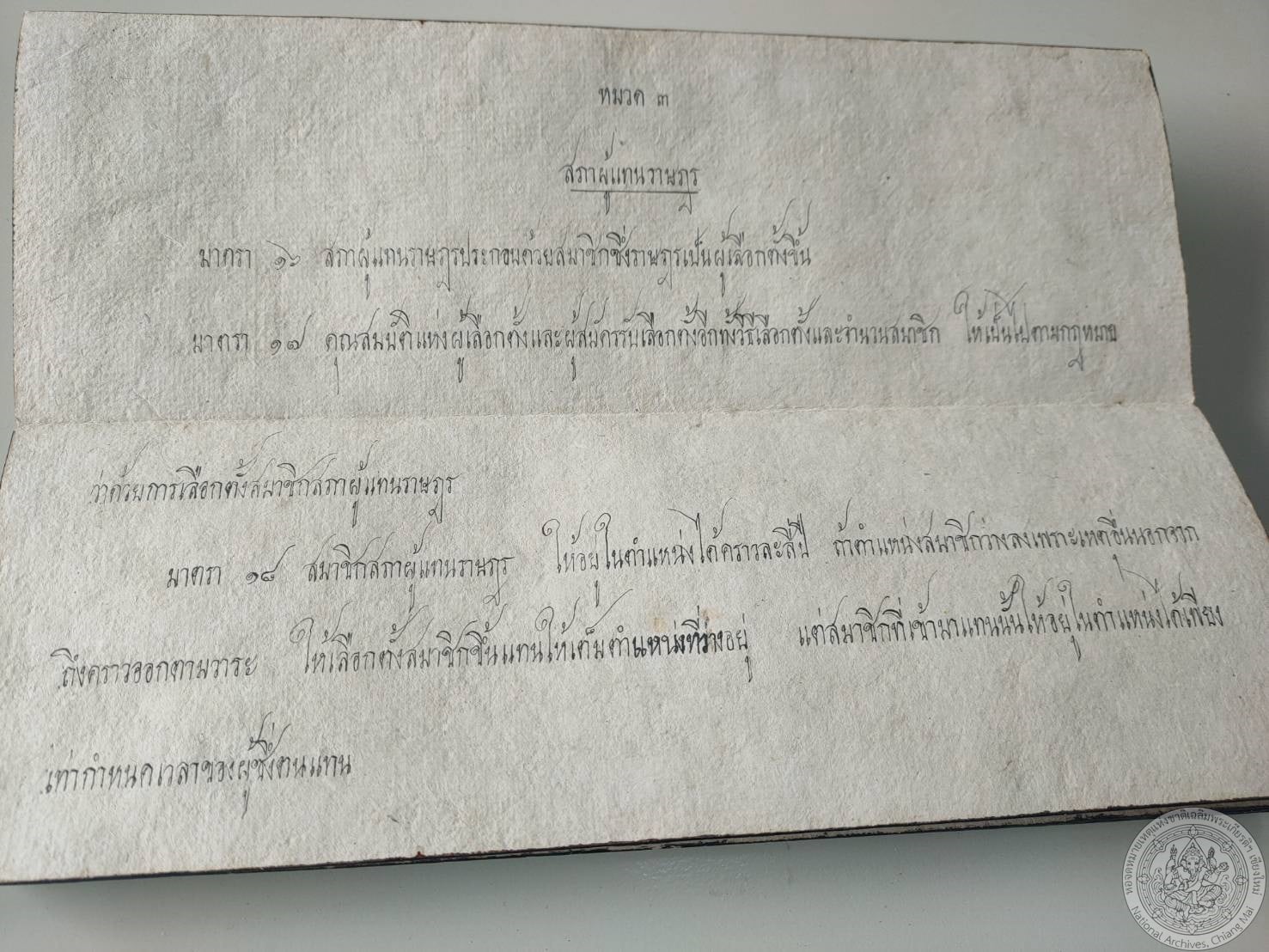 ใน พ.ศ. ๒๔๗๗ นายจำรัส มหาวงศ์นันทน์ ผู้แทนราษฎรจังหวัดน่าน มีจดหมายถึงคณะรัฐมนตรี จำนวน ๒ ฉบับ ฉบับแรกเสนอว่ารัฐบาลควรให้ผู้แทนราษฎรแต่ละคนอัญเชิญรัฐธรรมนูญไปสู่จังหวัดของตนเมื่อหมดสมัยประชุม และฉบับที่ ๒ ขอให้จัดทำ “รัฐธรรมนูญจำลอง” เป็นสมุดข่อย อัญเชิญไปยังศาลากลางจังหวัด เพื่อให้ประชาชนใช้ยึดเหนี่ยวเป็นหลักที่พึ่ง ทั้งยังเป็นการเผยแพร่รัฐธรรมนูญด้วย รัฐบาลจึงเห็นควรให้สร้างรัฐธรรมนูญจำลองขึ้น สำหรับนำไปประดิษฐานไว้ทุกจังหวัด โดยมีหลวงวิจิตรวาทการเป็นผู้ควบคุมดูแล ในฐานะเลขาธิการสมาคมคณะรัฐธรรมนูญและอธิบดีกรมศิลปากร ได้มีการประสานงานกับหลวงประดิษฐมนูธรรมเกี่ยวกับการออกแบบ ซึ่งได้จัดทำออกมาเป็นสมุดไทยลงรักปิดทอง วางบนพาน ๒ ชั้น โดยช่างฝีมือของกรมศิลปากร จำนวน ๗๐ ชุด แจกจ่ายไปตามจังหวัดต่าง ๆ จำนวน ๖๙ ชุด เพื่อนำไปประดิษฐาน ณ ศาลากลางแต่ละจังหวัด อีก ๑ ชุด สำหรับประดิษฐาน ณ ที่ทำการใหญ่ของสมาคมคณะรัฐธรรมนูญ พระราชอุทยานสราญรมย์