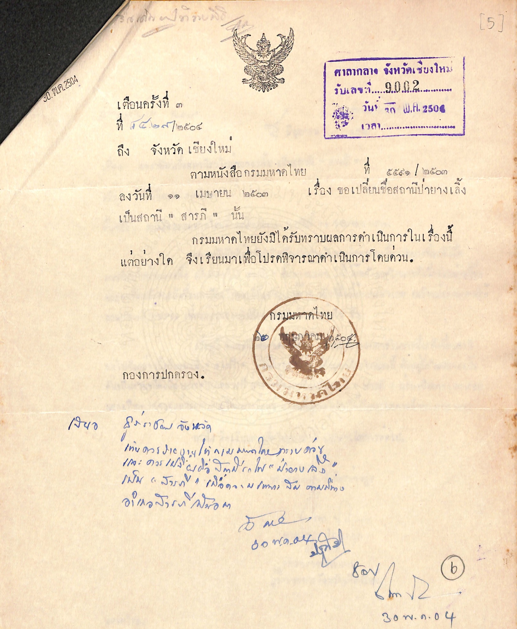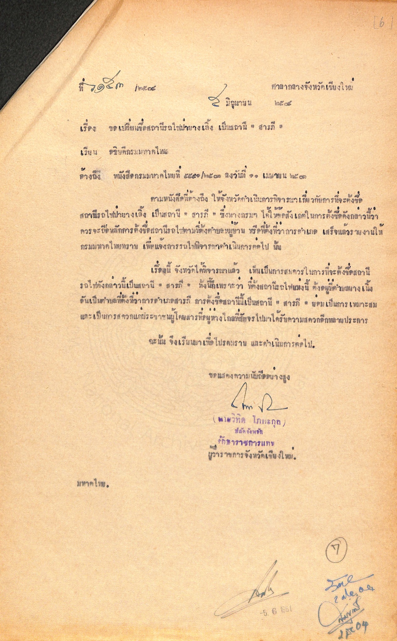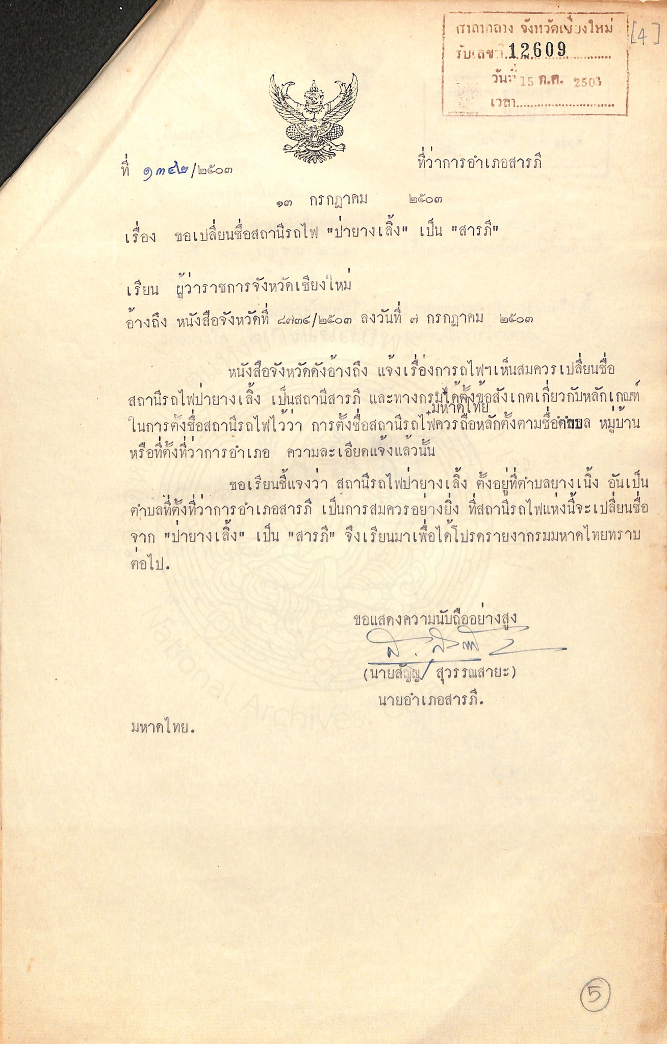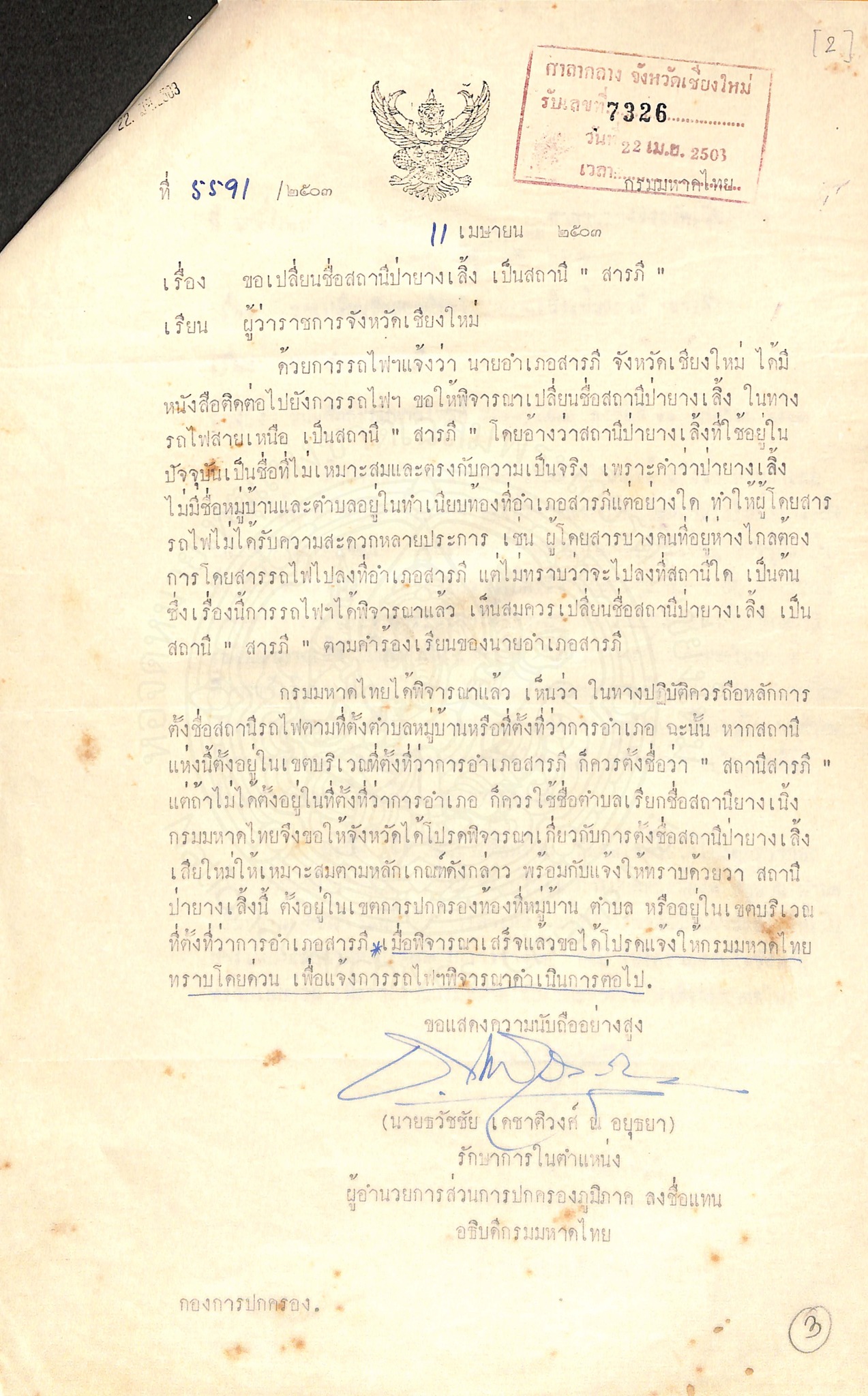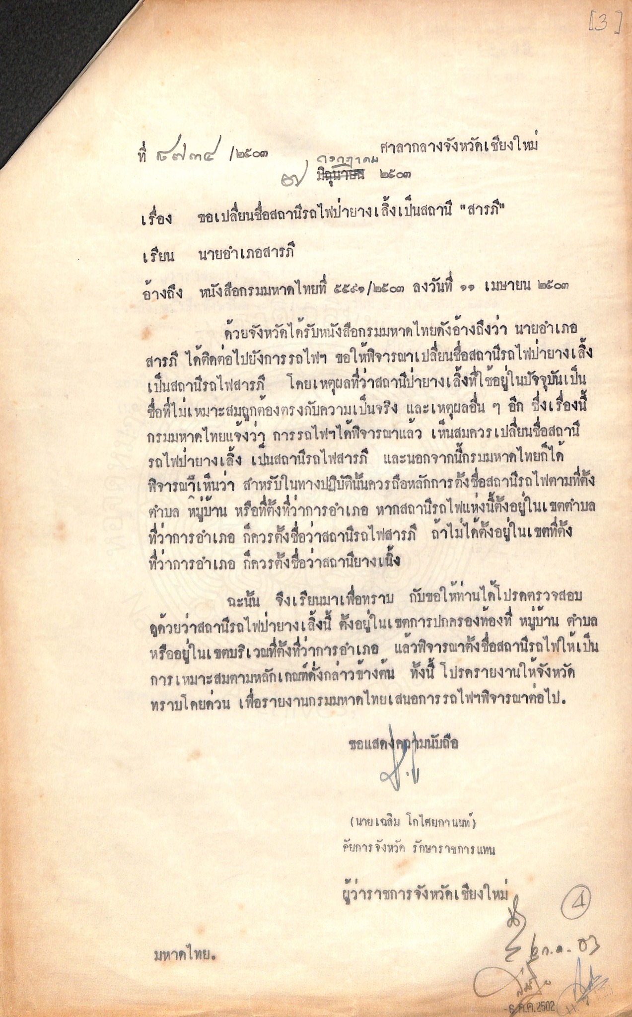๑. หอจดหมายเหตุแห่งชาติเฉลิมพระเกียรติสมเด็จพระนางเจ้าสิริกิติ์ พระบรมราชินีนาถ เชียงใหม่. เอกสารสำนักงานปกครองจังหวัดเชียงใหม่ หจช ชม ชม ๑.๒.๑/๕๓ เรื่องขอเปลี่ยนชื่อสถานีรถไฟป่ายางเลิ้ง เป็นสถานีสารภี (๑๑ เมษายน ๒๕๐๓ – ๕ มิถุนายน ๒๕๐๔)