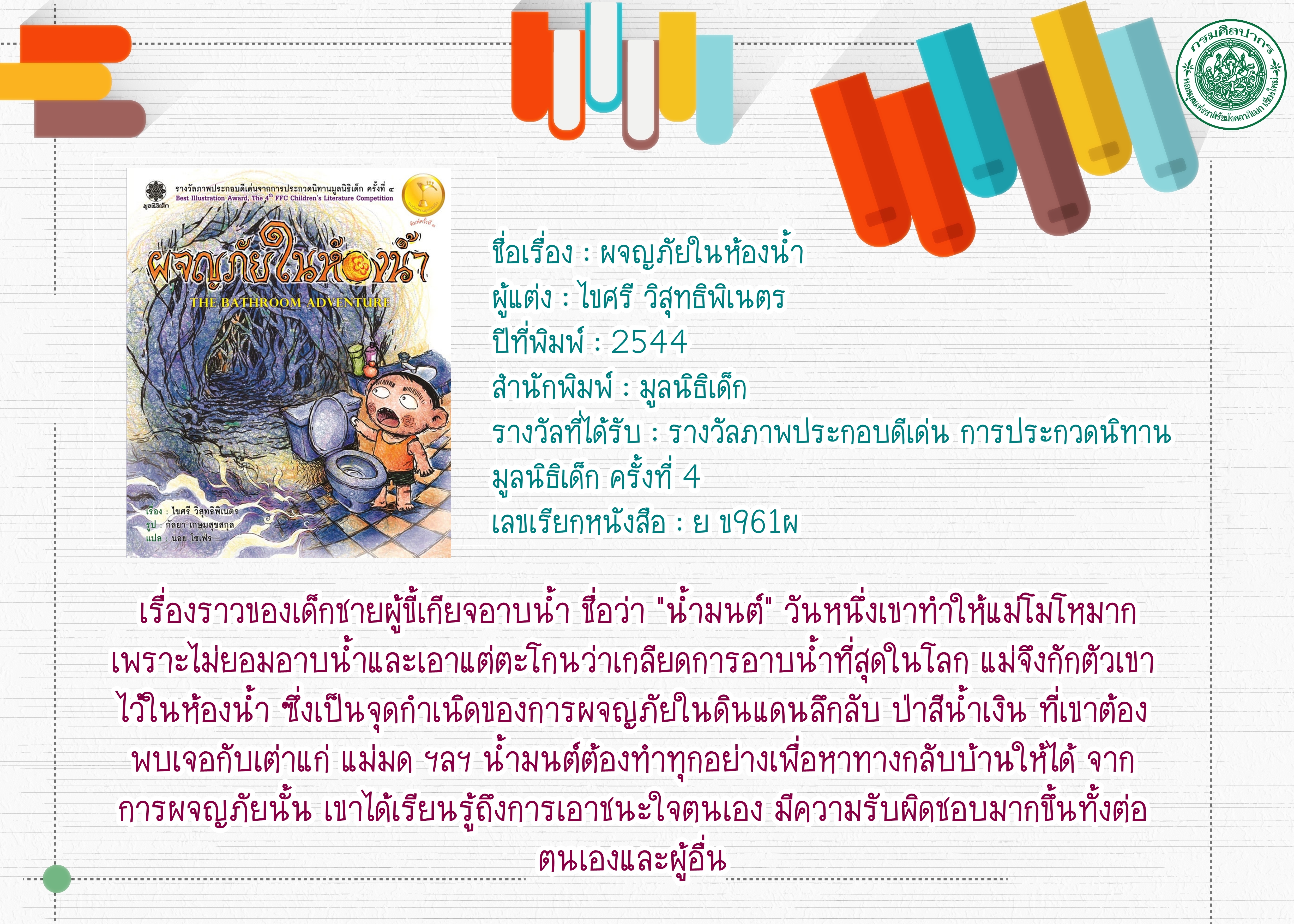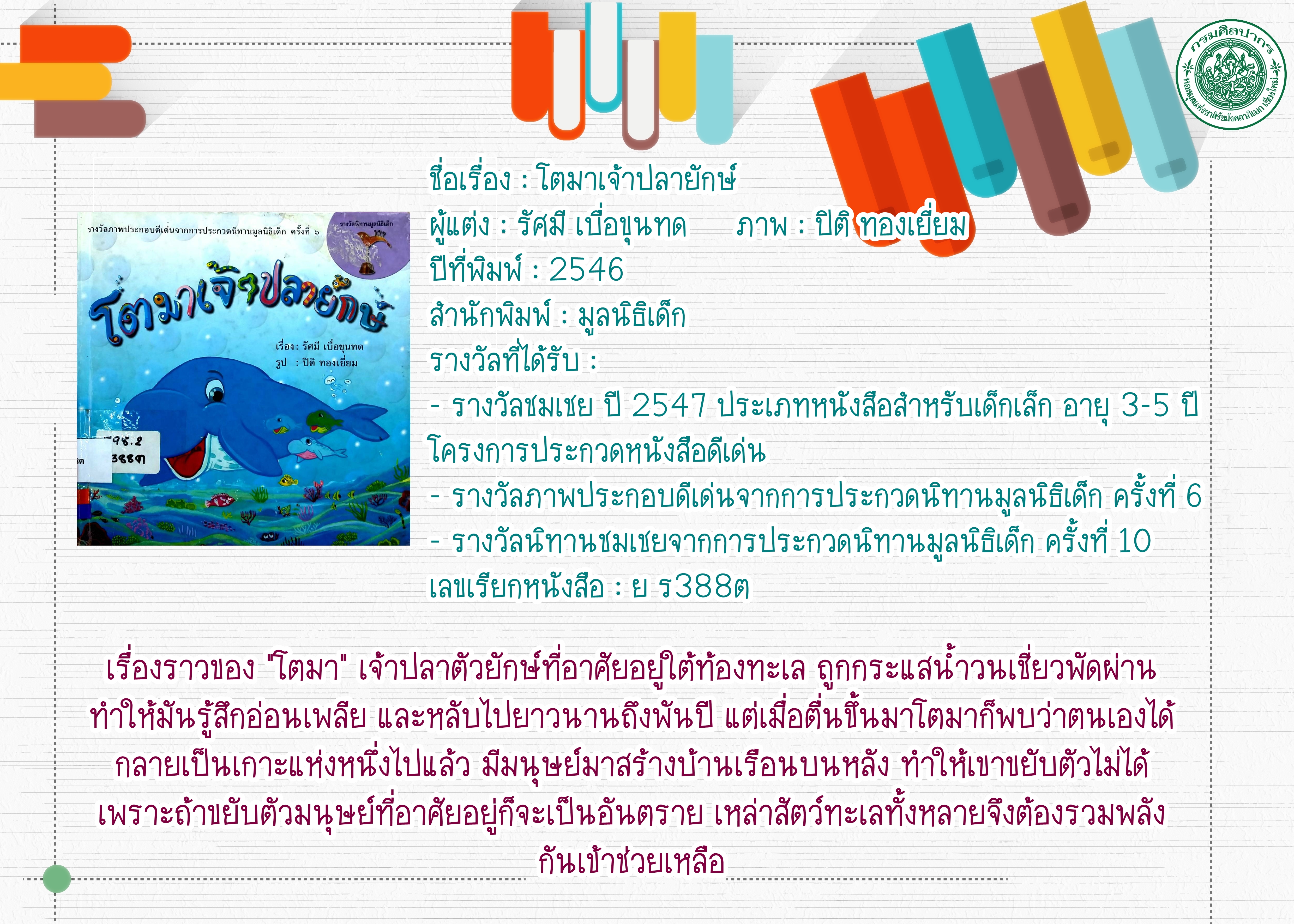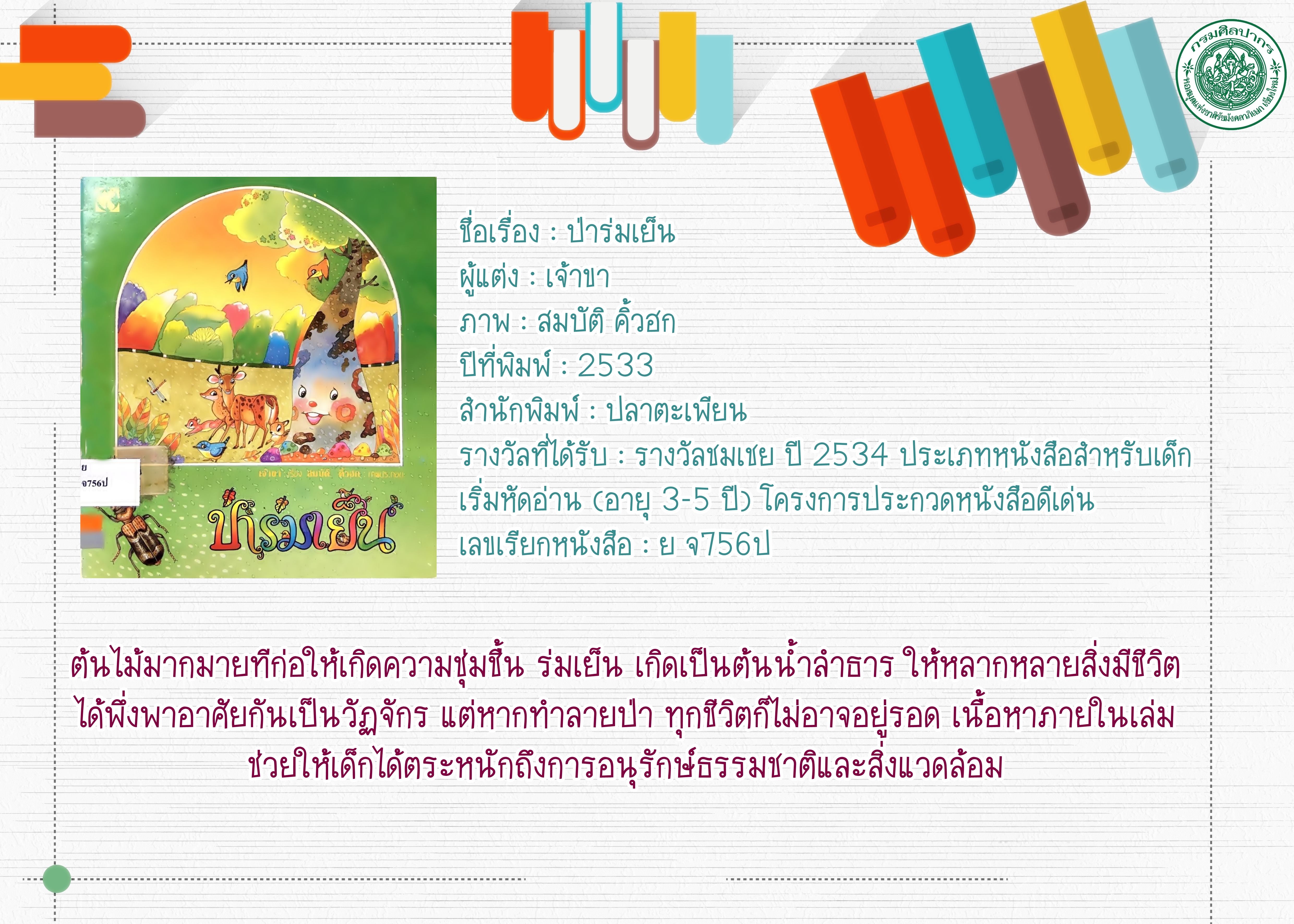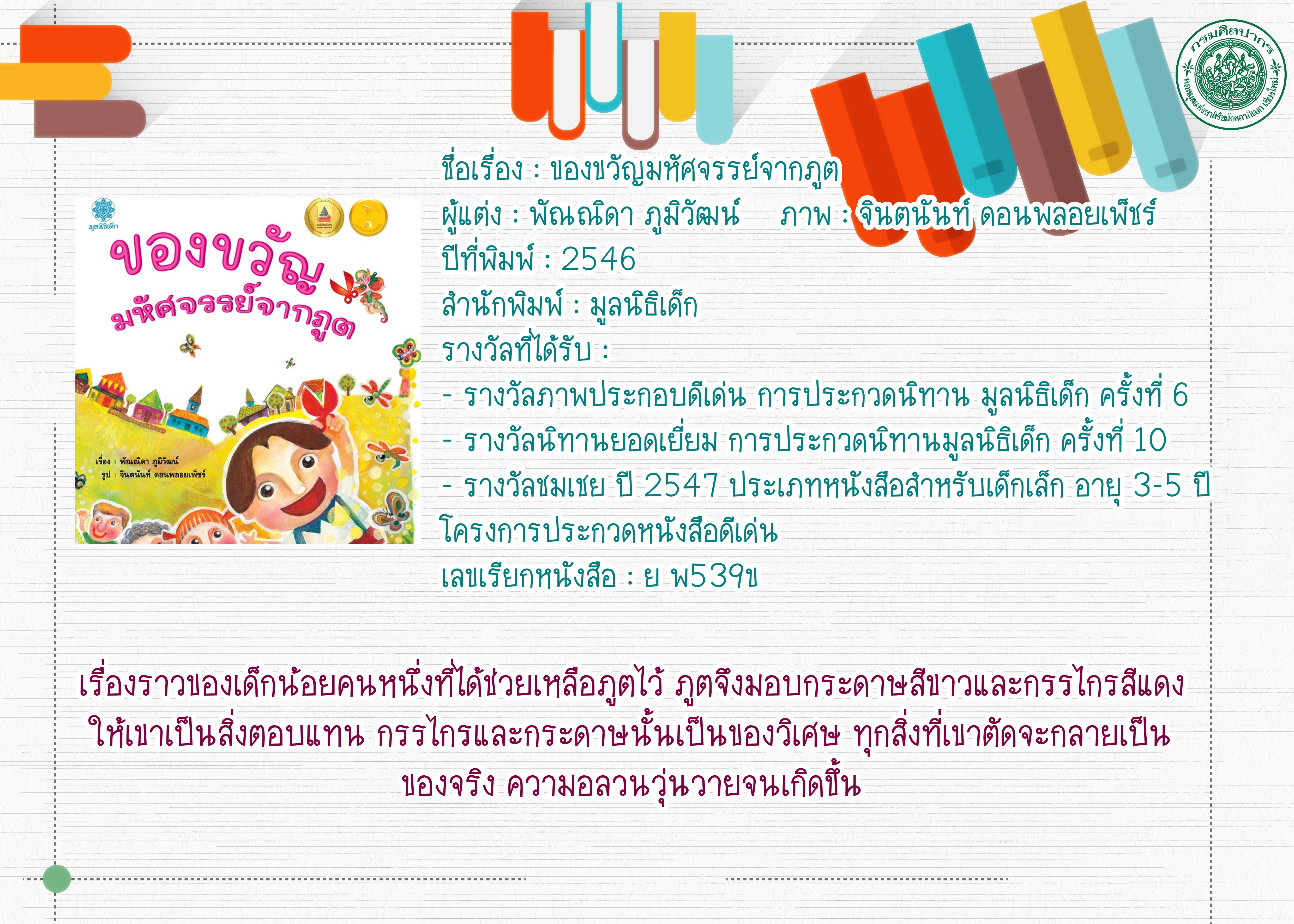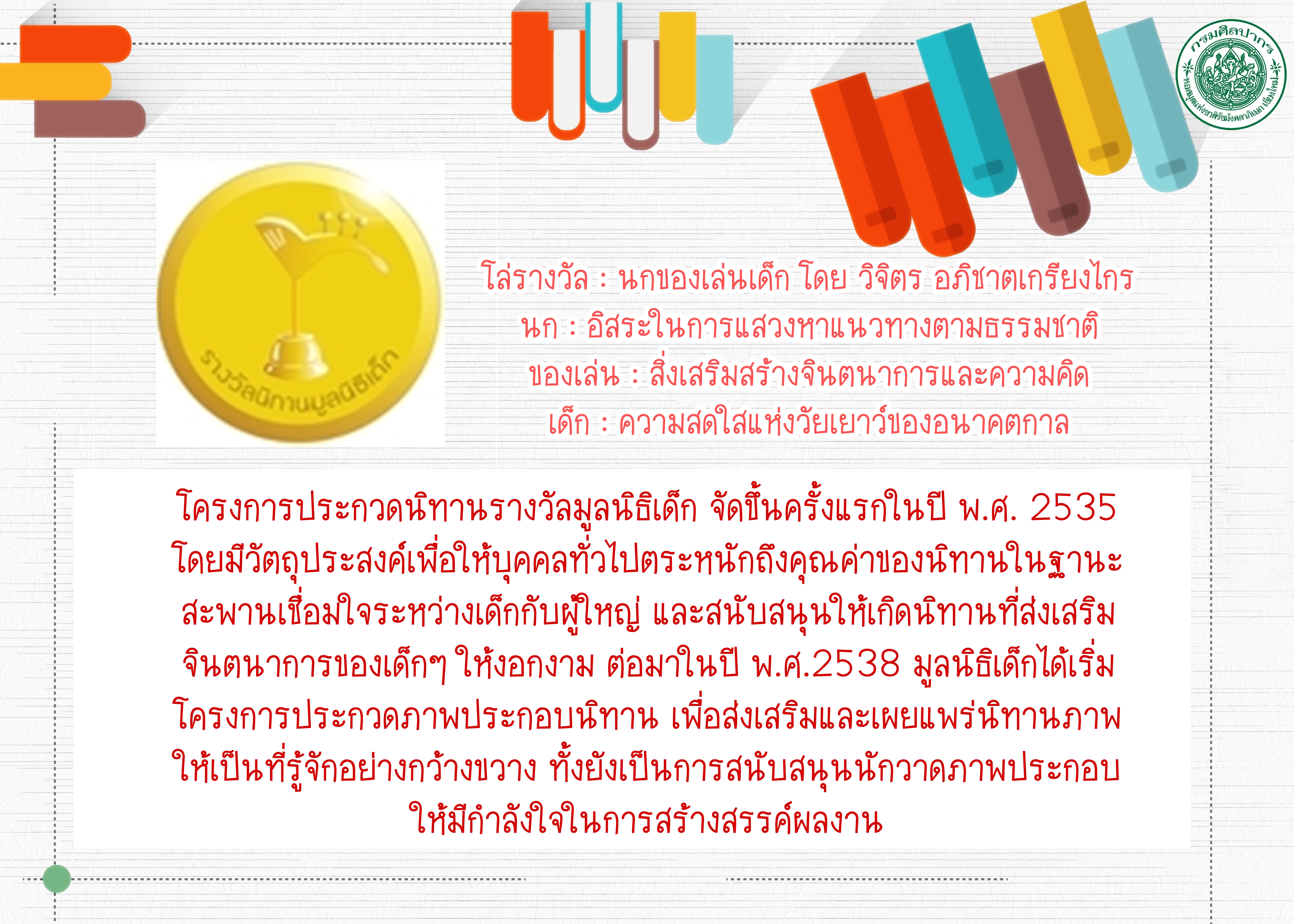 รายการหนังสือเด็กที่ได้รับรางวัล เช่น รางวัลมูลนิธิเด็ก รางวัลหนังสือดีเด่น รางวัลแว่นแก้ว ที่มีให้บริการในห้องหนังสือเด็กและเยาวชน หอสมุดแห่งชาติรัชมังคลาภิเษก เชียงใหม่