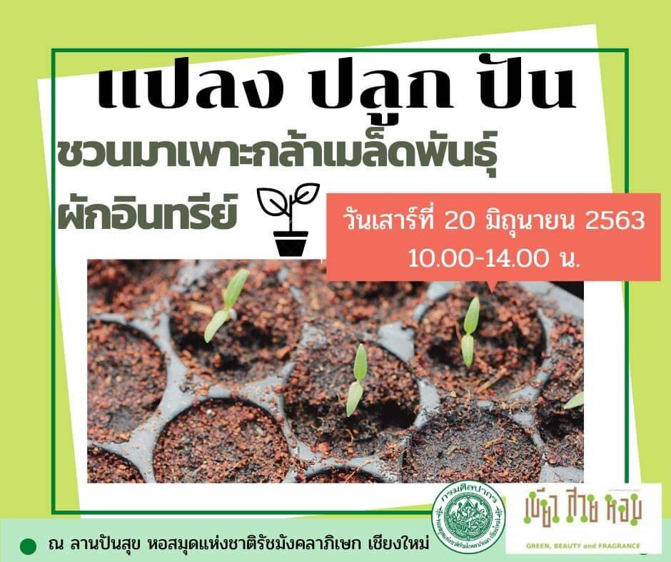 วันเสาร์ที่ ๒๐ มิถุนายน ๒๕๖๓ เวลา ๑๐.๐๐ - ๑๔.๐๐ น. เชียงใหม่ เขียว สวย หอม ร่วมกับหอสมุดแห่งชาติรัชมังคลาภิเษก เชียงใหม่ จัดกิจกรรมเรียนรู้ การปลูกพืชผักสวนครัวที่ปลอดภัยต่อสุขภาพ "แปลง ปลูก ปัน" มาเพาะกล้าเมล็ดพันธุ์ผักอินทรีย์ ซึ่งทางเรามีเมล็ดพันธุ์ผักสวนครัวหลากหลาย เช่น พริก มะเขือ คะน้า ผักบุ้ง ฯลฯ ให้คุณเพาะต้นกล้าด้วยตยเอง ณ ลานปันสุข หอสมุดแห่งชาติรัชมังคลาภิเษก เชียงใหม่