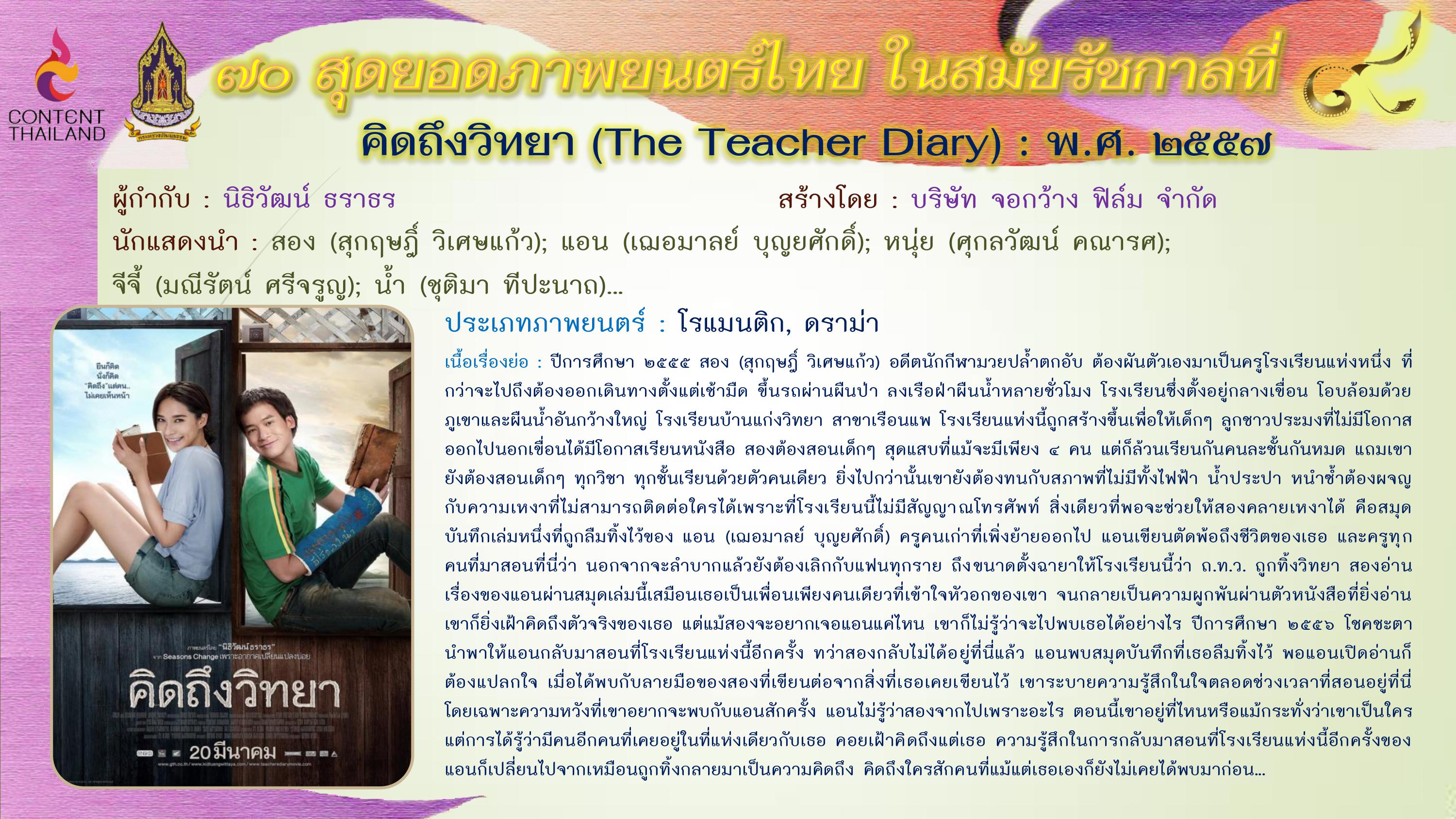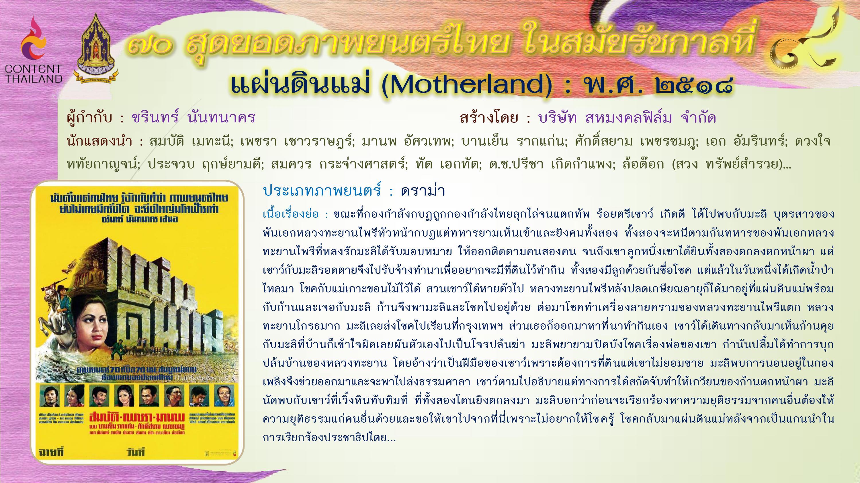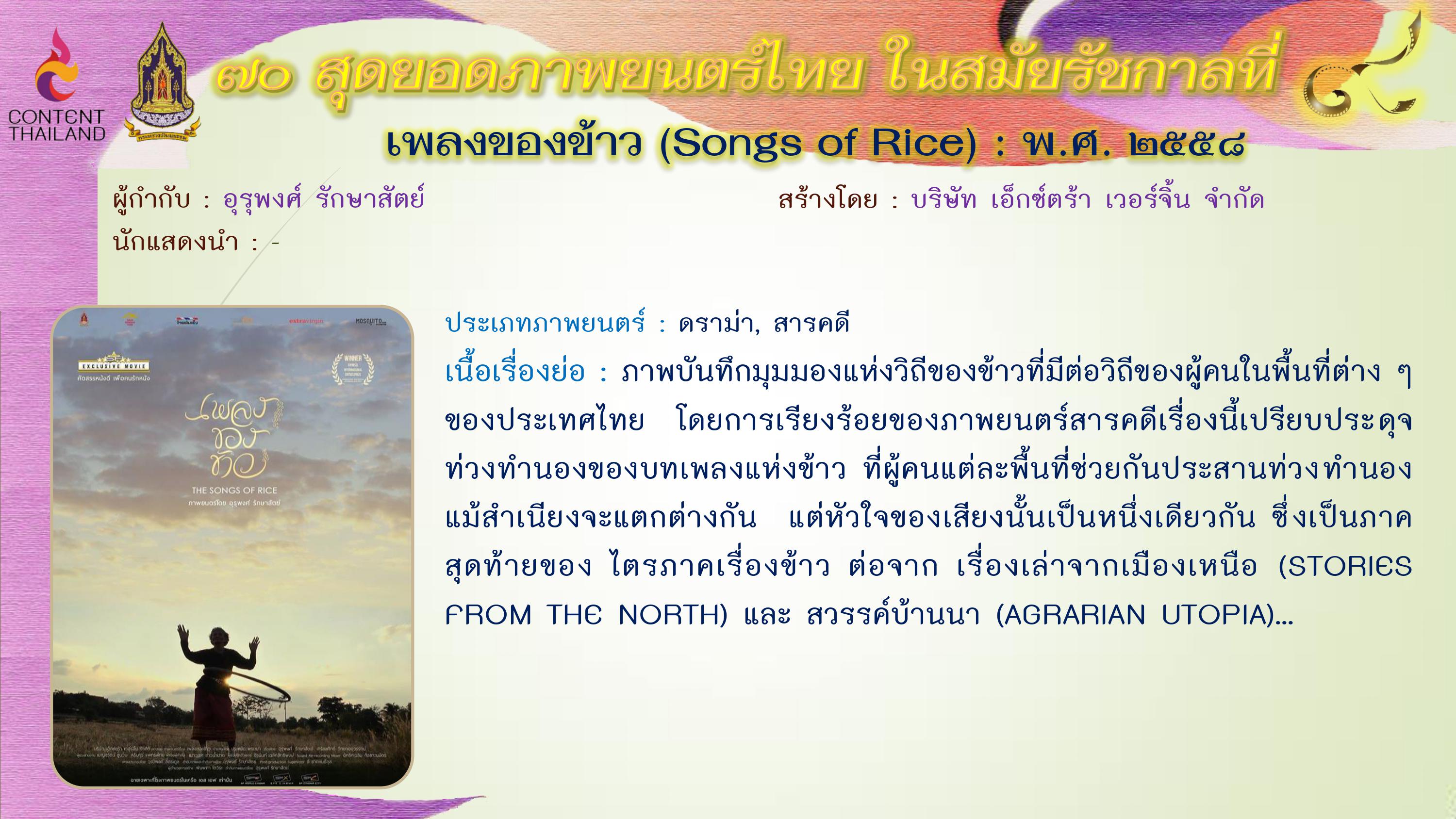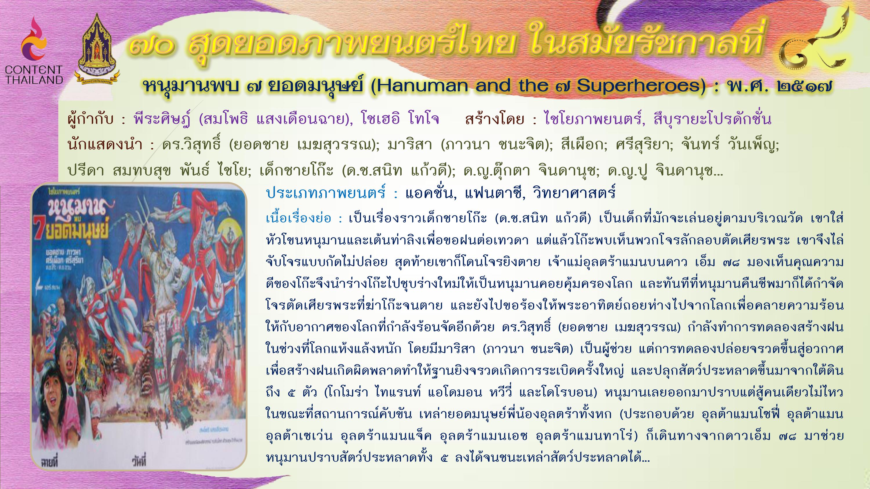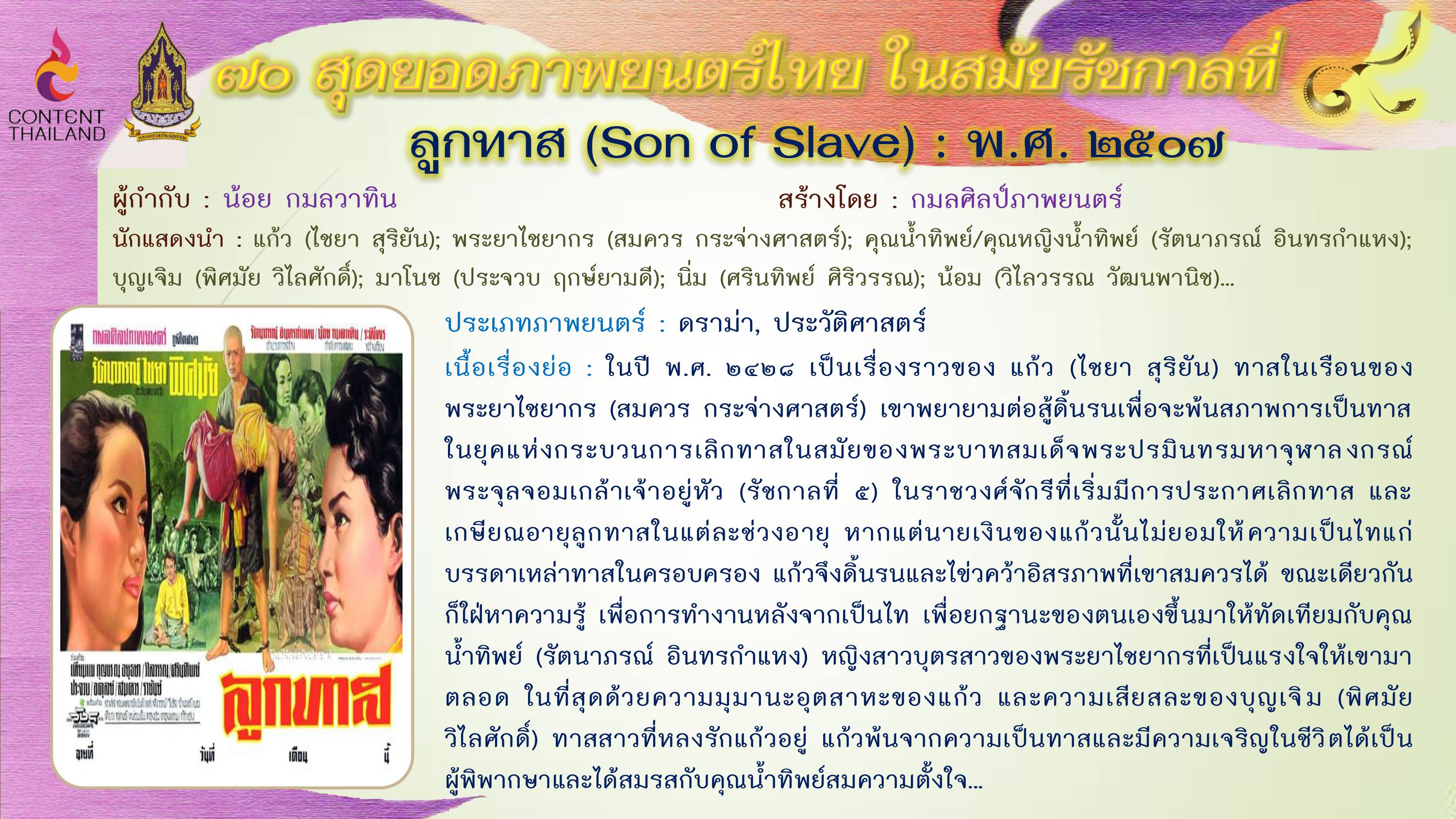 คณะกรรมการภาพยนตร์และวีดิทัศน์แห่งชาติกระทรวงวัฒนธรรมร่วมกับสมาพันธ์สมาคมภาพยนตร์แห่งชาติ ผู้ทรงคุณวุฒิด้านภาพยนตร์ และหน่วยงานที่เกี่ยวข้อง พิจารณาคัดเลือกและมีมติเห็นชอบรายชื่อภาพยนตร์ไทย ๗๐ เรื่อง เป็นสุดยอดภาพยนตร์ไทย ในสมัยรัชกาลที่ ๙ เพื่อน้อมรำลึกถึงพระมหากรุณาธิคุณอันหาที่สุดมิได้ ของพระบาทสมเด็จพระปรมินทรมหาภูมิพลอดุลยเดช บรมนาถบพิตร ที่ทรงมีต่อวงการภาพยนตร์ไทย
