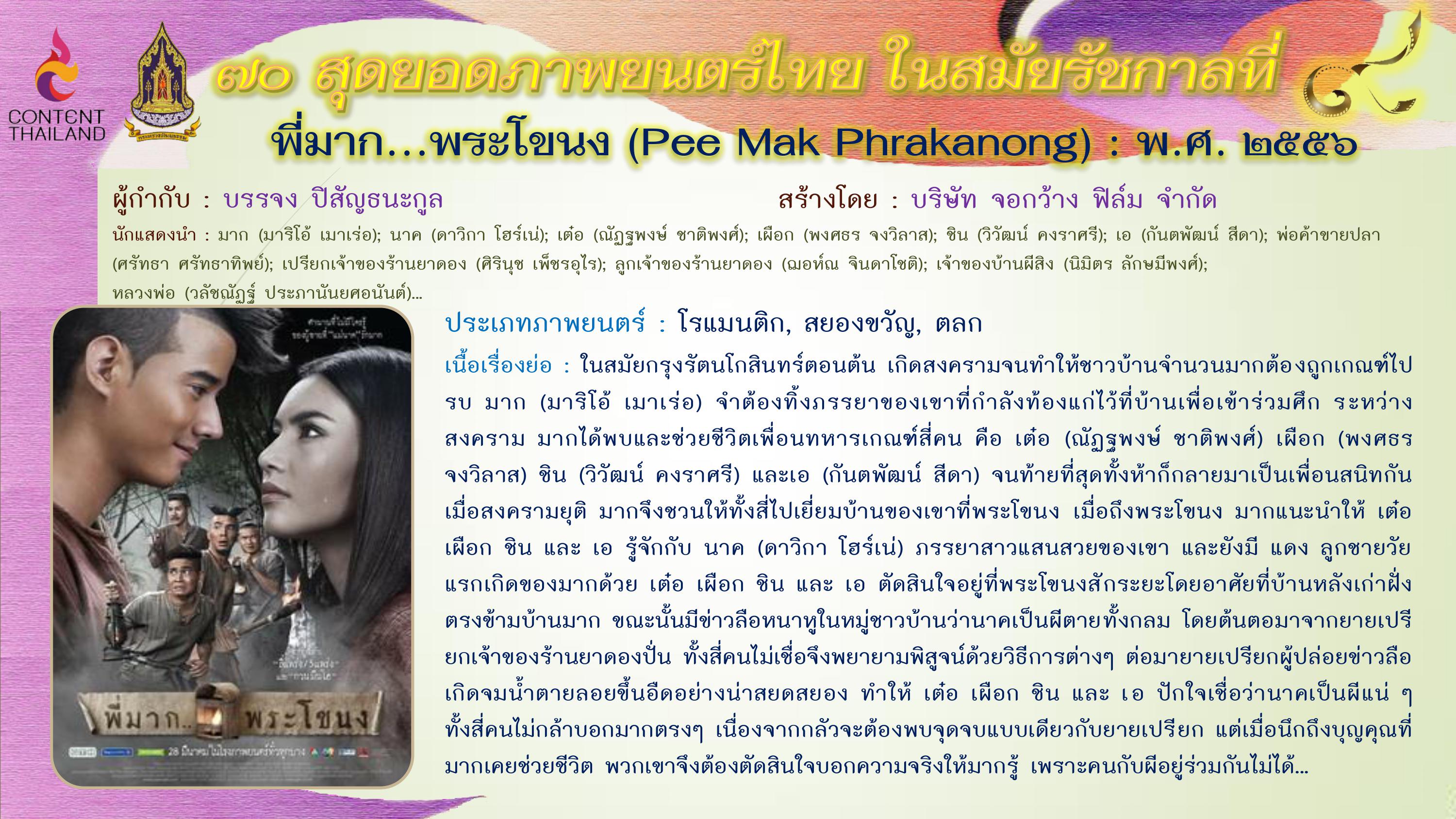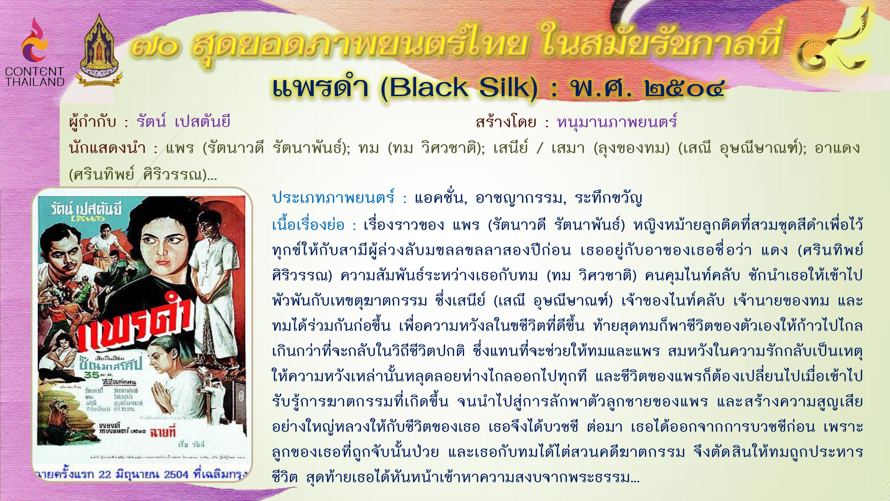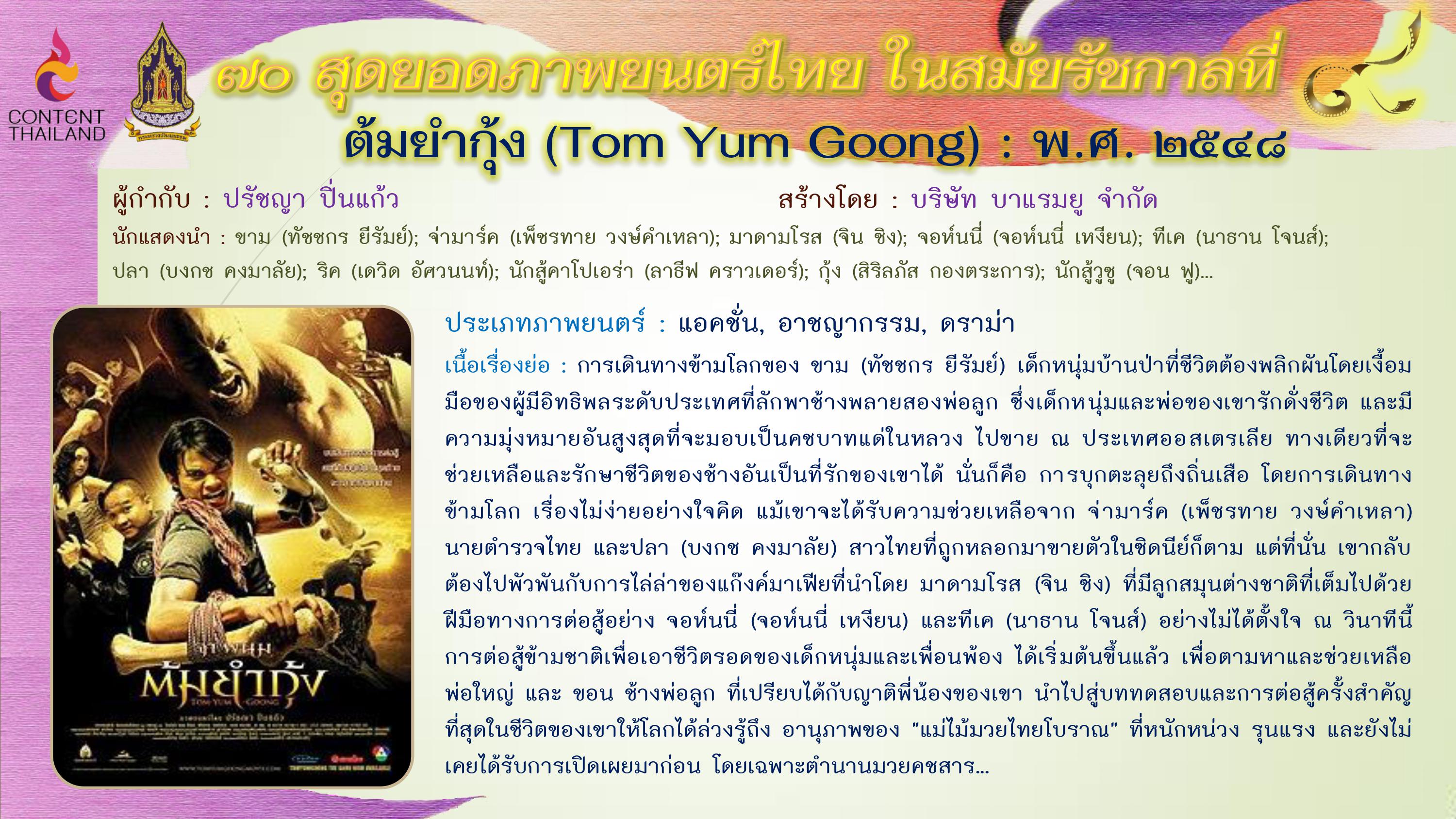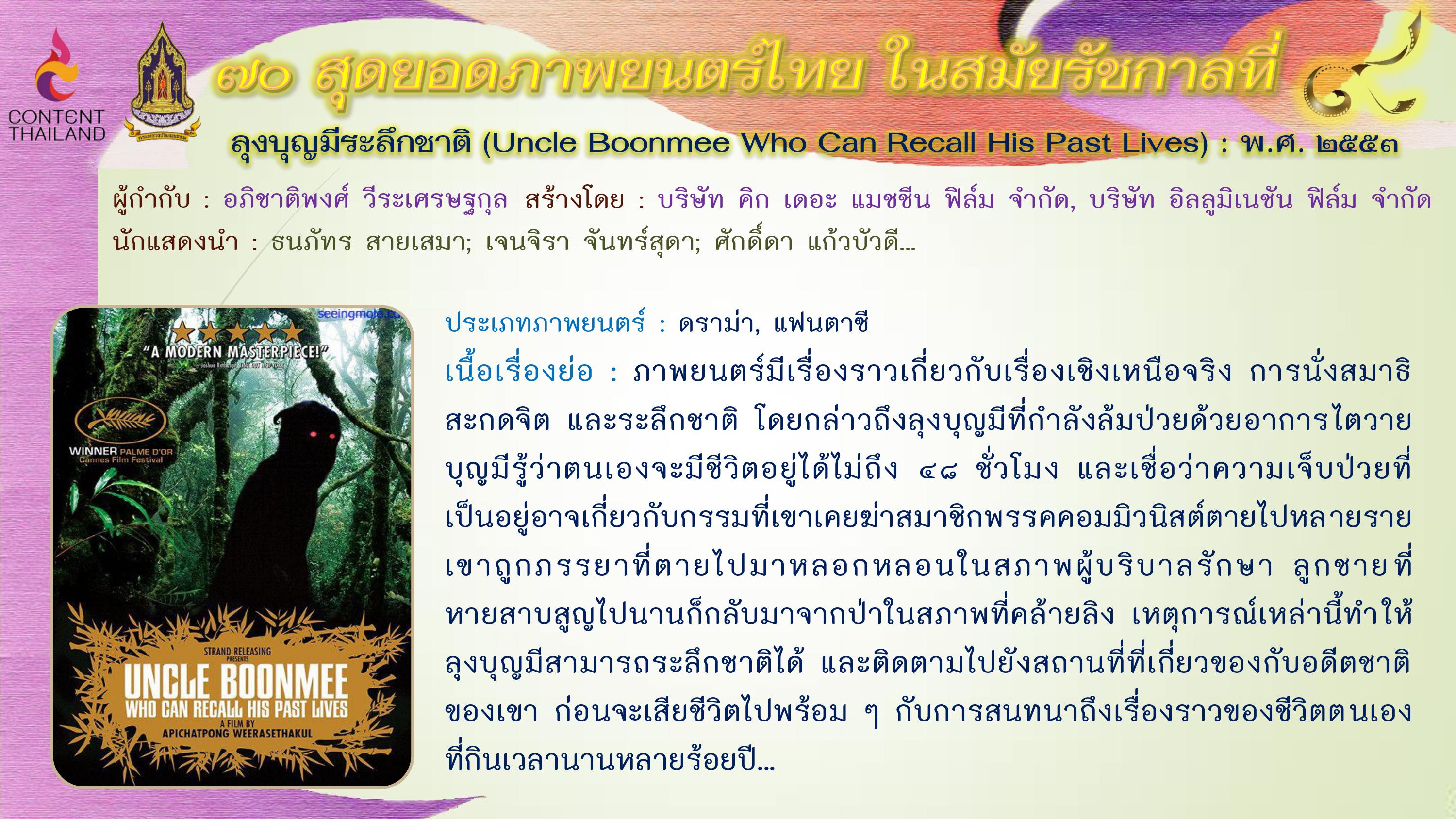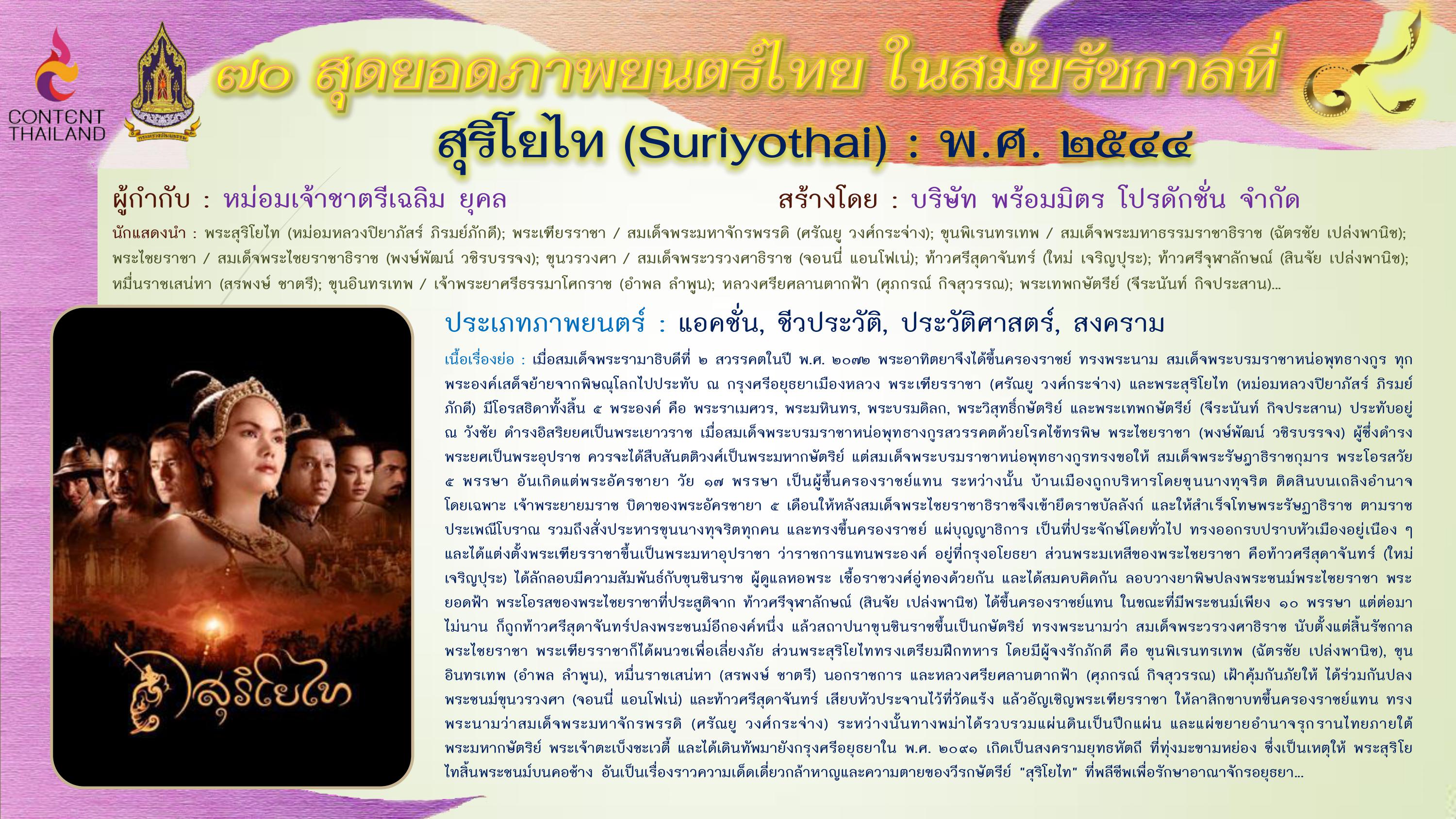 คณะกรรมการภาพยนตร์และวีดิทัศน์แห่งชาติกระทรวงวัฒนธรรมร่วมกับสมาพันธ์สมาคมภาพยนตร์แห่งชาติ ผู้ทรงคุณวุฒิด้านภาพยนตร์ และหน่วยงานที่เกี่ยวข้อง พิจารณาคัดเลือกและมีมติเห็นชอบรายชื่อภาพยนตร์ไทย ๗๐ เรื่อง เป็นสุดยอดภาพยนตร์ไทย ในสมัยรัชกาลที่ ๙ เพื่อน้อมรำลึกถึงพระมหากรุณาธิคุณอันหาที่สุดมิได้ ของพระบาทสมเด็จพระปรมินทรมหาภูมิพลอดุลยเดช บรมนาถบพิตร ที่ทรงมีต่อวงการภาพยนตร์ไทย