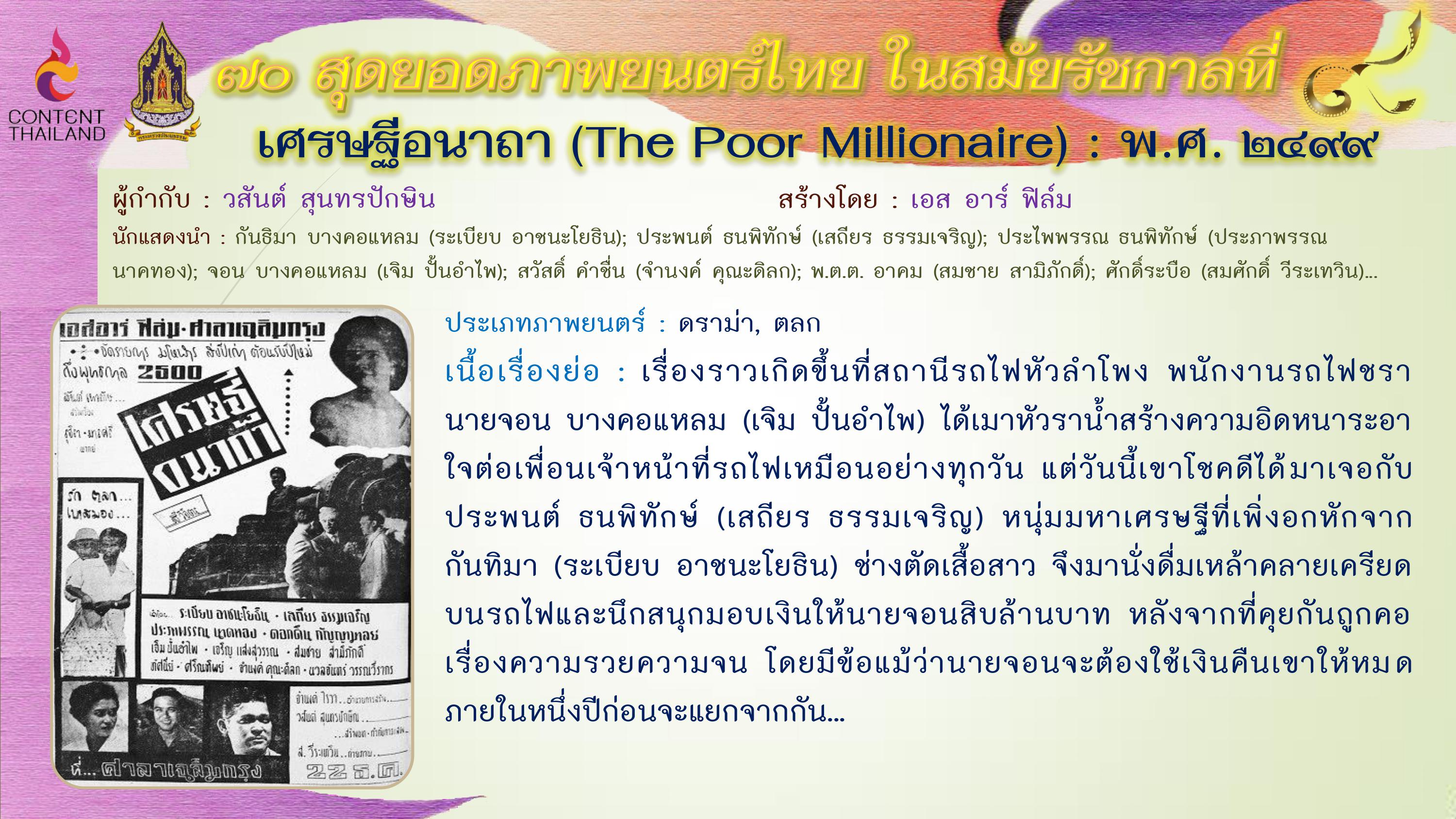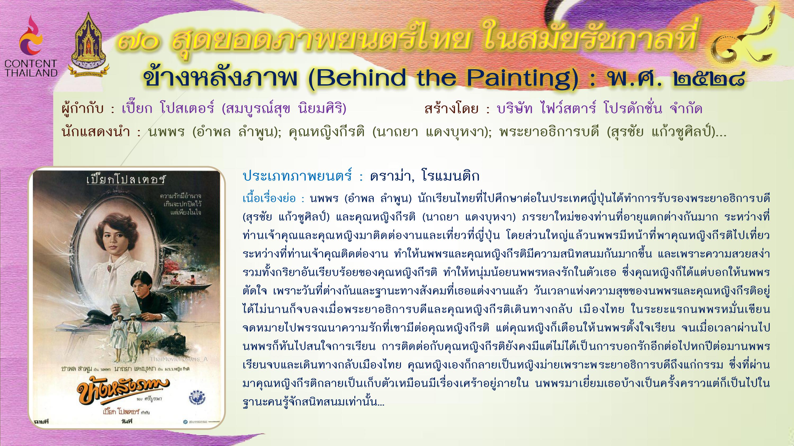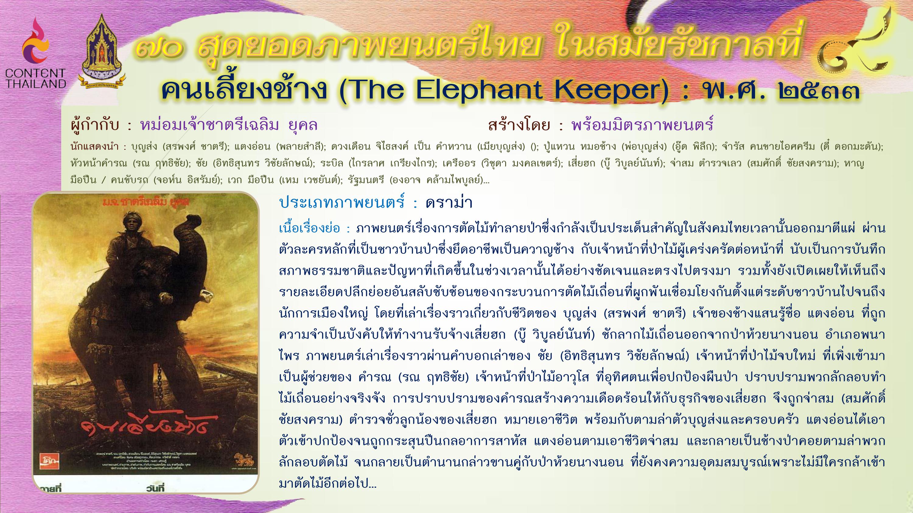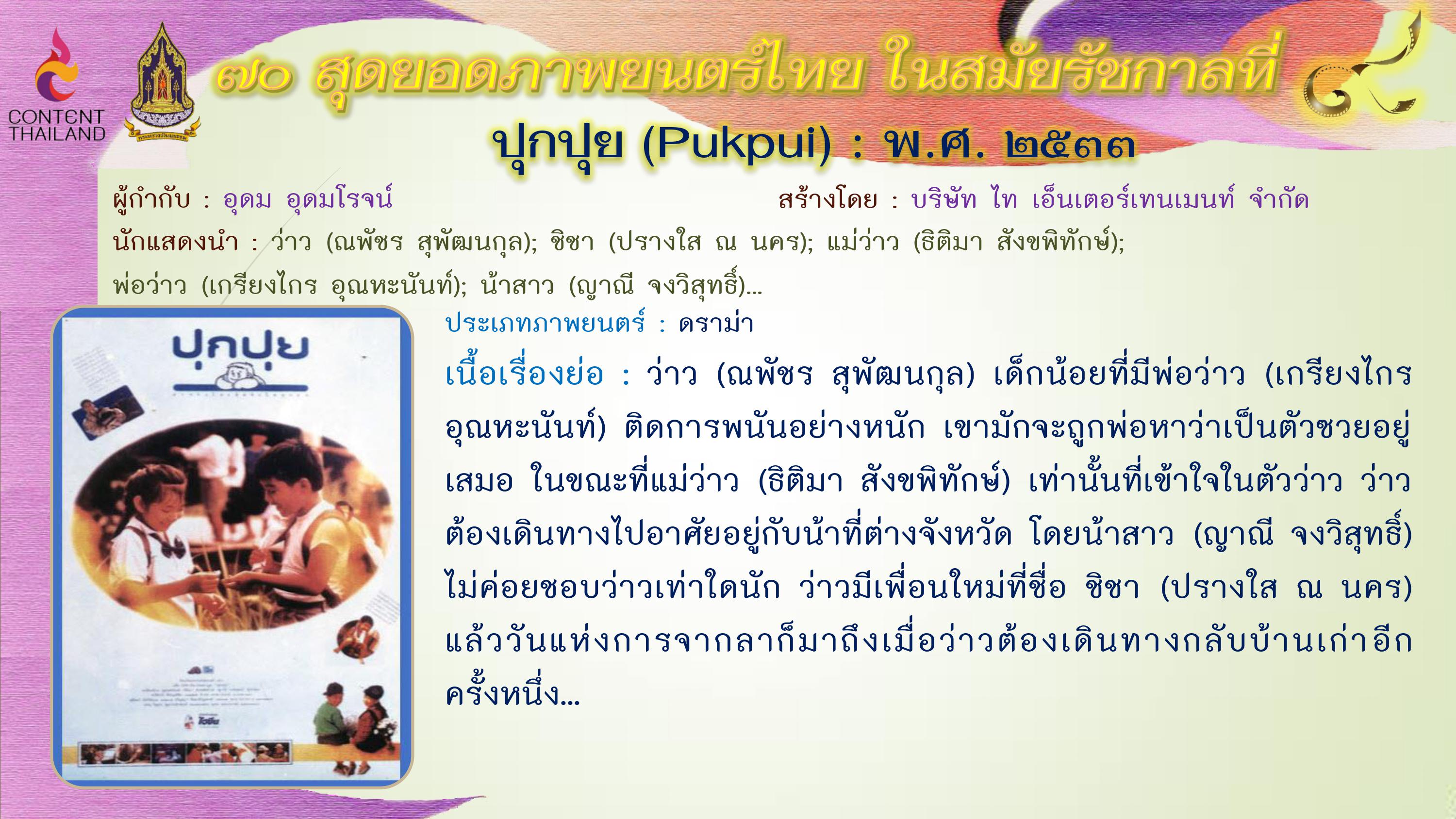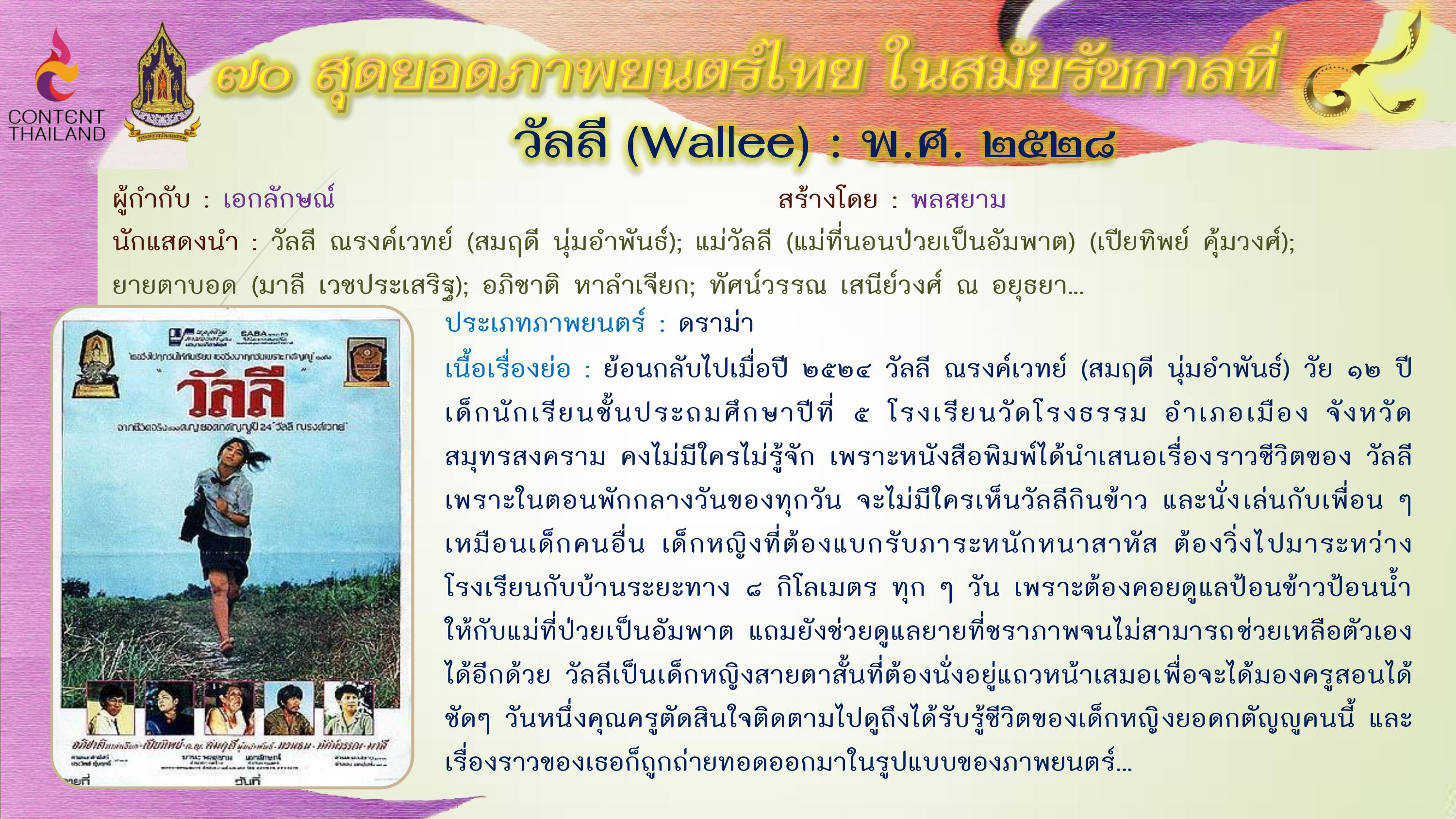 คณะกรรมการภาพยนตร์และวีดิทัศน์แห่งชาติกระทรวงวัฒนธรรมร่วมกับสมาพันธ์สมาคมภาพยนตร์แห่งชาติ ผู้ทรงคุณวุฒิด้านภาพยนตร์ และหน่วยงานที่เกี่ยวข้อง พิจารณาคัดเลือกและมีมติเห็นชอบรายชื่อภาพยนตร์ไทย ๗๐ เรื่อง เป็นสุดยอดภาพยนตร์ไทย ในสมัยรัชกาลที่ ๙ เพื่อน้อมรำลึกถึงพระมหากรุณาธิคุณอันหาที่สุดมิได้ ของพระบาทสมเด็จพระปรมินทรมหาภูมิพลอดุลยเดช บรมนาถบพิตร ที่ทรงมีต่อวงการภาพยนตร์ไทย